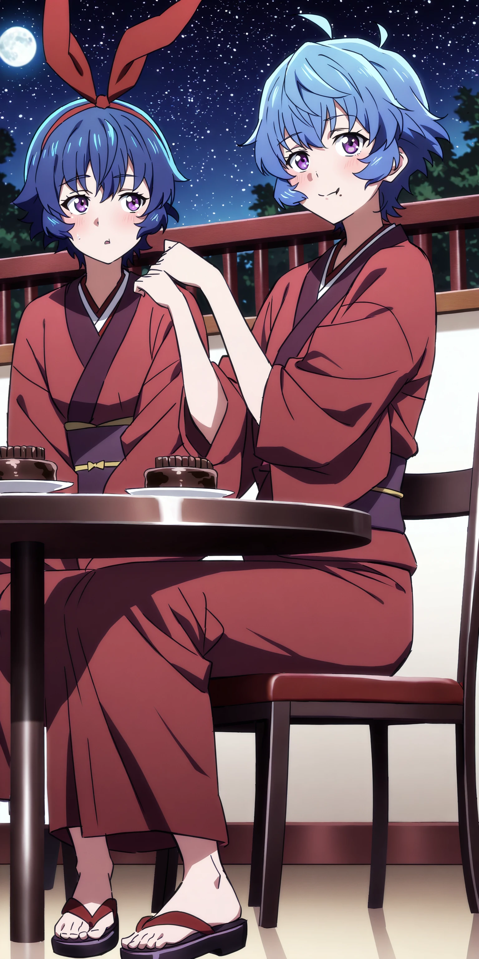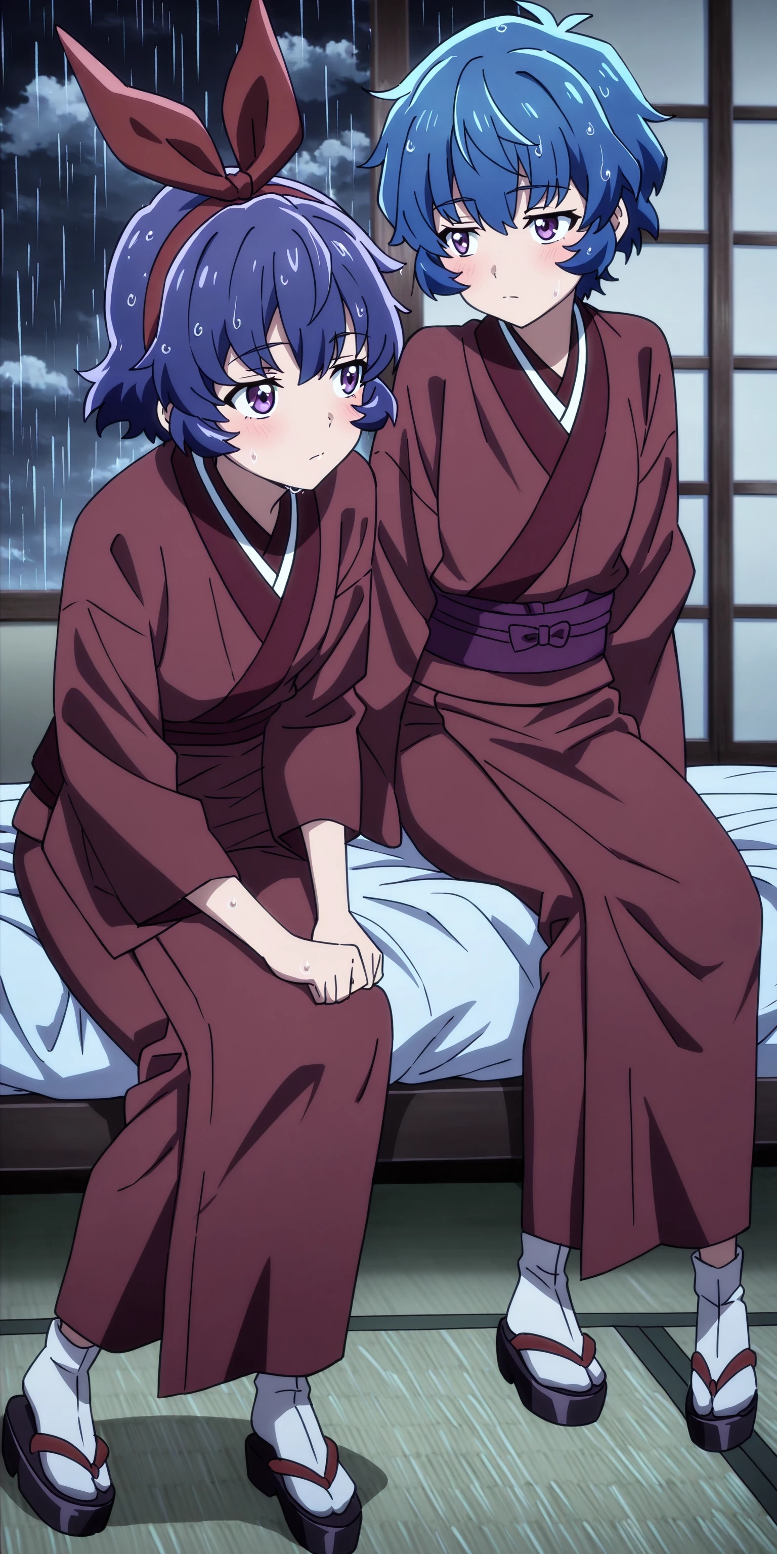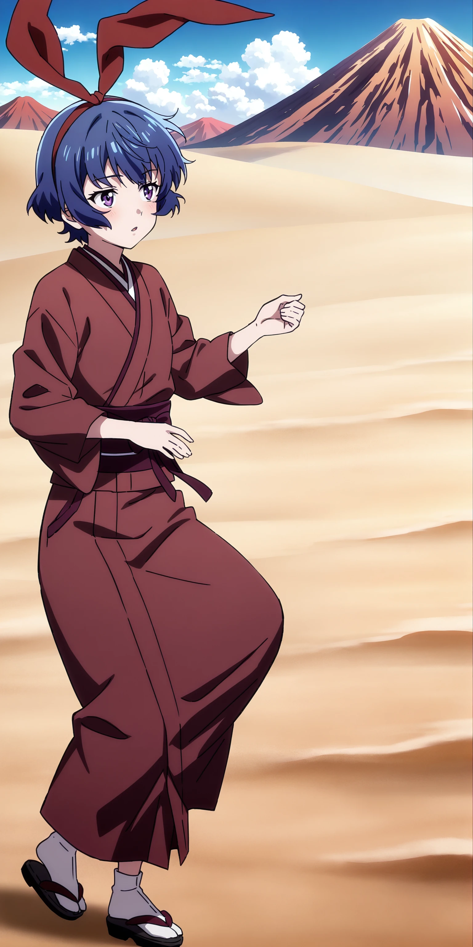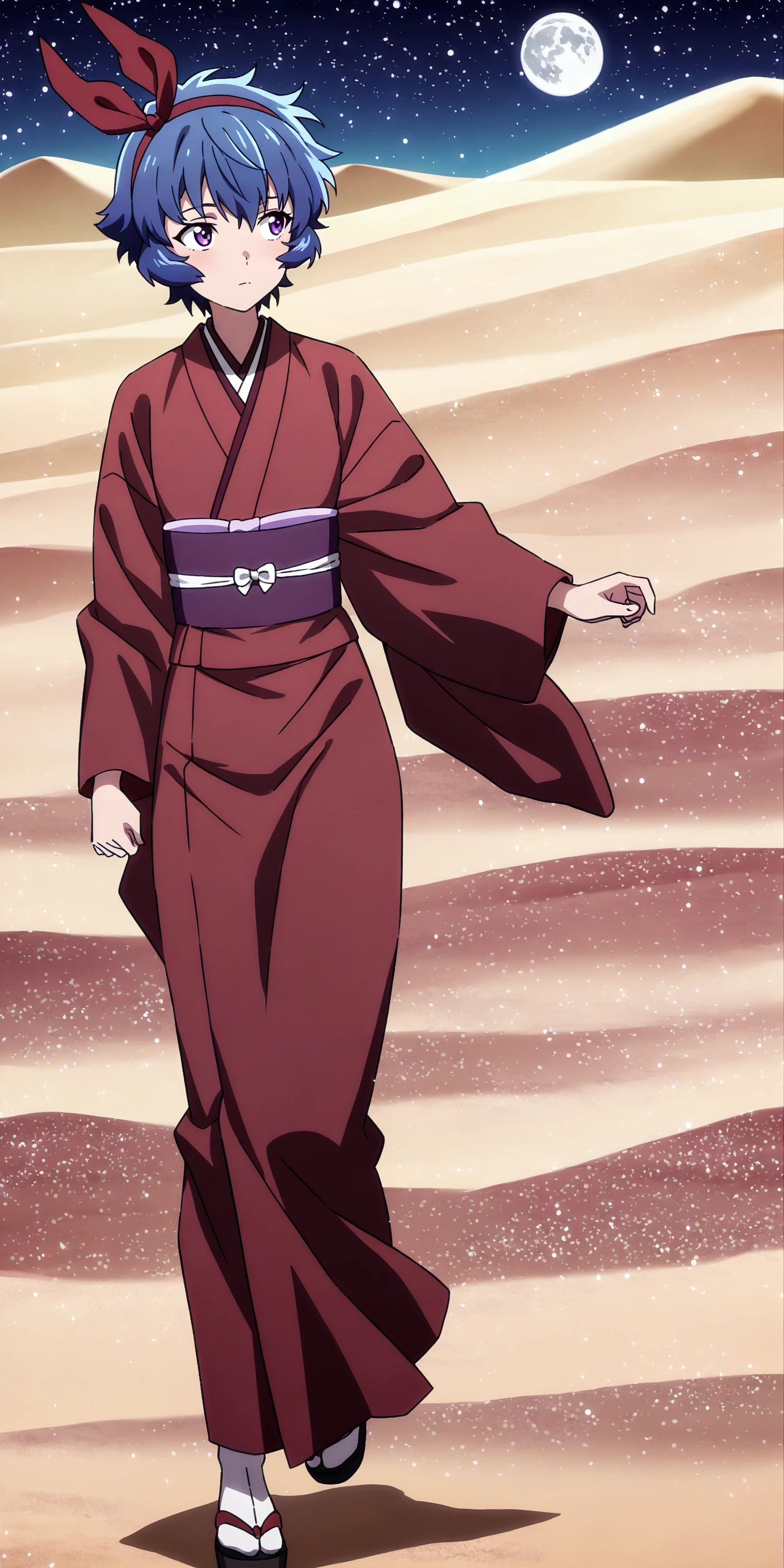 short hair, ribbon, blue hair, purple eyes, hair ribbon, japanese clothes, kimono,