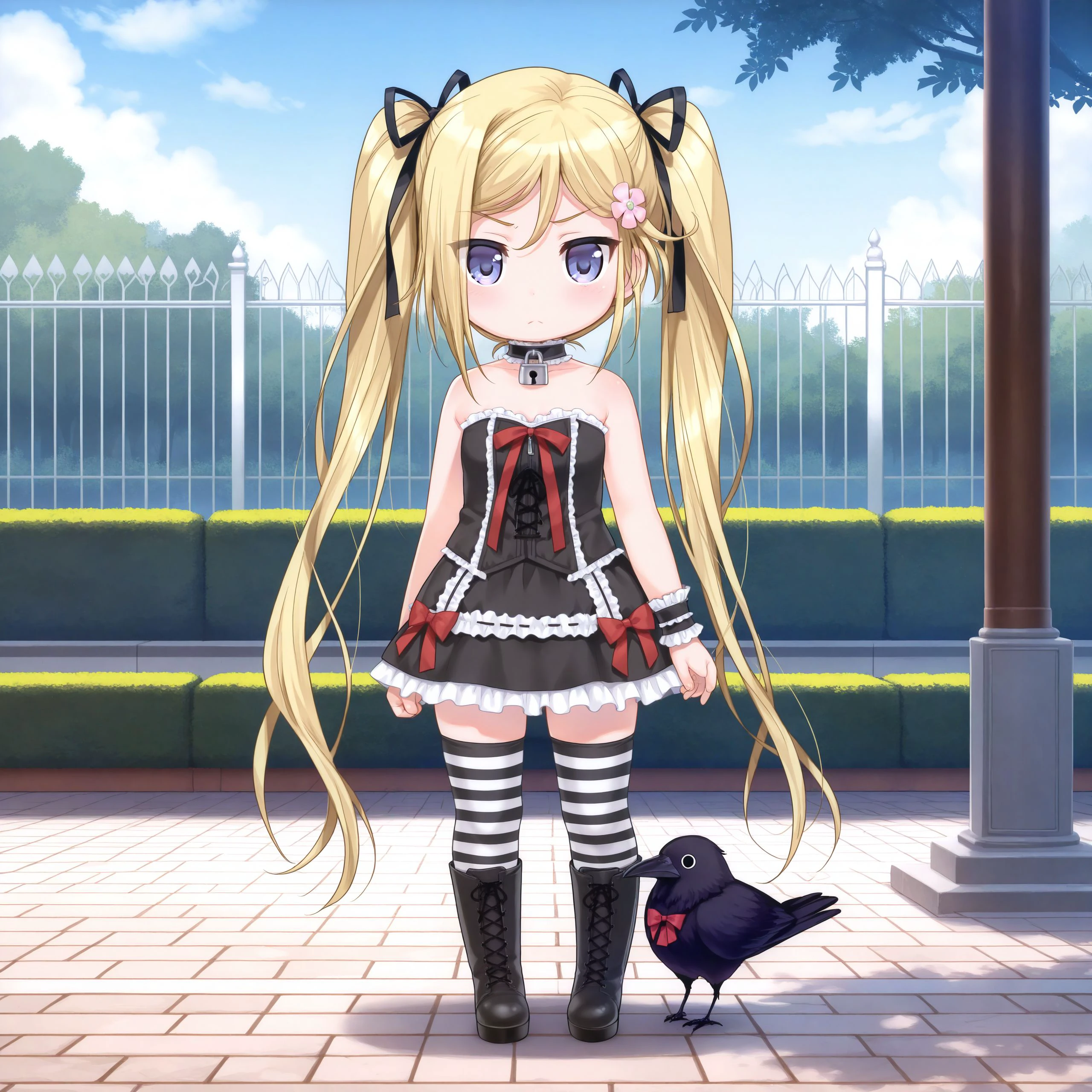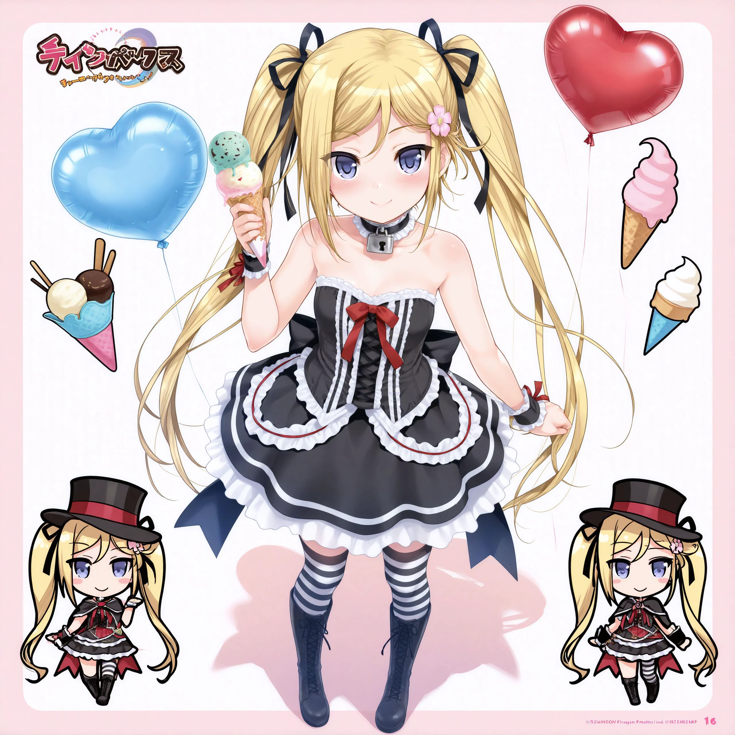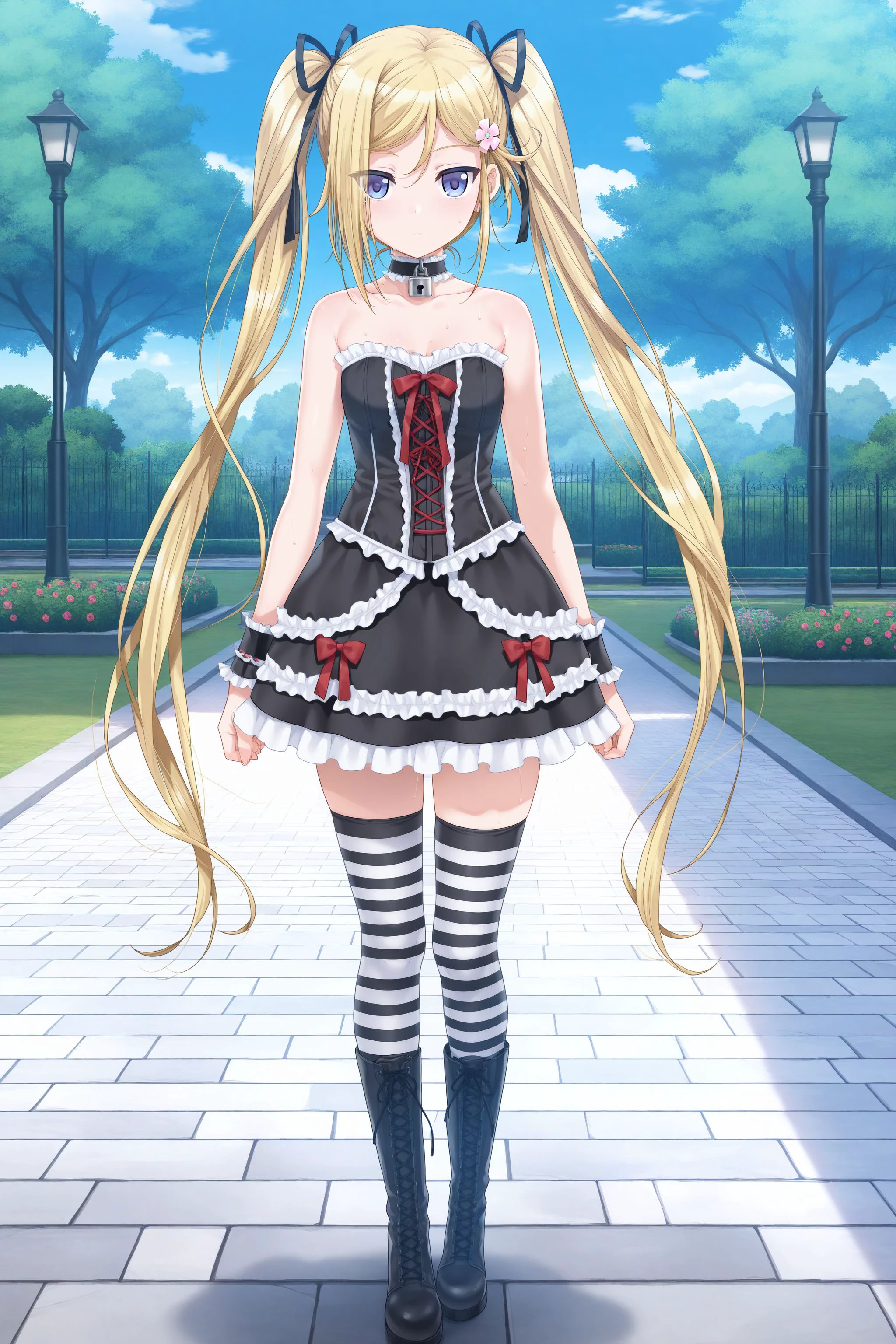 casual: lolita fashion, bare shoulders, boots, choker, dress, miniskirt, wrist_cuffs, ribbon, stlapless, striped thighhighs, cross-laced footwear, lock