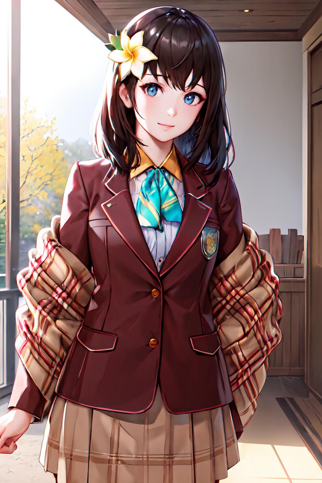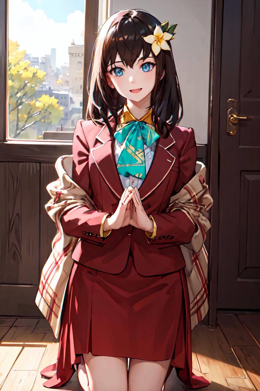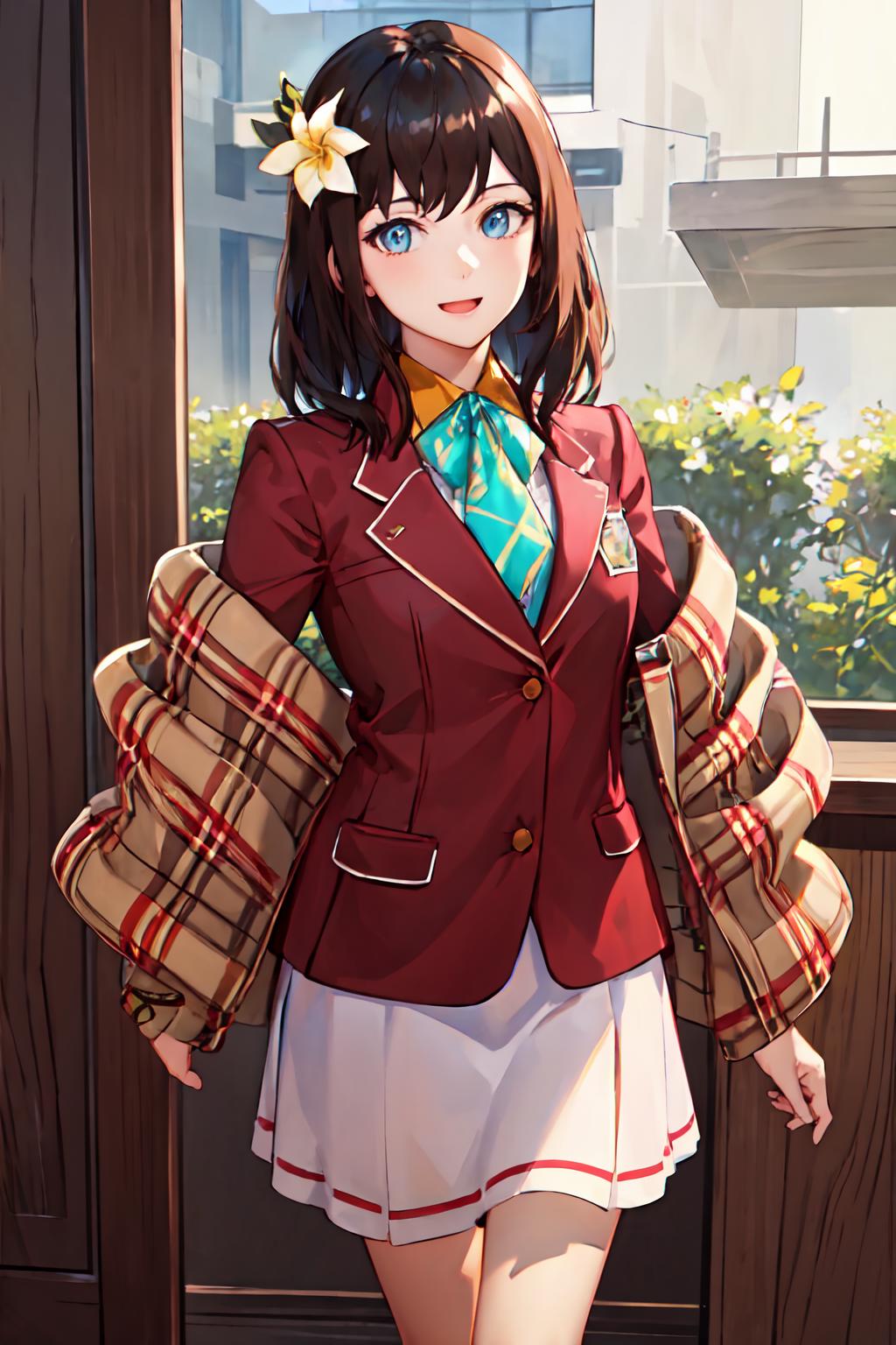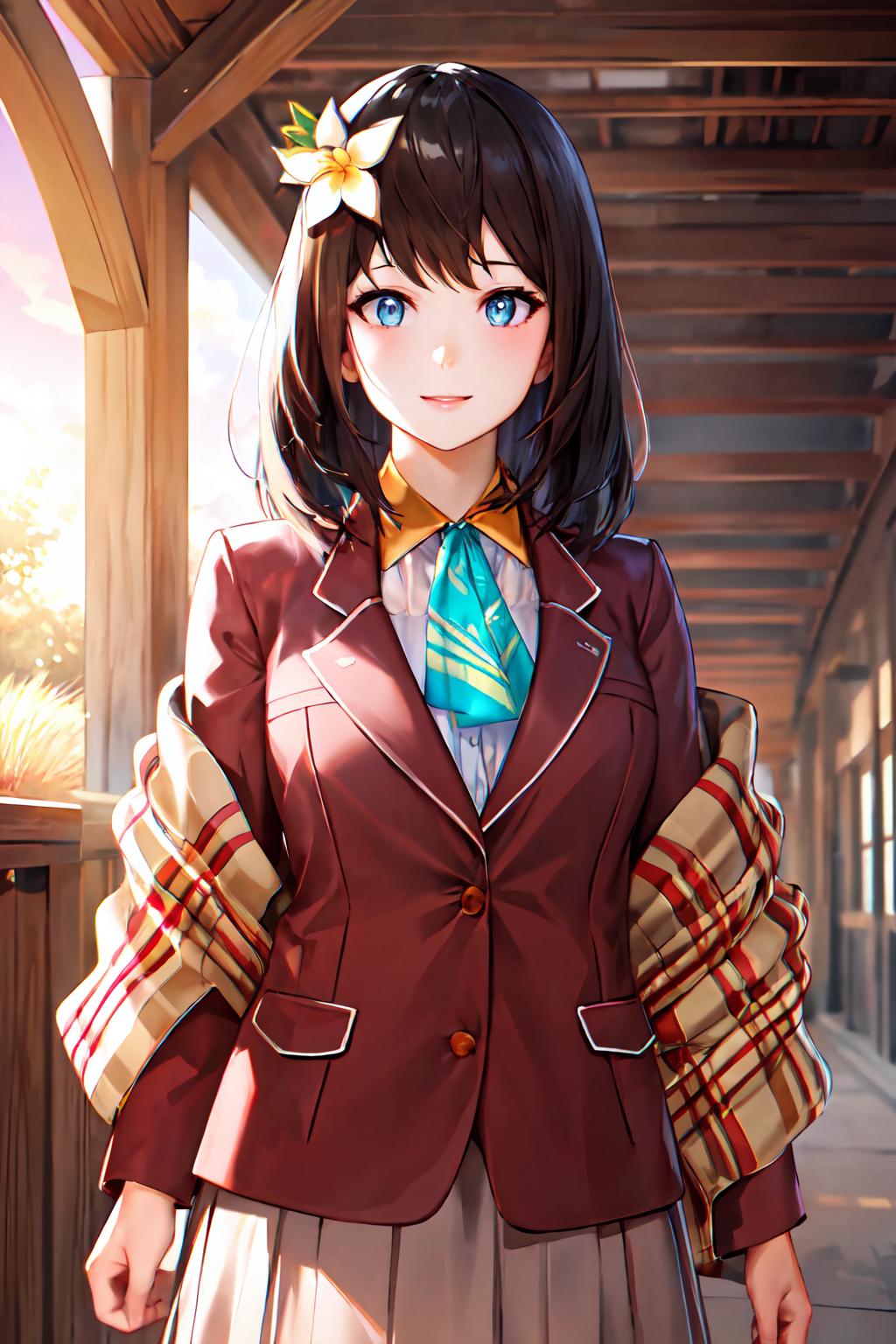 brown hair, shirt, hair ornament, closed mouth, jacket, white shirt, flower, collared shirt, indoors, hair flower, medium hair, scarf, plaid, blazer, white flower, red jacket, brown jacket , long skirt,