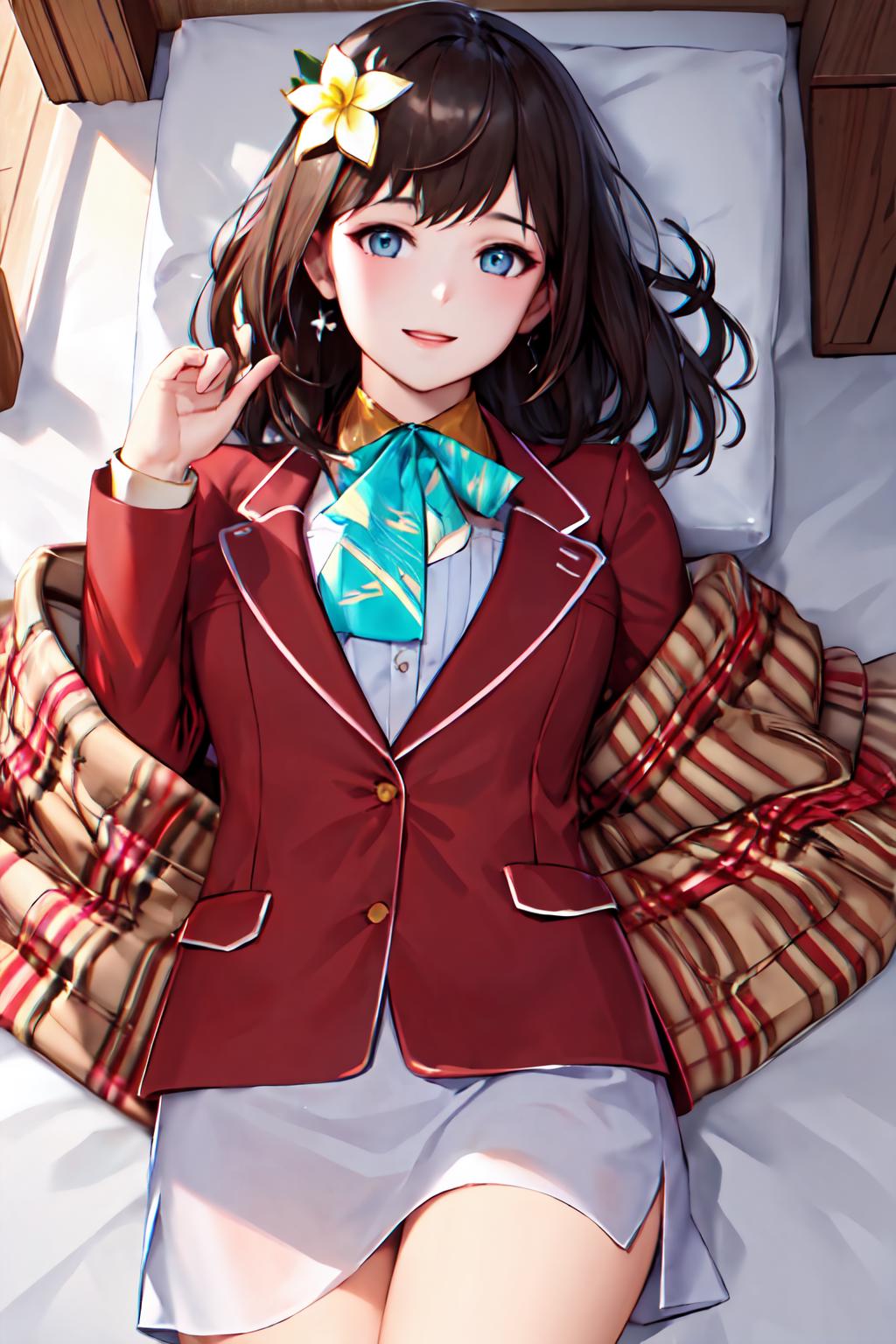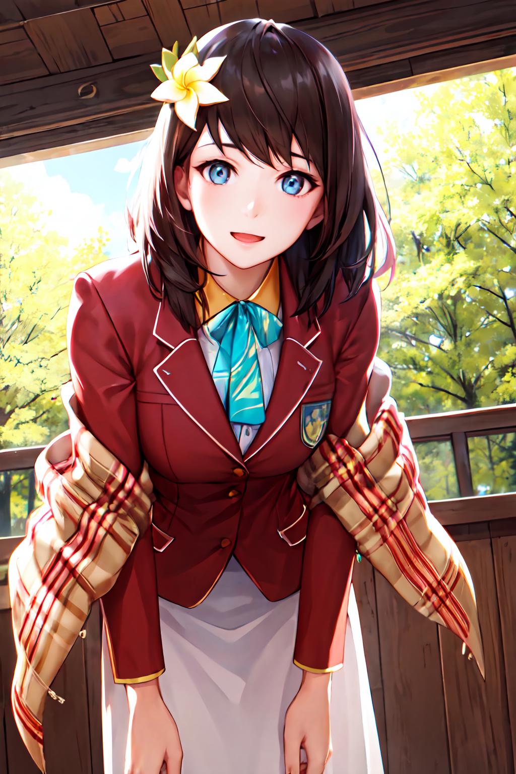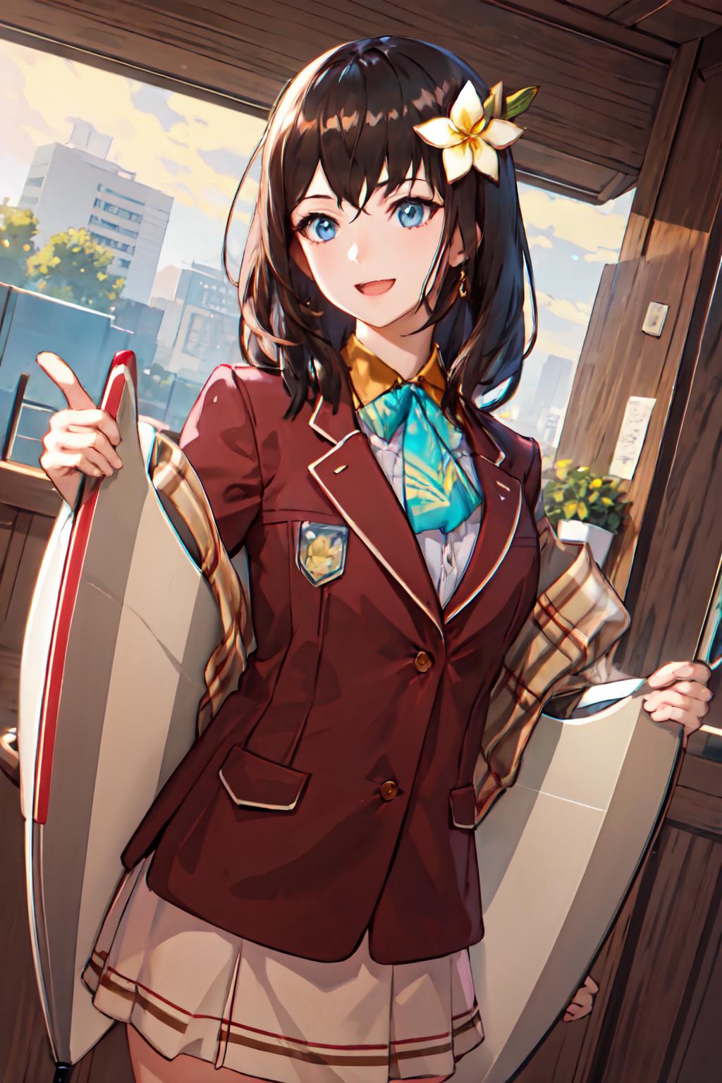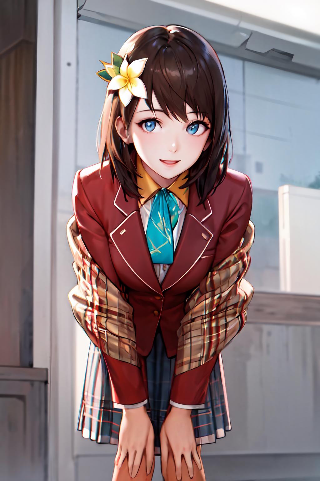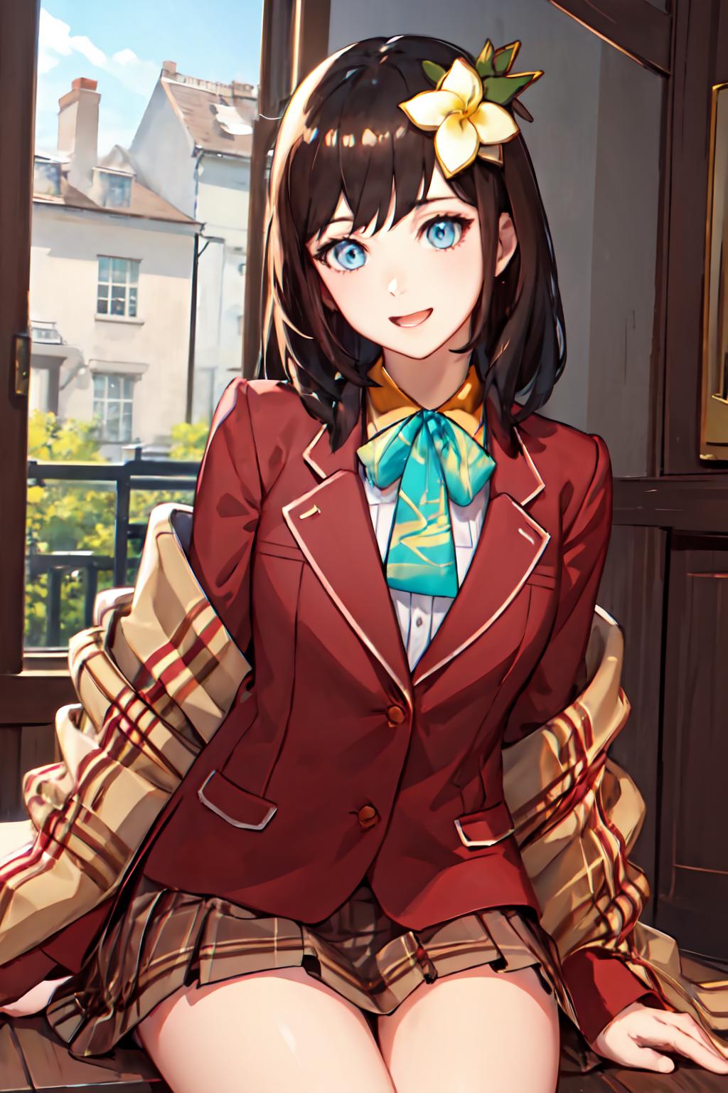 brown hair, shirt, hair ornament, closed mouth, jacket, white shirt, flower, collared shirt, indoors, hair flower, medium hair, scarf, plaid, blazer, white flower, red jacket, brown jacket , long skirt,