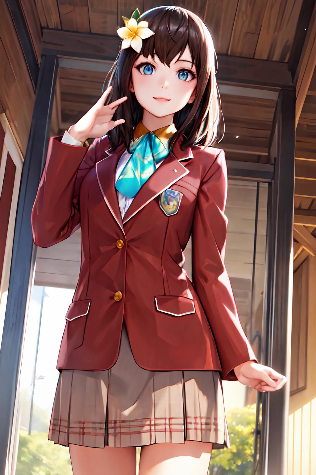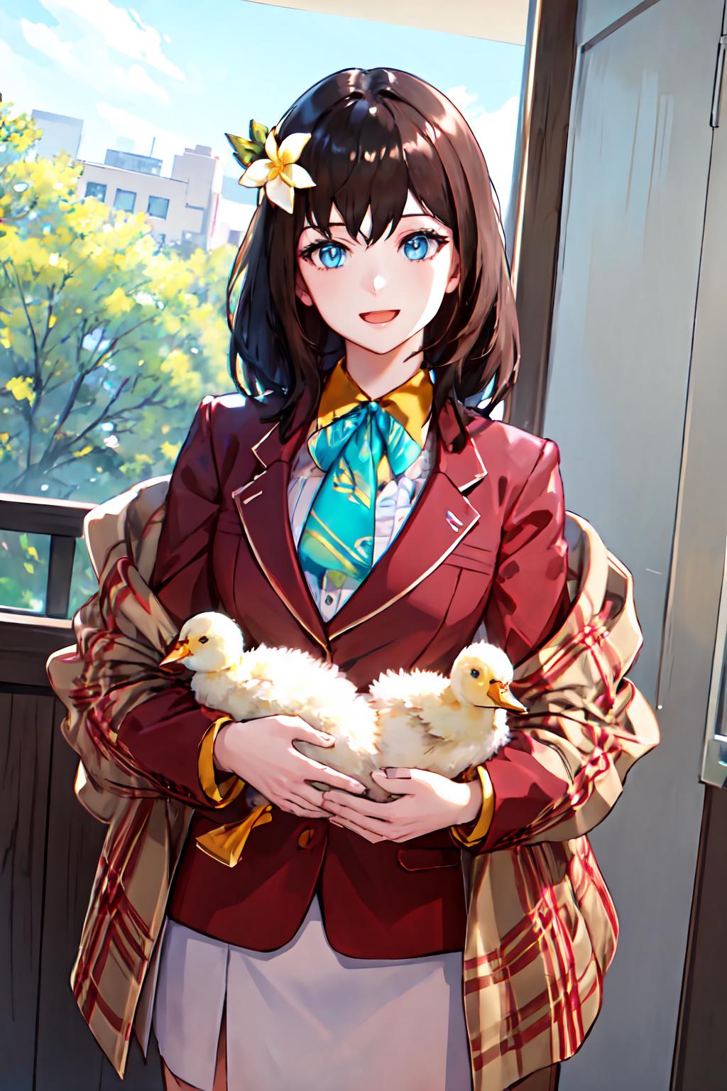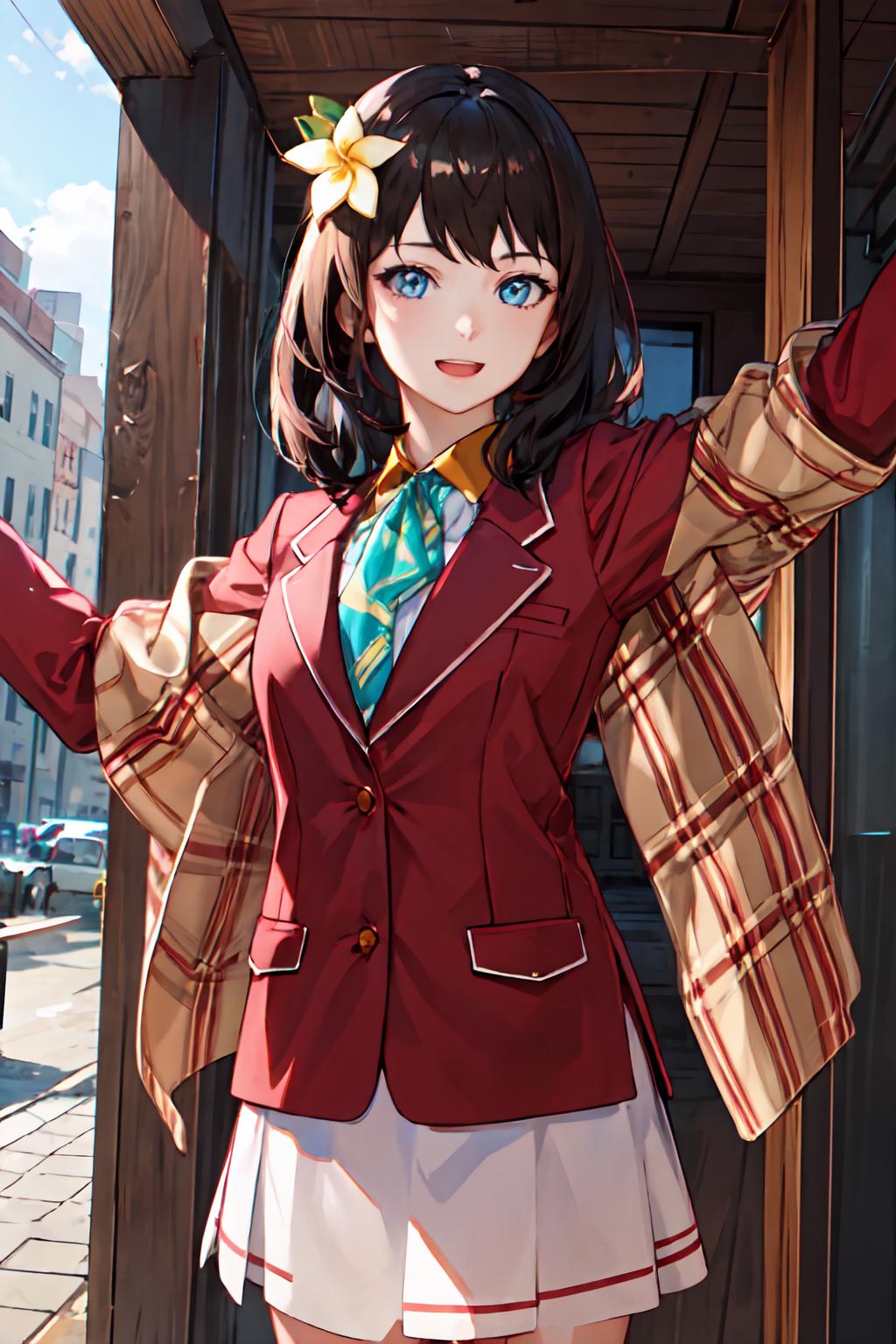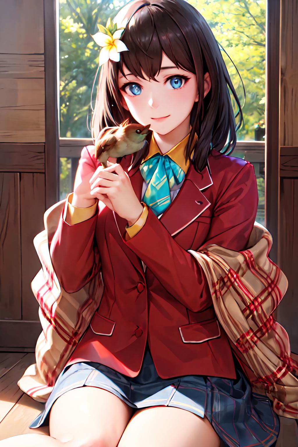 brown hair, shirt, hair ornament, closed mouth, jacket, white shirt, flower, collared shirt, indoors, hair flower, medium hair, scarf, plaid, blazer, white flower, red jacket, brown jacket , long skirt,