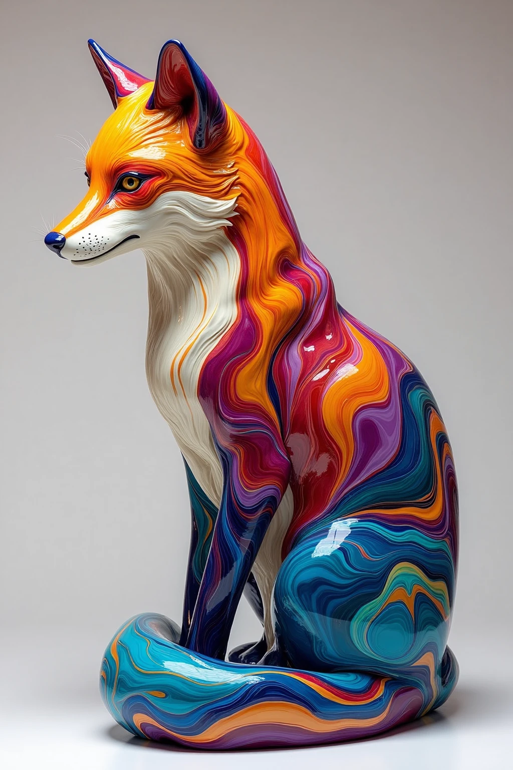 Colorful and with a fluid art sculpture style, craft a mysterious fox. Hues swirl in its fur, creating an enchanting aura, blending wildness and artistic fluidity.