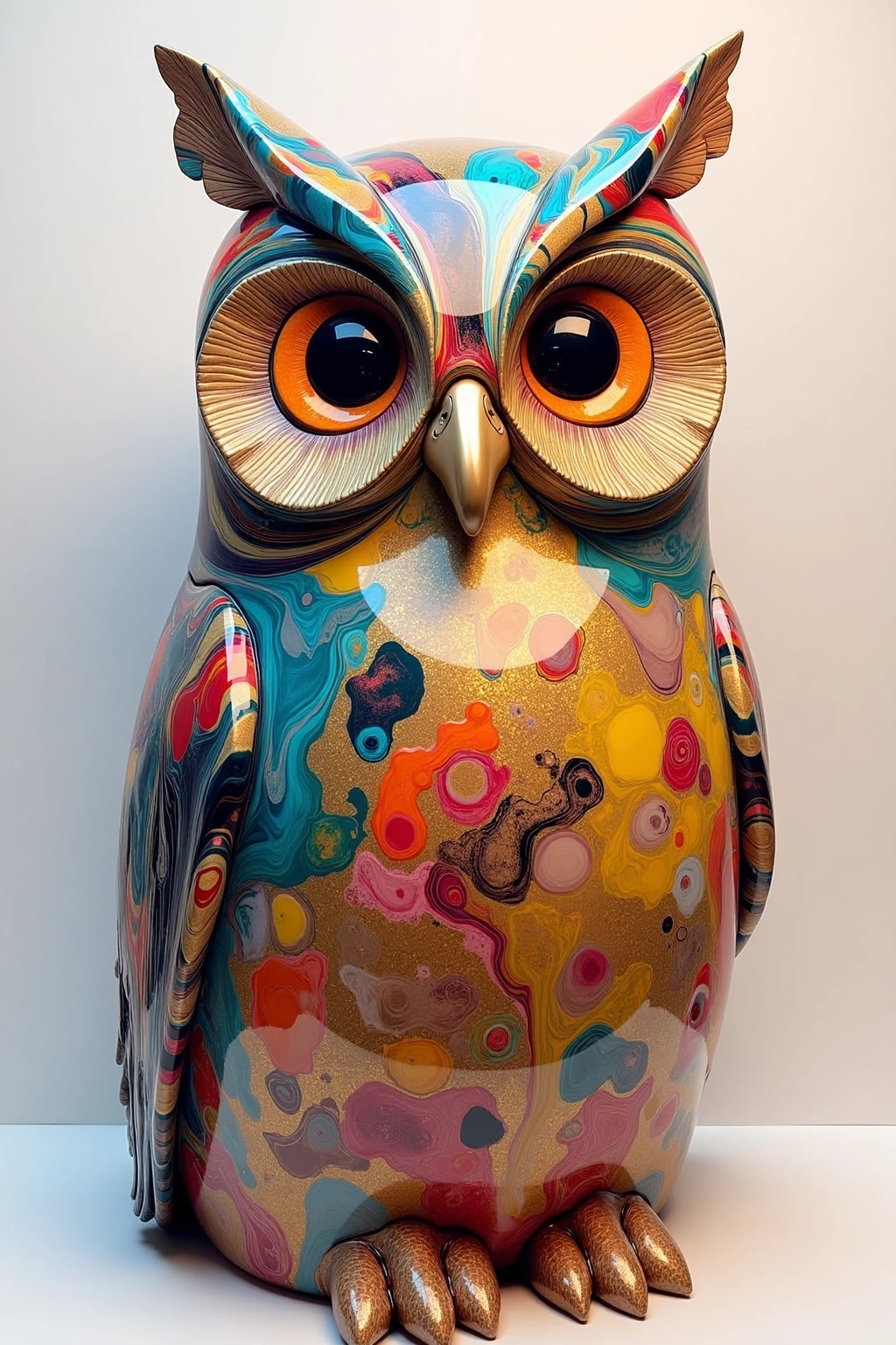 Colorful and with a fluid art sculpture style, forge a wise owl. Muted and bold hues mix, forming its wise gaze, blending artistry and mystique.