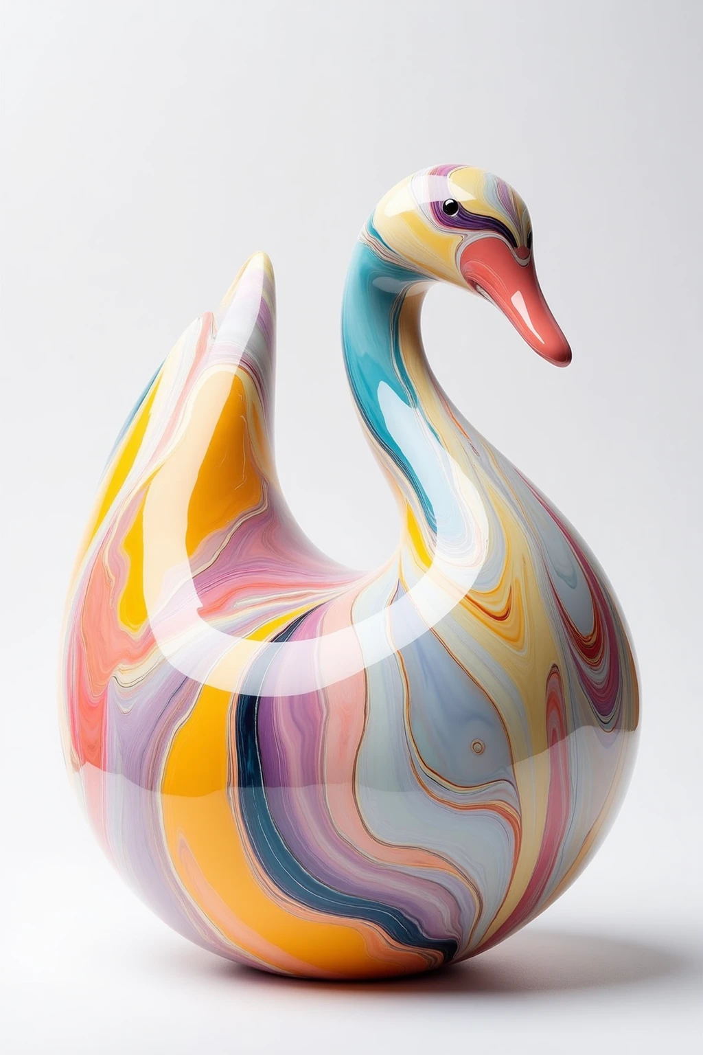 Colorful and with a fluid art sculpture style, form a graceful swan. Pastel colors blend smoothly, creating a serene figure, symbolizing beauty and fluid art.