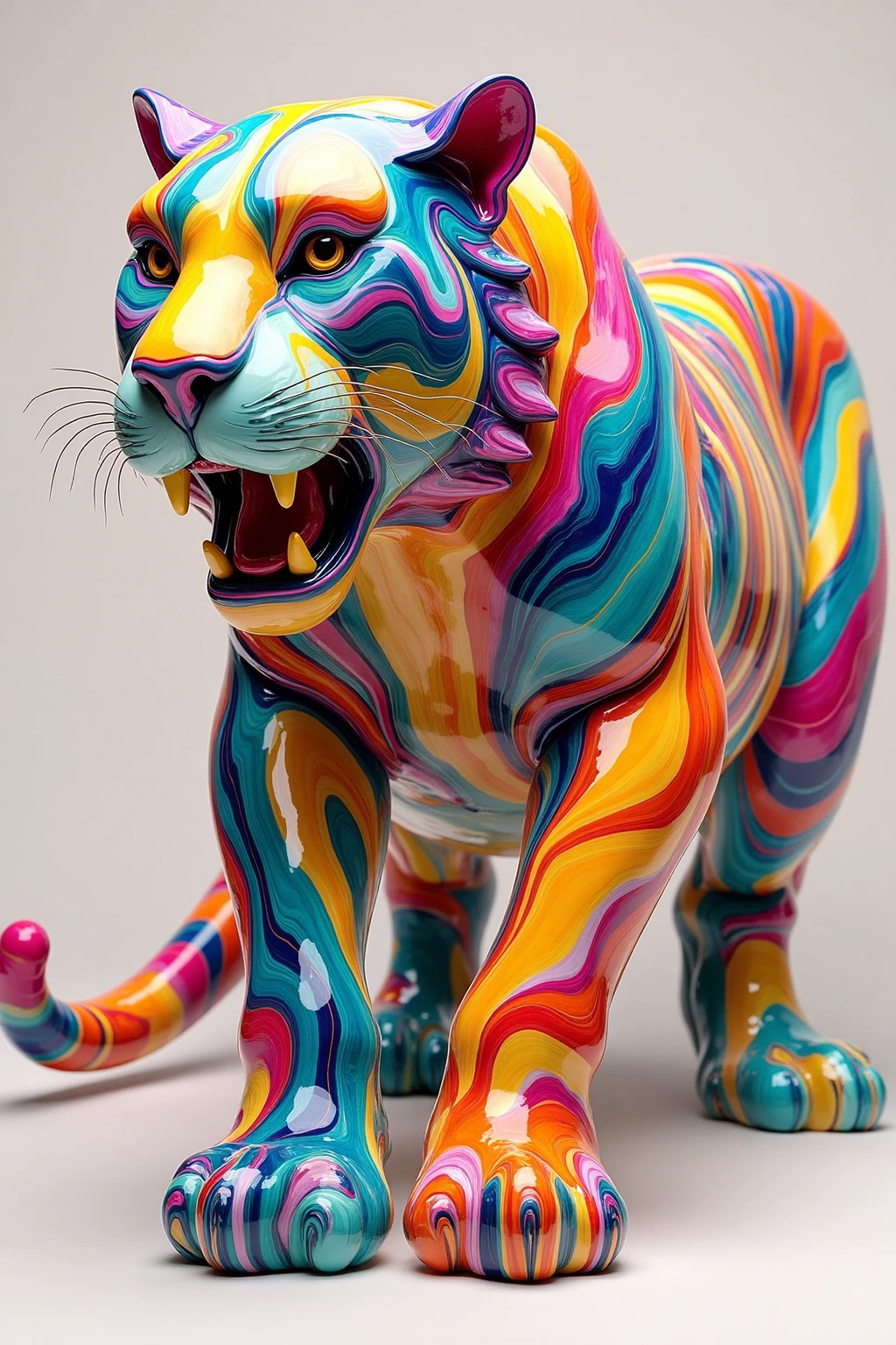 Colorful and with a fluid art sculpture style, build a fierce tiger. Bold colors clash and flow, defining its powerful stance, a mix of strength and artistry.