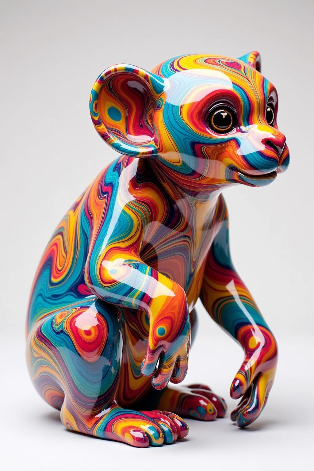 Colorful and with a fluid art sculpture style, shape a curious monkey. Vivid tones twist in its form, showing playful energy, as if in a colorful jungle.