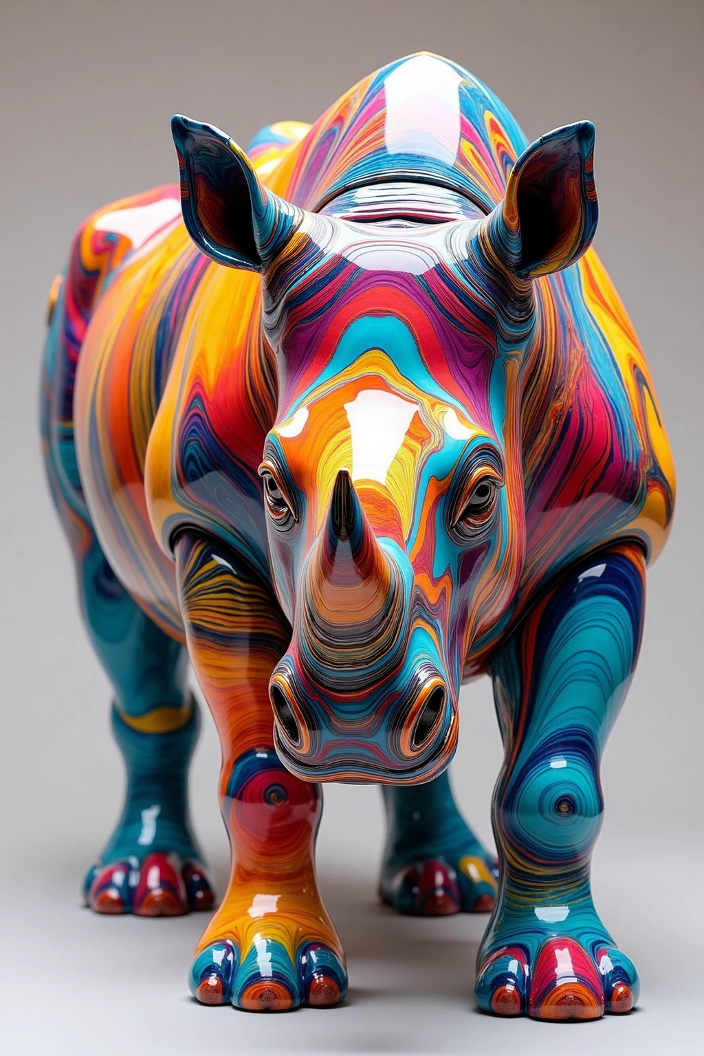 Colorful and with a fluid art sculpture style, fashion a tough rhino. Deep colors merge, shaping its ruggedness, a fusion of power and artistic flow.