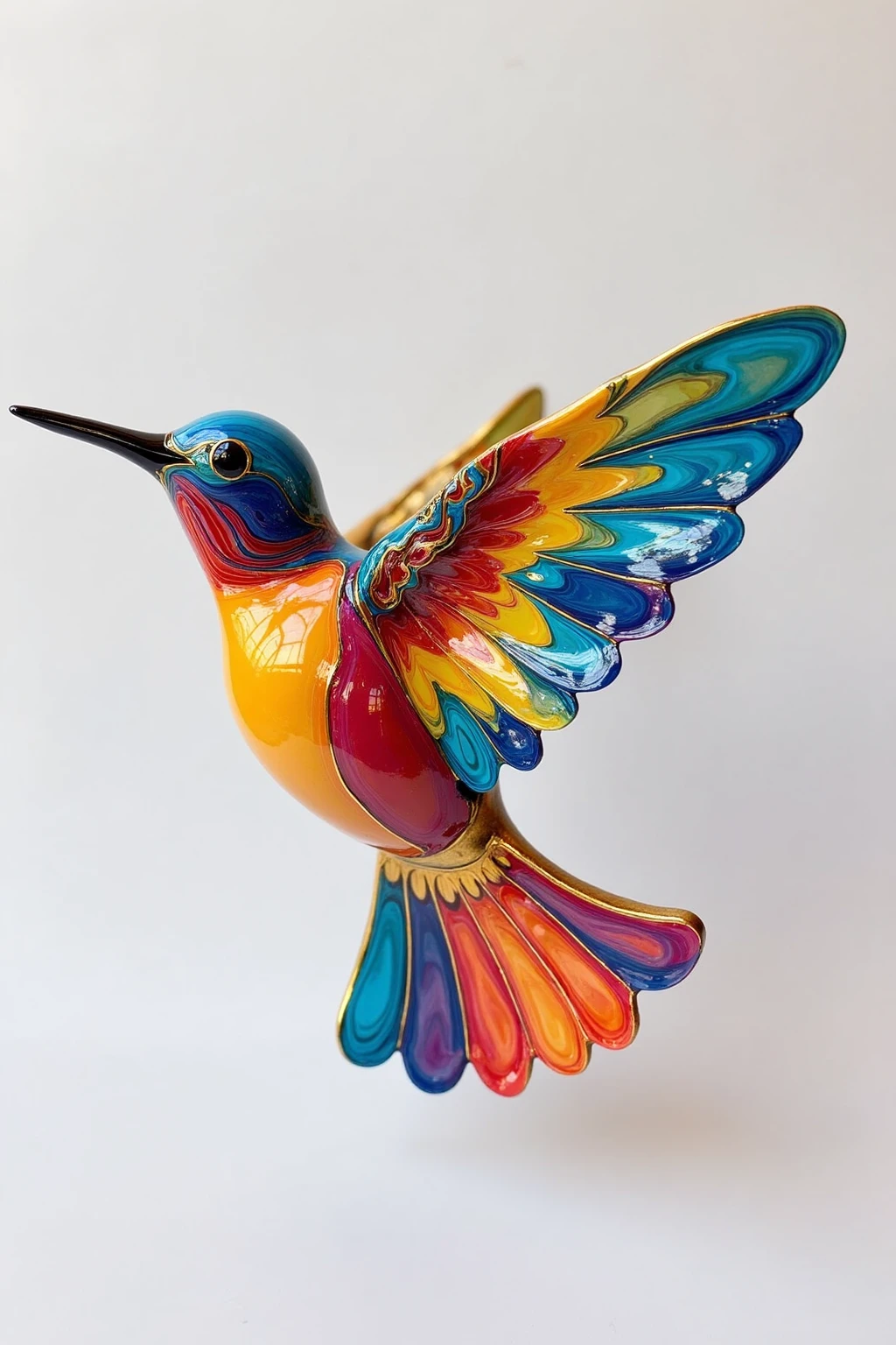Colorful and with a fluid art sculpture style, mold a tiny hummingbird. Bright colors swirl in its wings, capturing swift motion, a burst of vivid art.