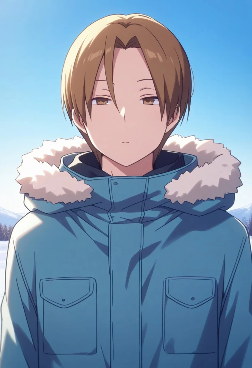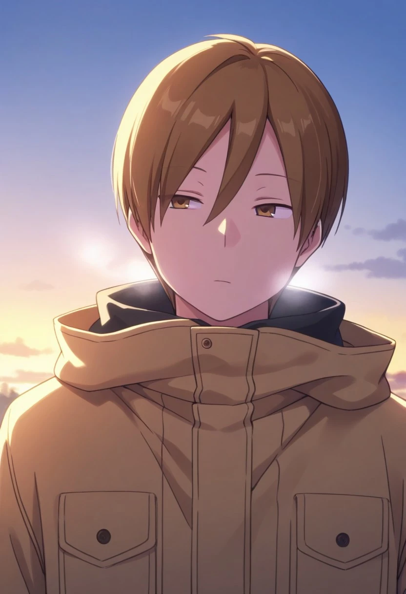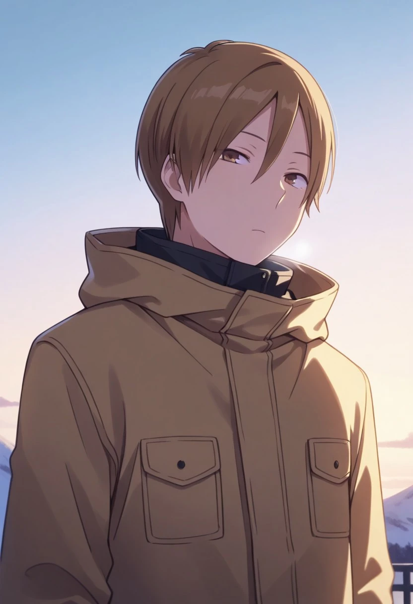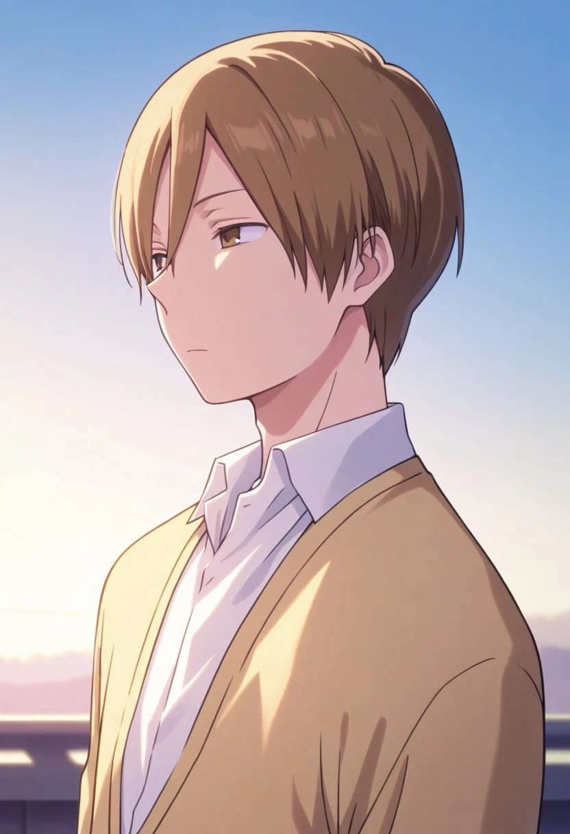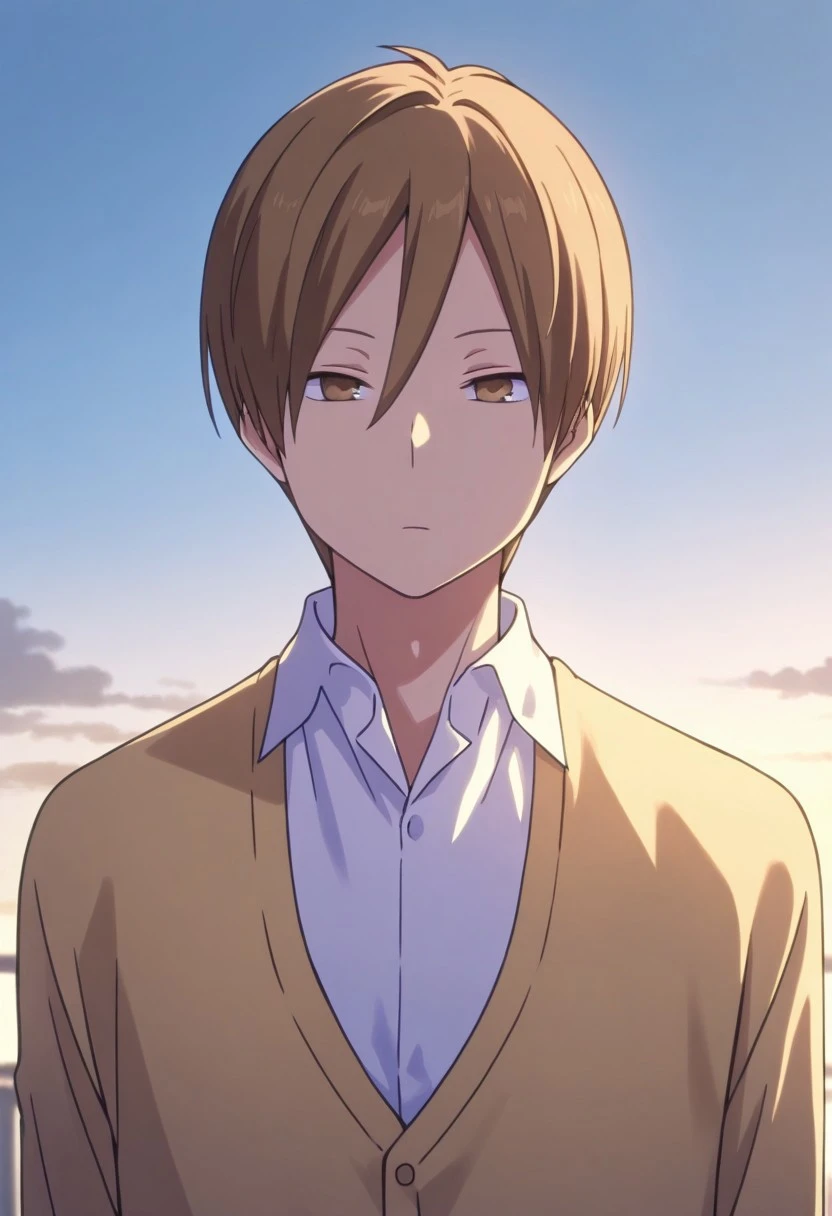 1boy, yuki asaba, male focus, solo, brown eyes, brown hair, short hair, hair between eyes, school uniform, shirt, white shirt, collared shirt, cardigan, brown cardigan,