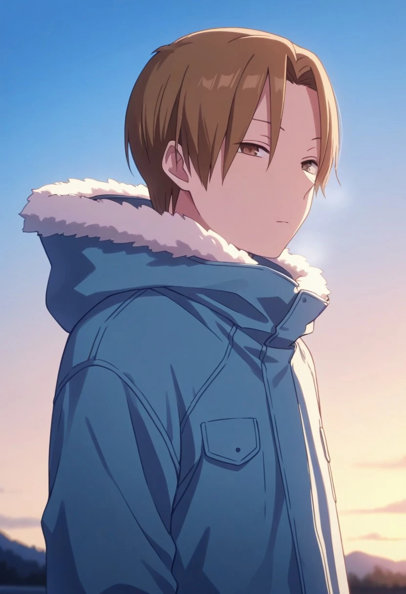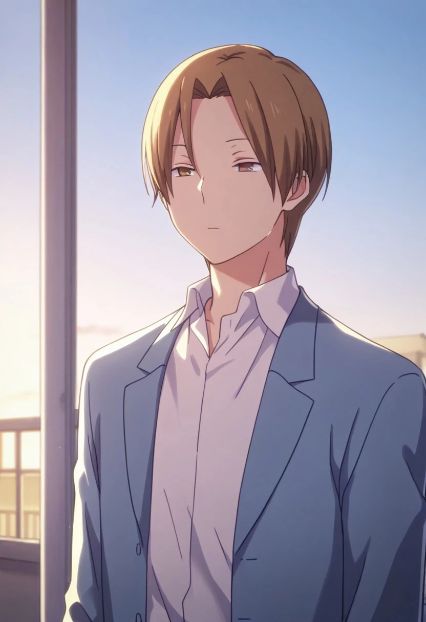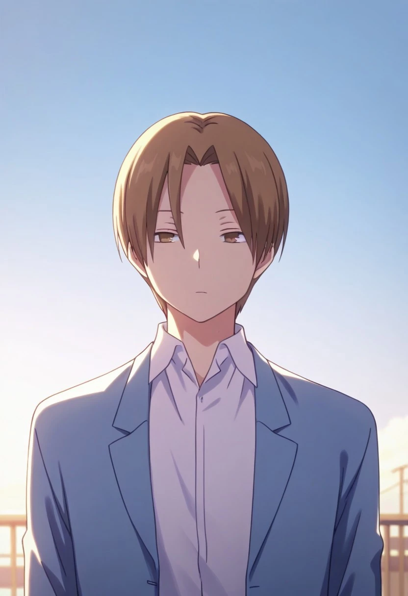 1boy, yuta asaba, male focus, solo, brown eyes, brown hair, short hair, parted bangs, school uniform, shirt, white shirt, collared shirt, jacket, blazer, blue jacket, open jacket, open clothes, pants, black pants,