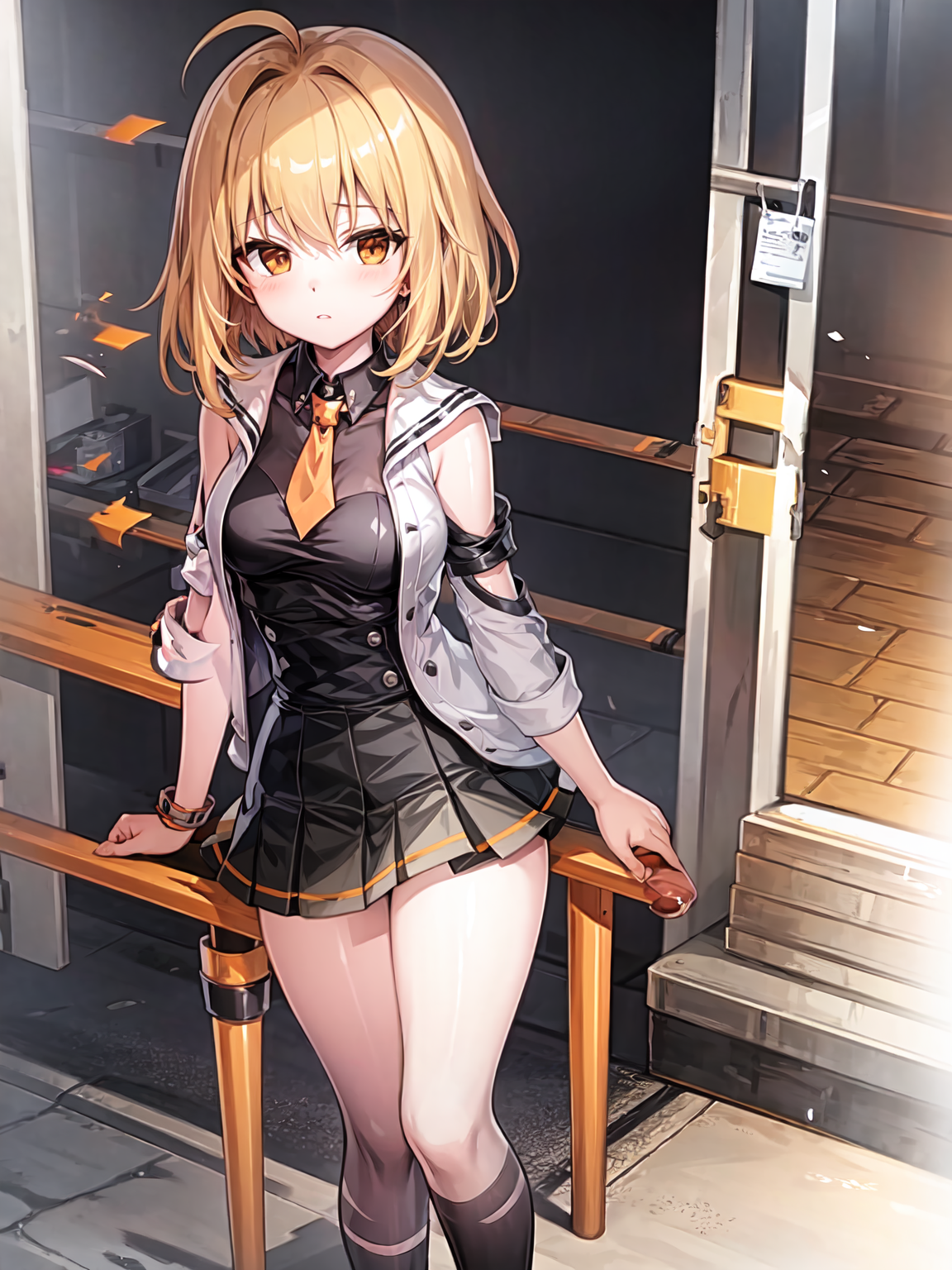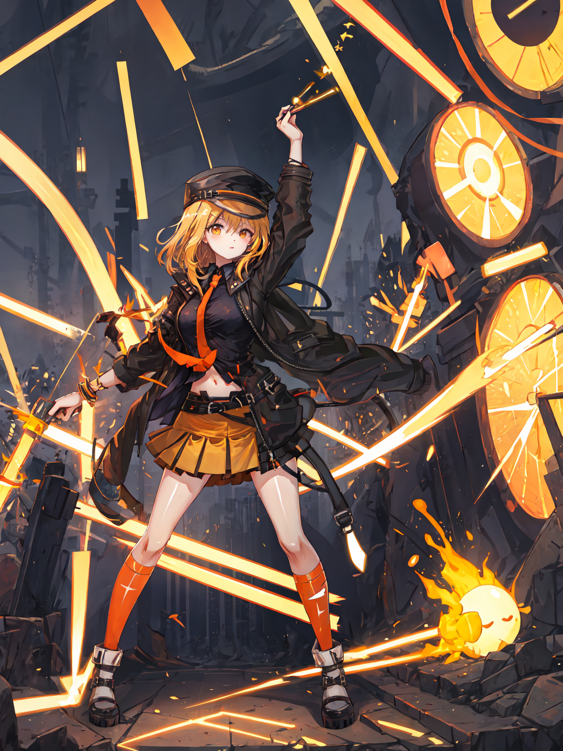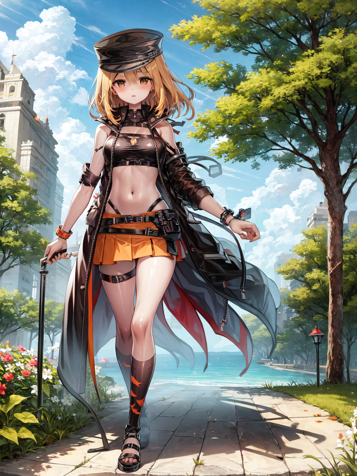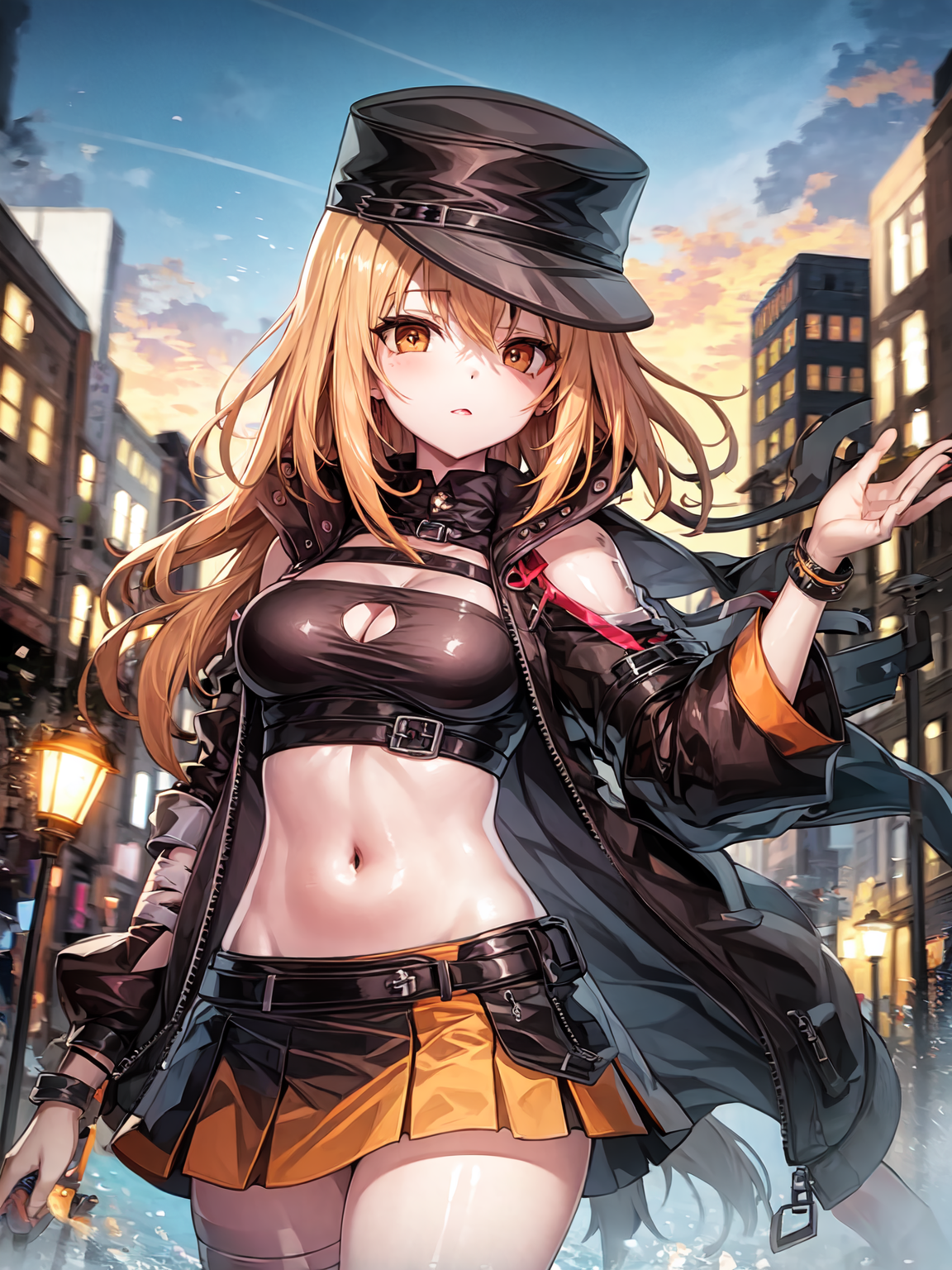 desire, belt, orange_skirt, navel, hat, coat,