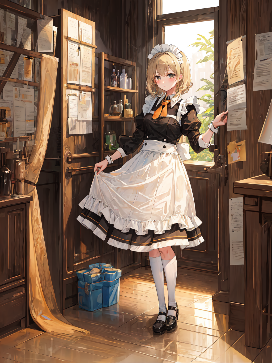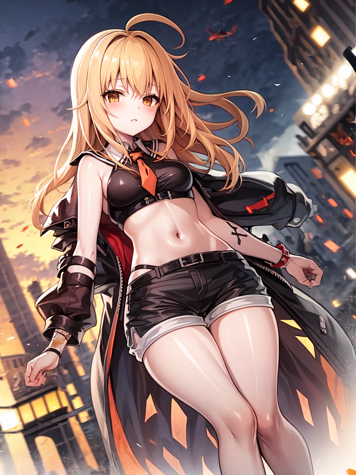 desire, belt, orange_skirt, navel, hat, coat,Description