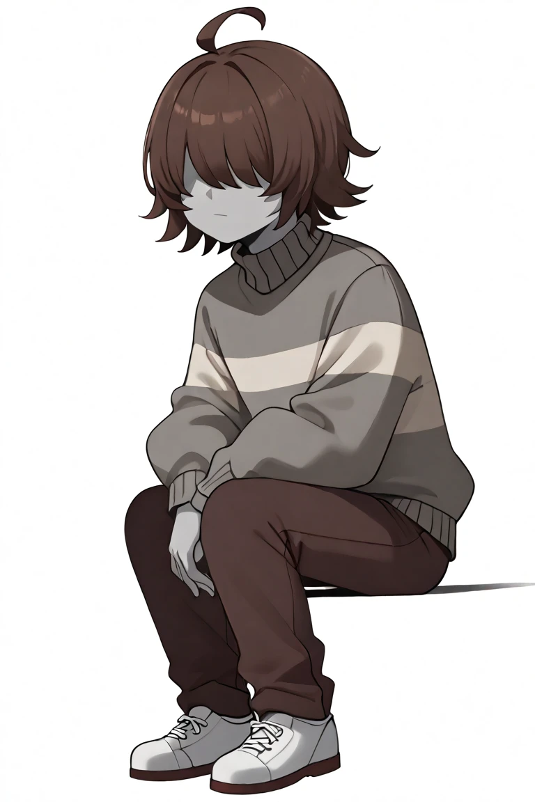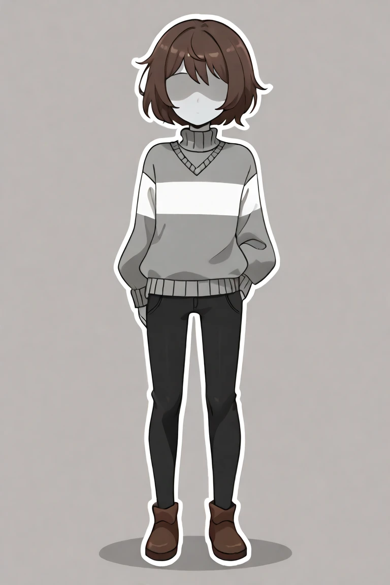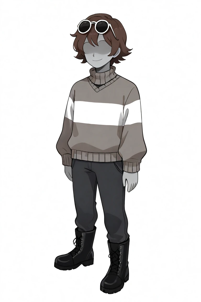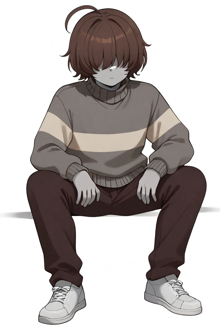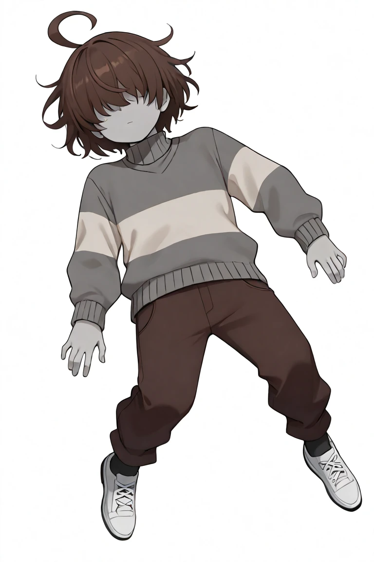 score_9, score_8_up, score_7_up, masterpiece, hd, source_anime, vesseldn, 1boy, androgynous, solo, teenager, grey skin, grey undertones, slim, shaded face, soft features, faceless, lack of facial features, no facial features, faceless, no_face, blank_face, brown hair, grey sweater, sweater, two horizontal white stripes, two stripes, white stripes, brown shoes, brown pants, standing, full body, facing viewer, white background