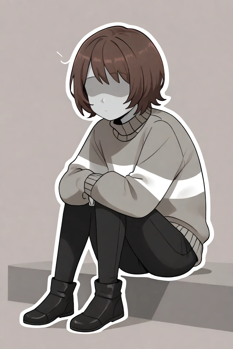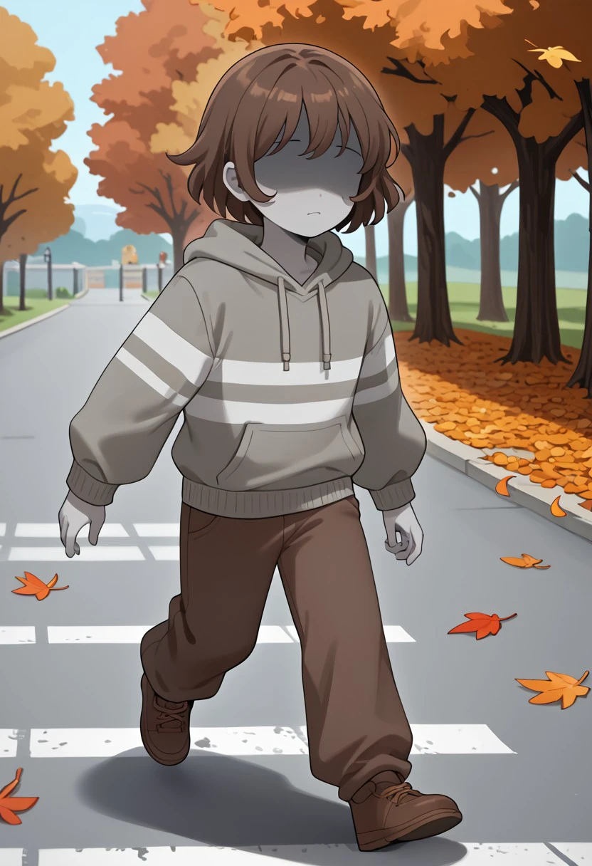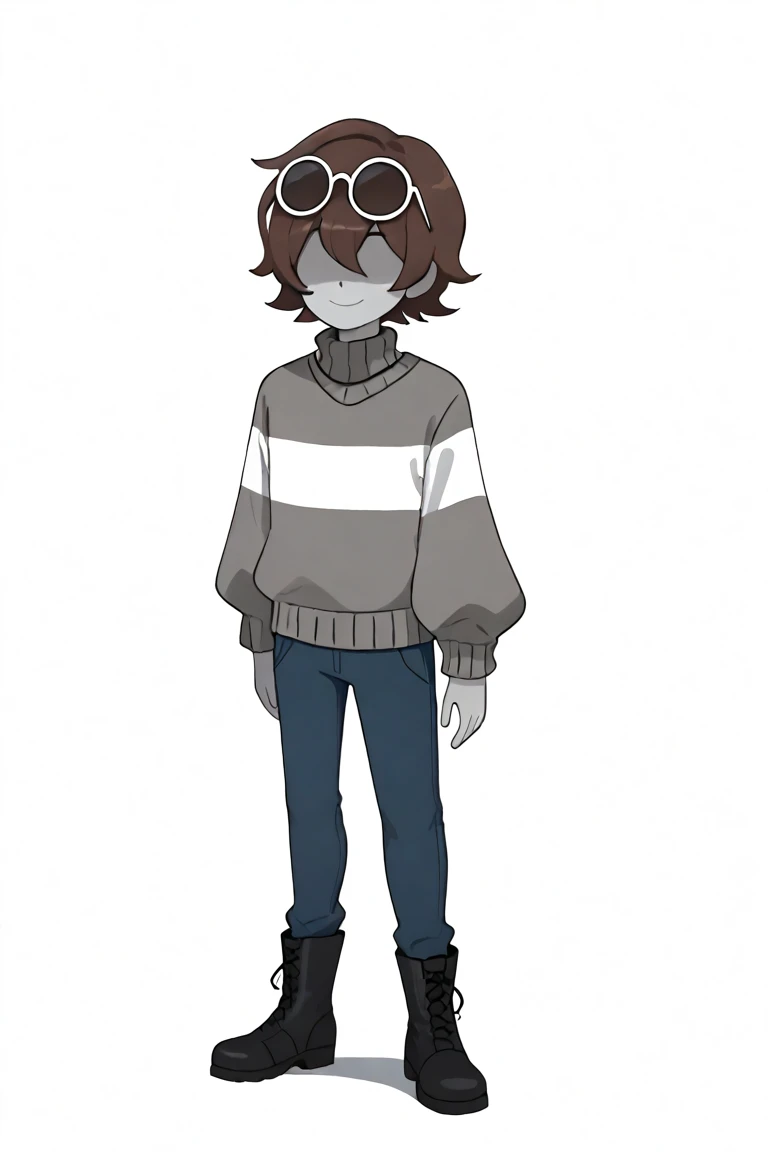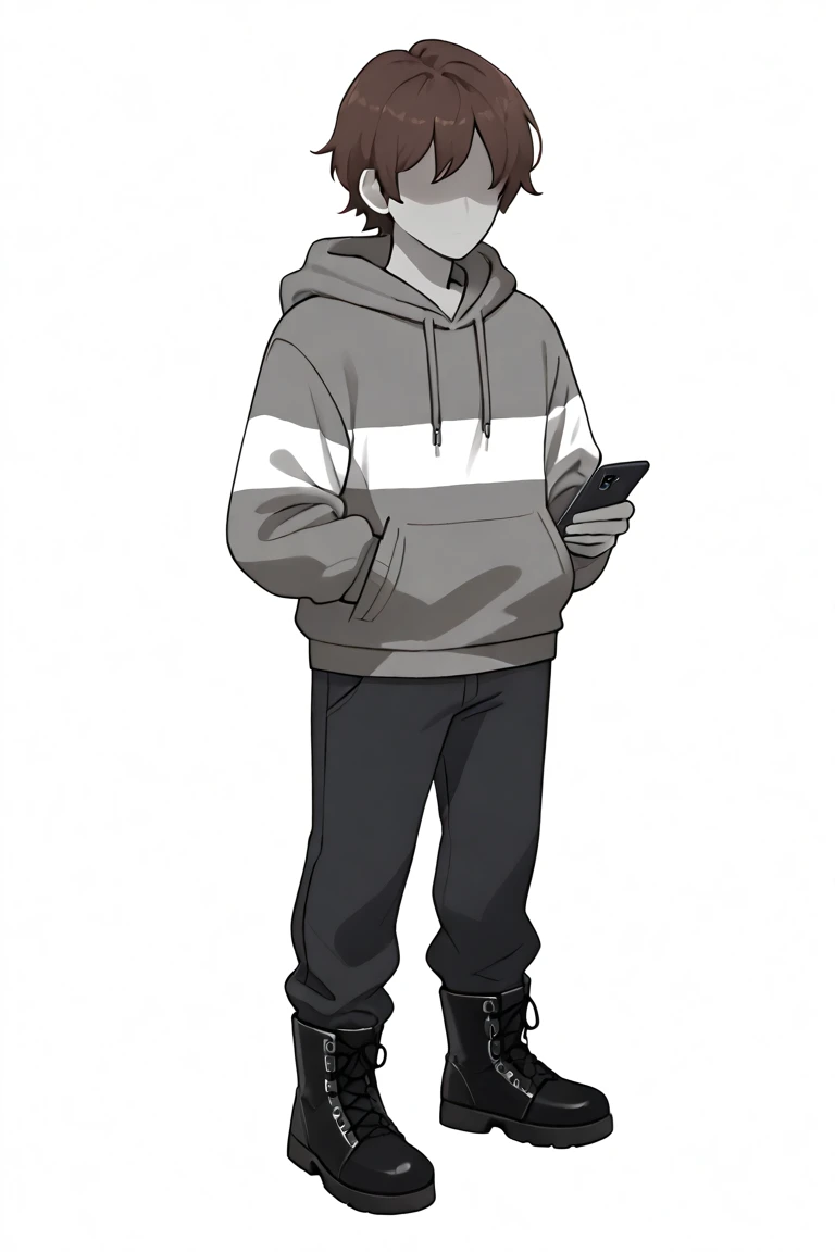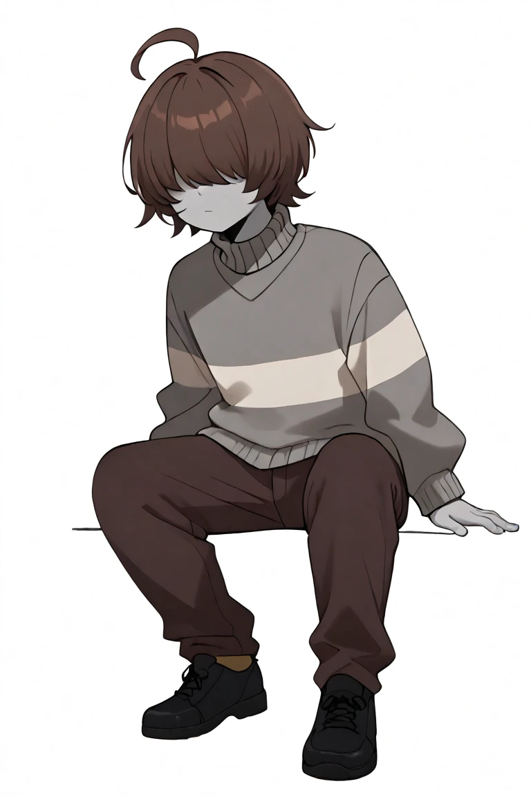 score_9, score_8_up, score_7_up, masterpiece, hd, source_anime, vesseldn, 1boy, androgynous, solo, teenager, grey skin, grey undertones, slim, shaded face, soft features, faceless, lack of facial features, no facial features, faceless, no_face, blank_face, brown hair, grey sweater, sweater, two horizontal white stripes, two stripes, white stripes, brown shoes, brown pants, standing, full body, facing viewer, white background