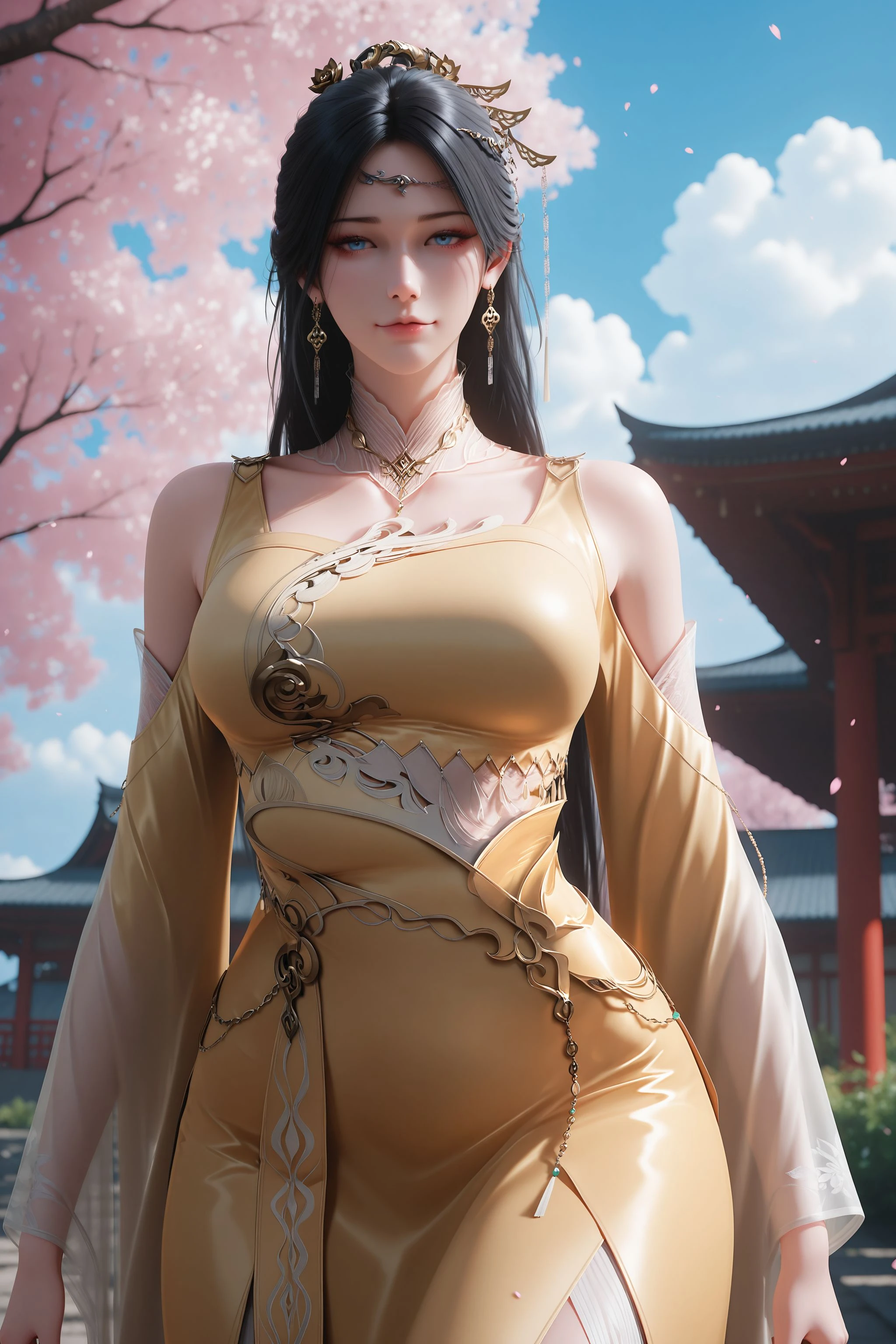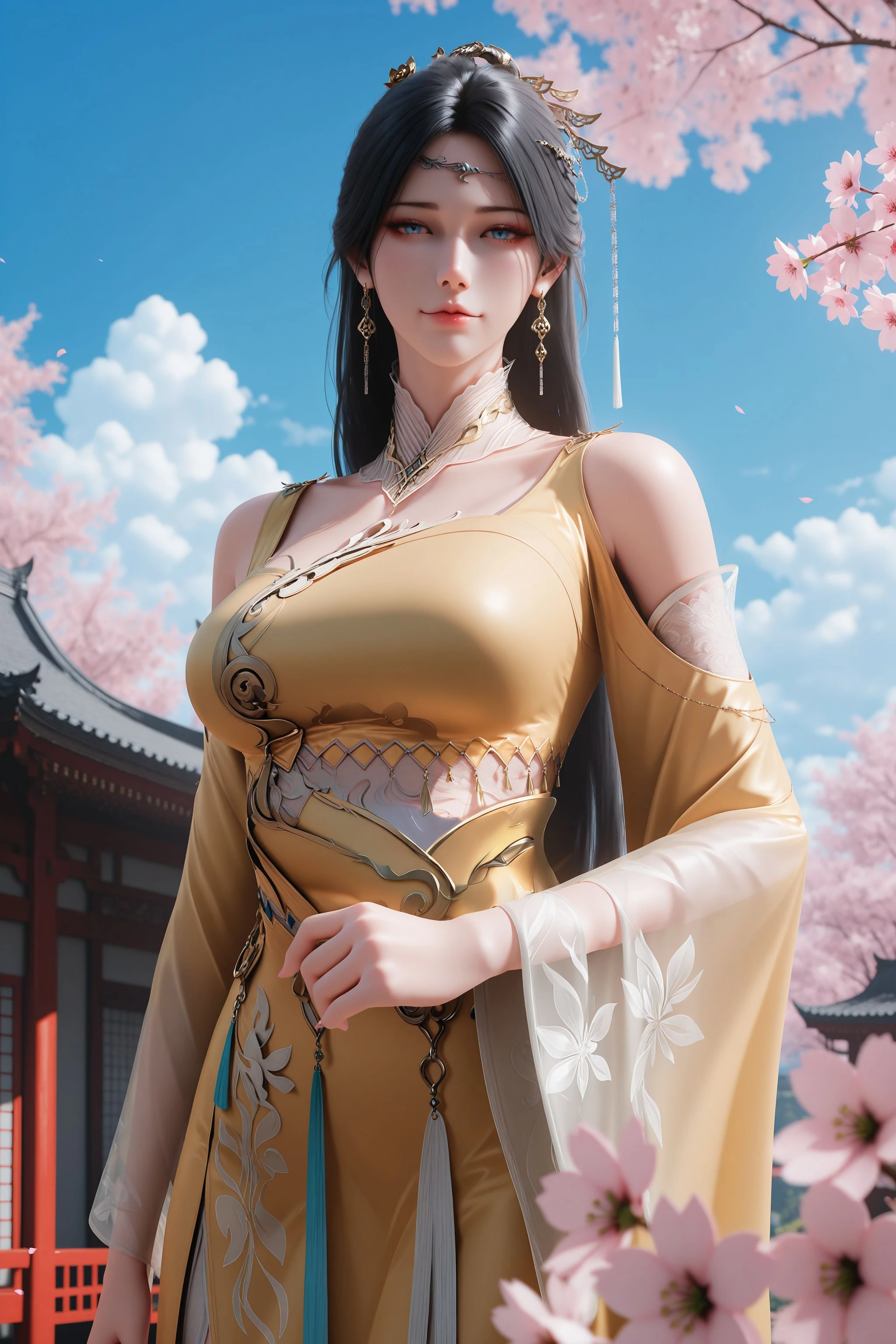 1girl,solo,flower,yellow dress,hair ornament,dress,jewelry,earrings,long hair,black hair,blue eyes,bare shoulders,detached collar,detached sleeves,