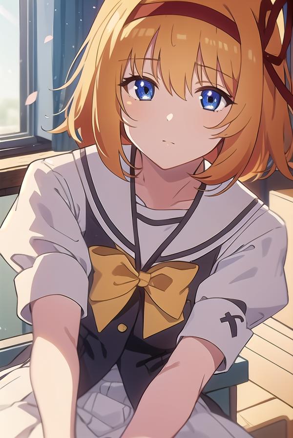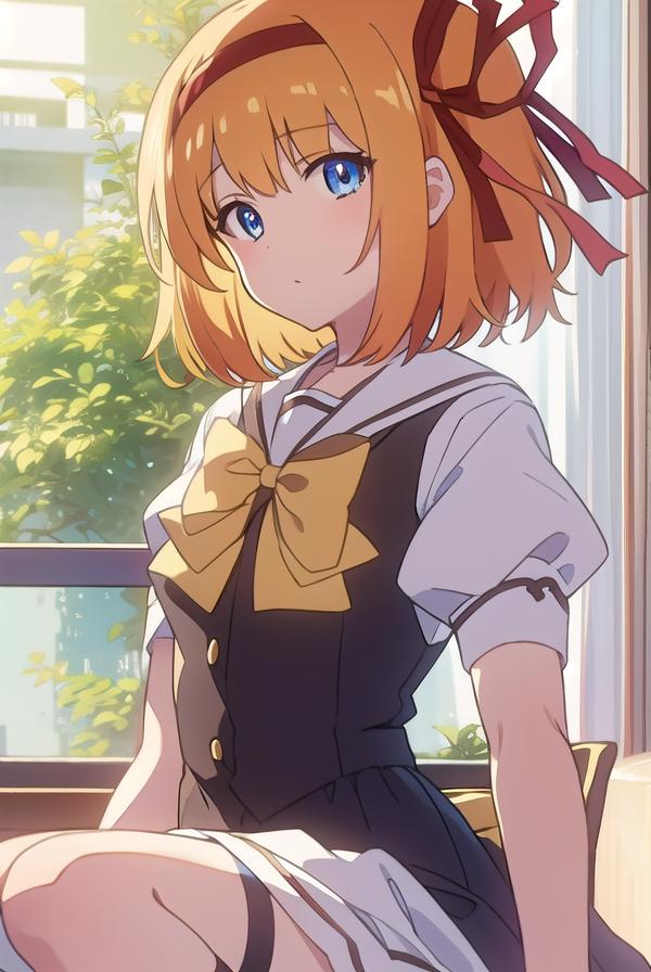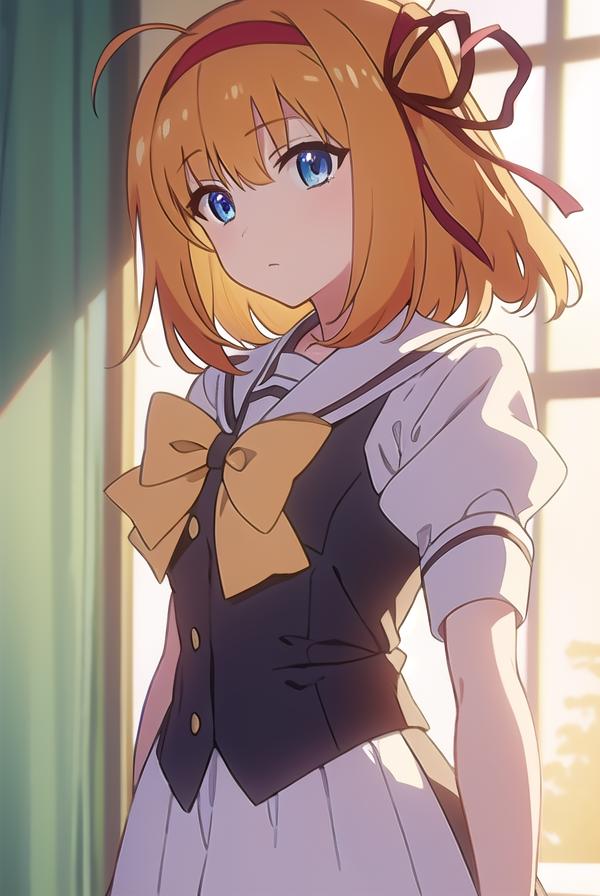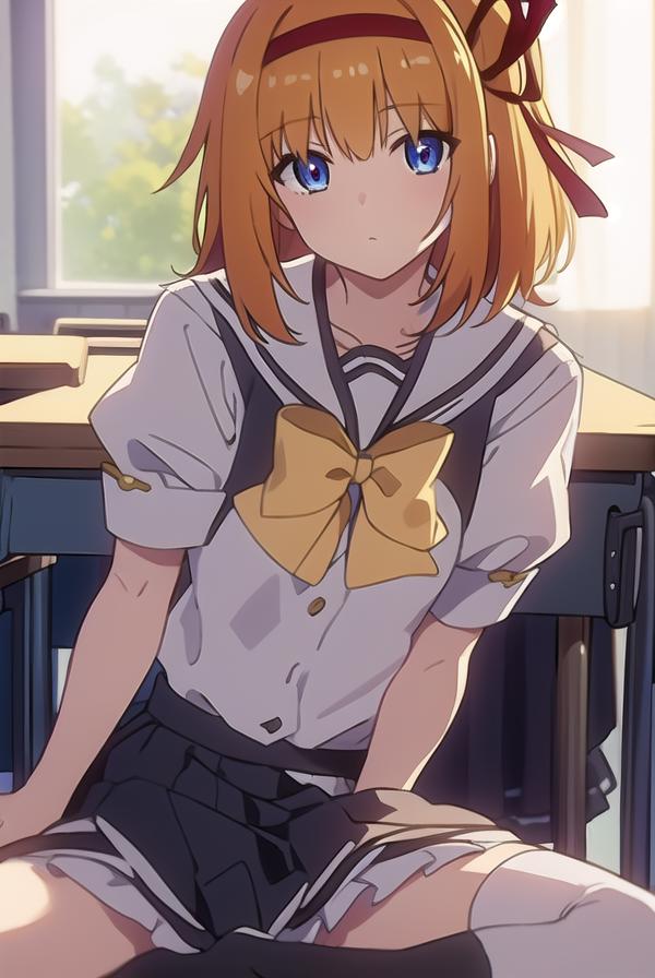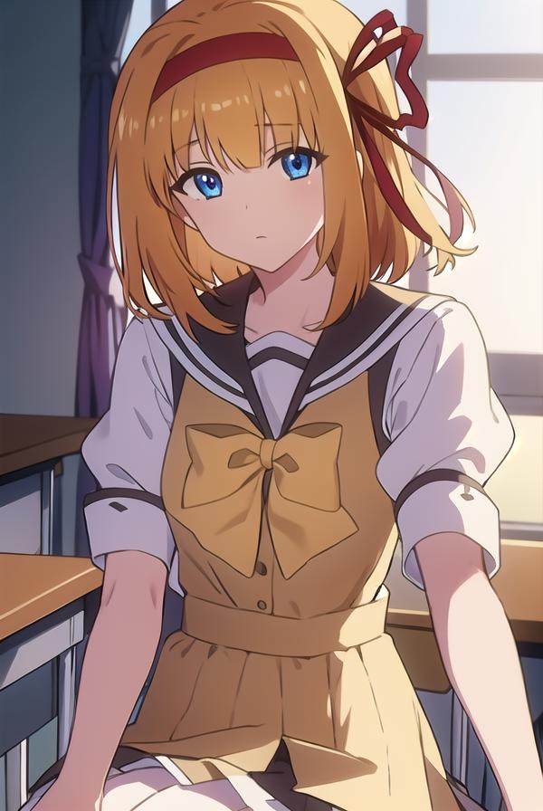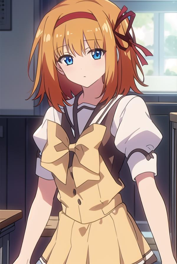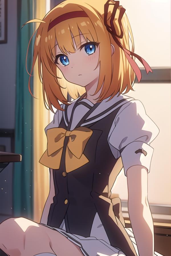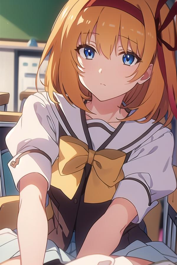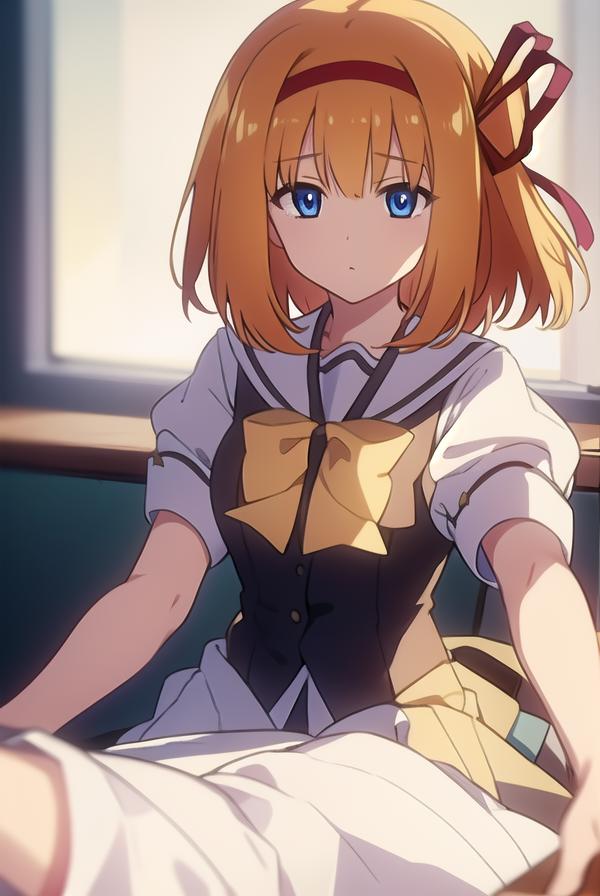 kaede fuyou, short hair, orange hair, hair ribbon, hairband, blue eyes,