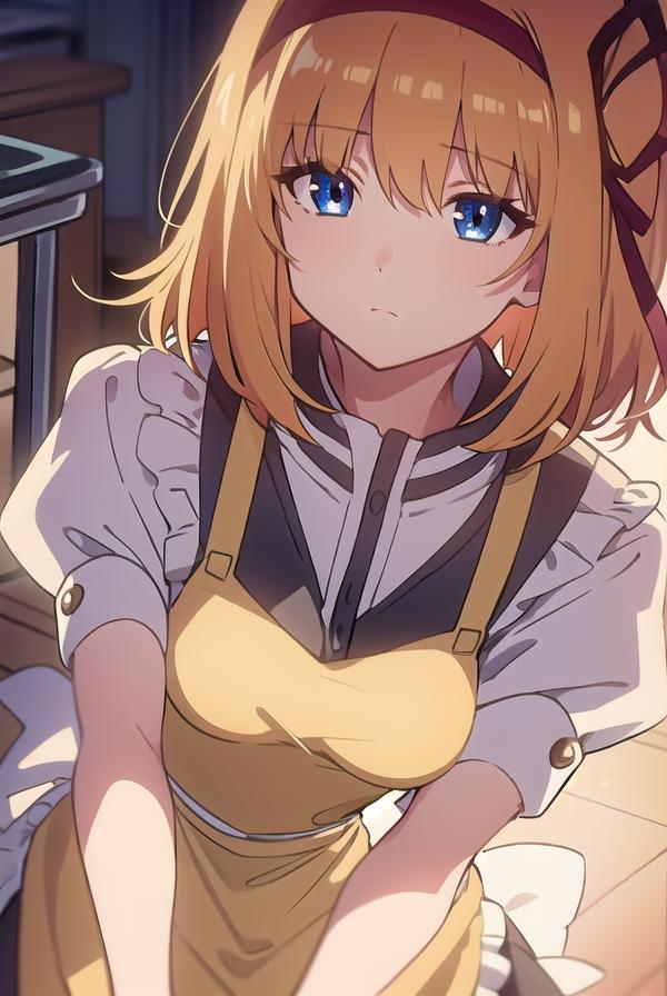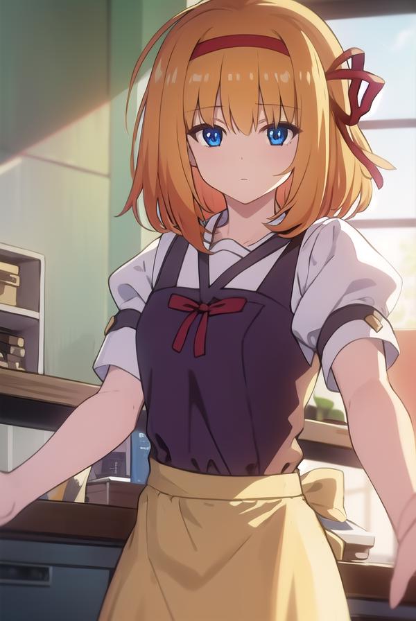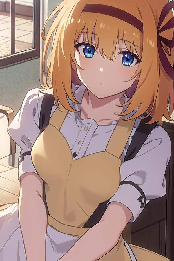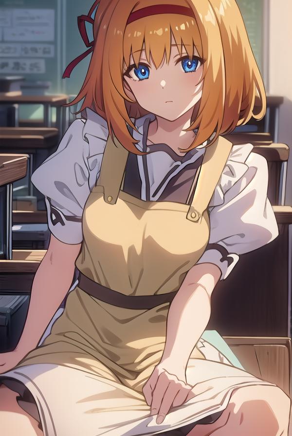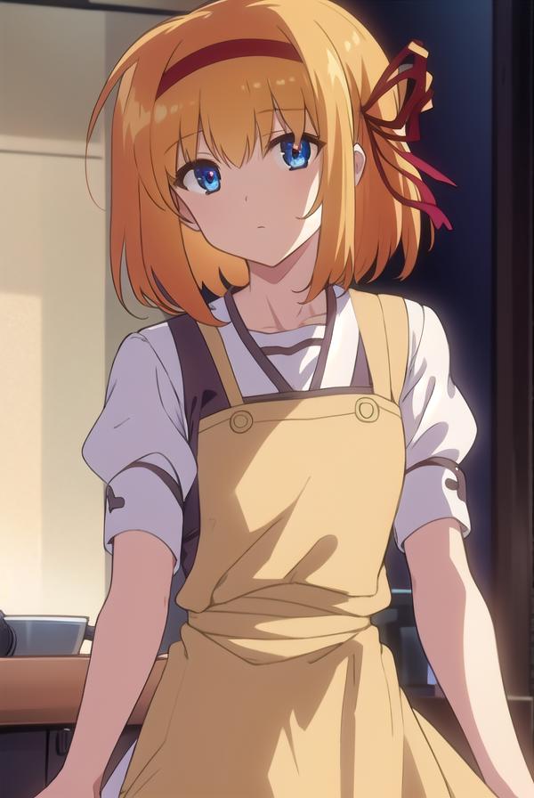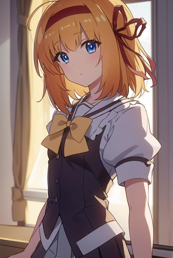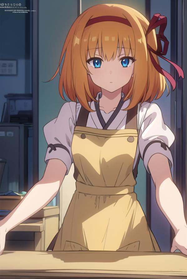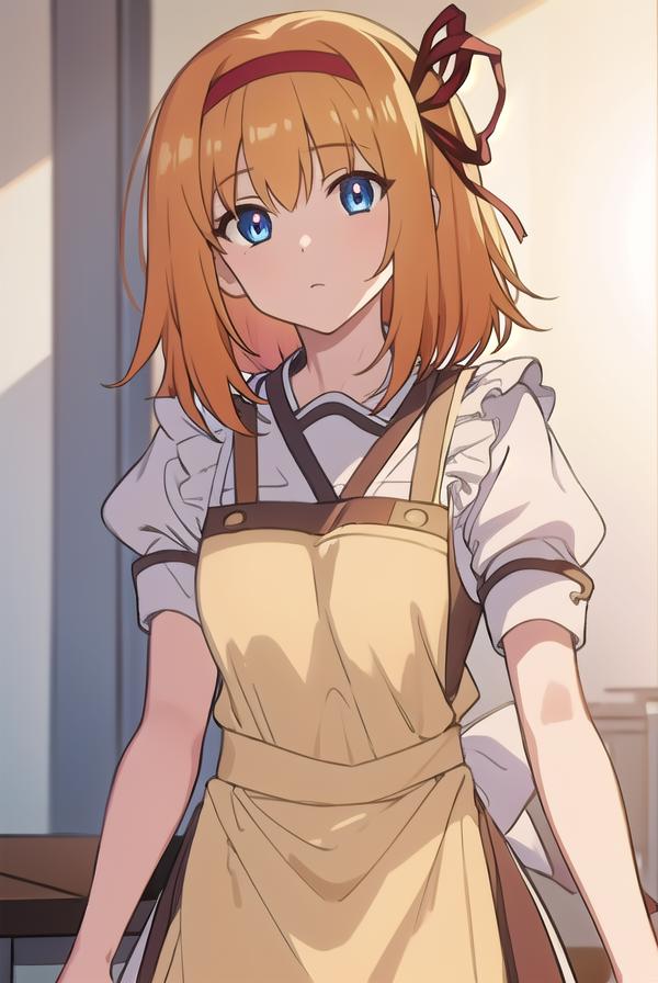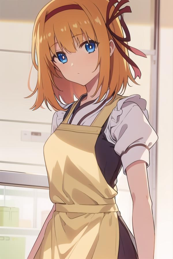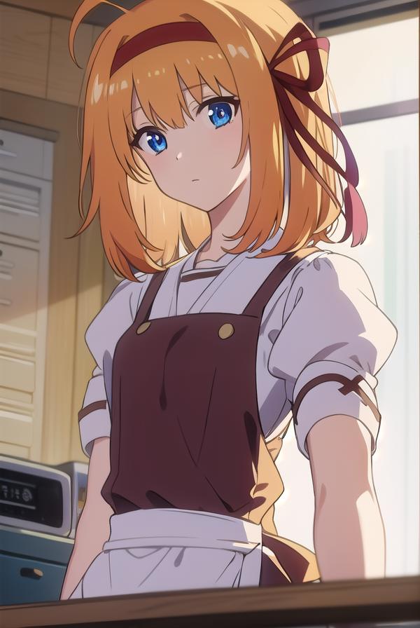 kaede fuyou, short hair, orange hair, hair ribbon, hairband, blue eyes,