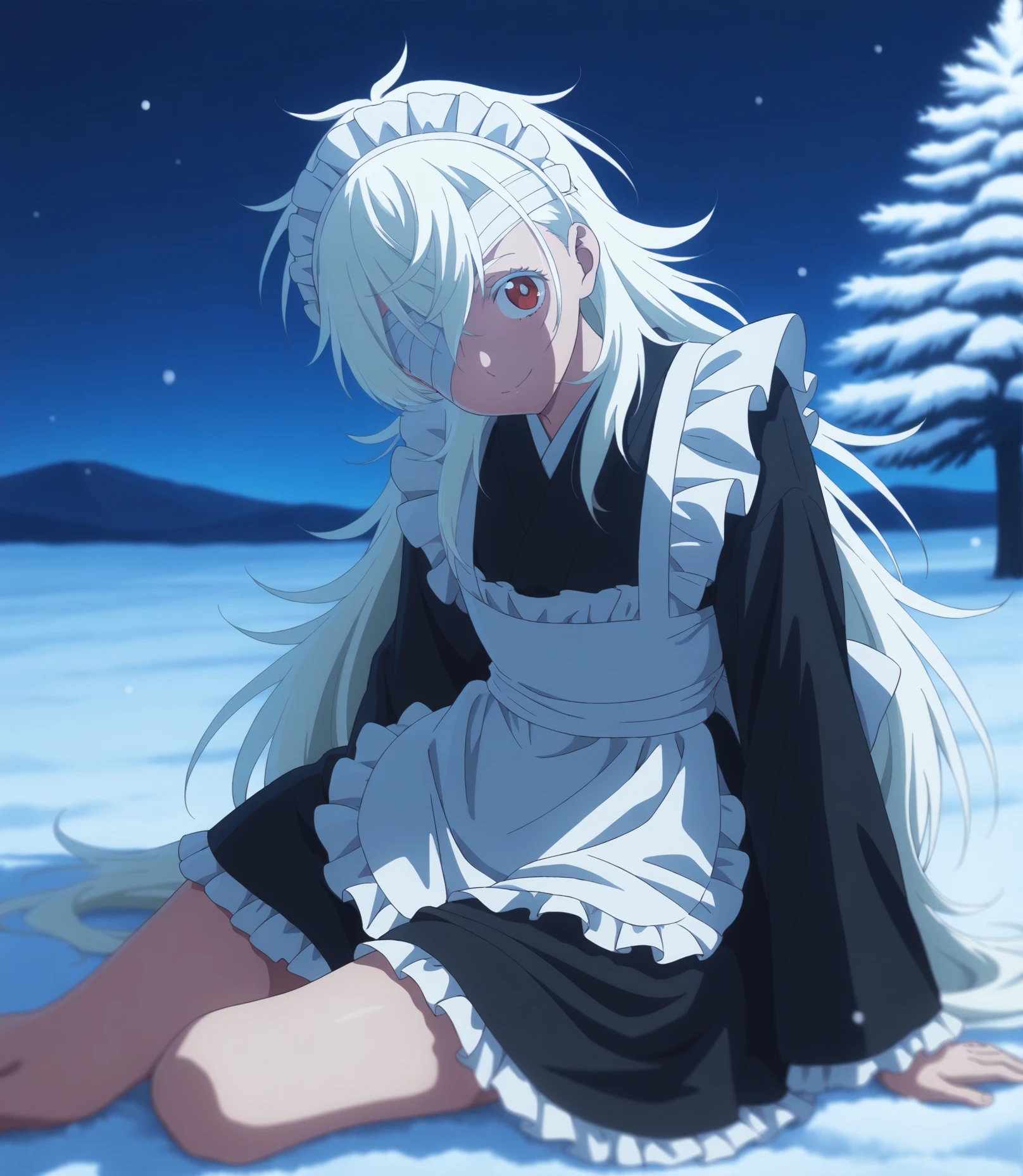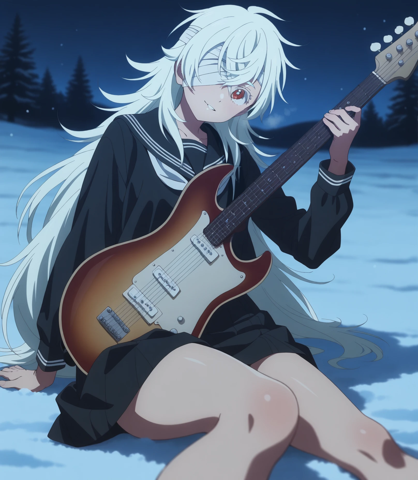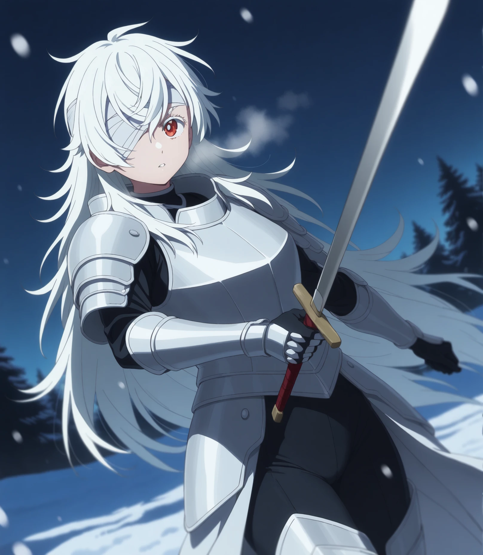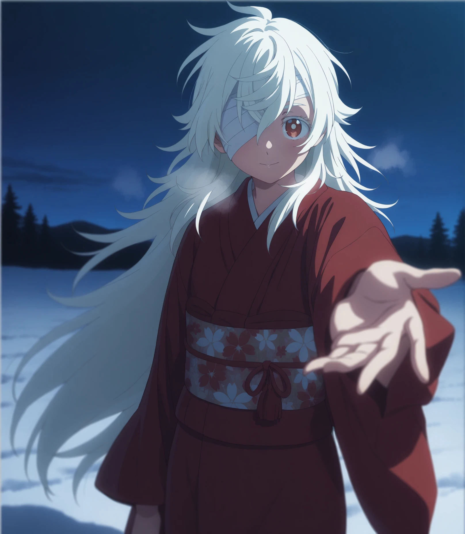 3. eyelashes, nose, bandage over one eye, one eye covered, eyepatch, bandages, white hair, very long hair, long hair, bangs, red eyes, hair between eyes