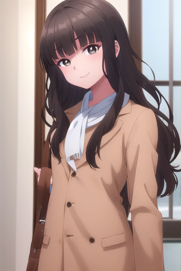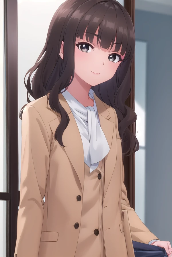 shihoko fujimiya, long hair, bangs, black hair, (brown eyes:1.5), blunt bangs, wavy hair,