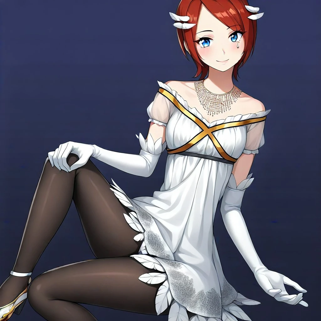 Character appearance: brown, red hair, short hair, bangs, blue eyes, teardrop earrings, feather hair ornament, necklace, jewelry, small breasts