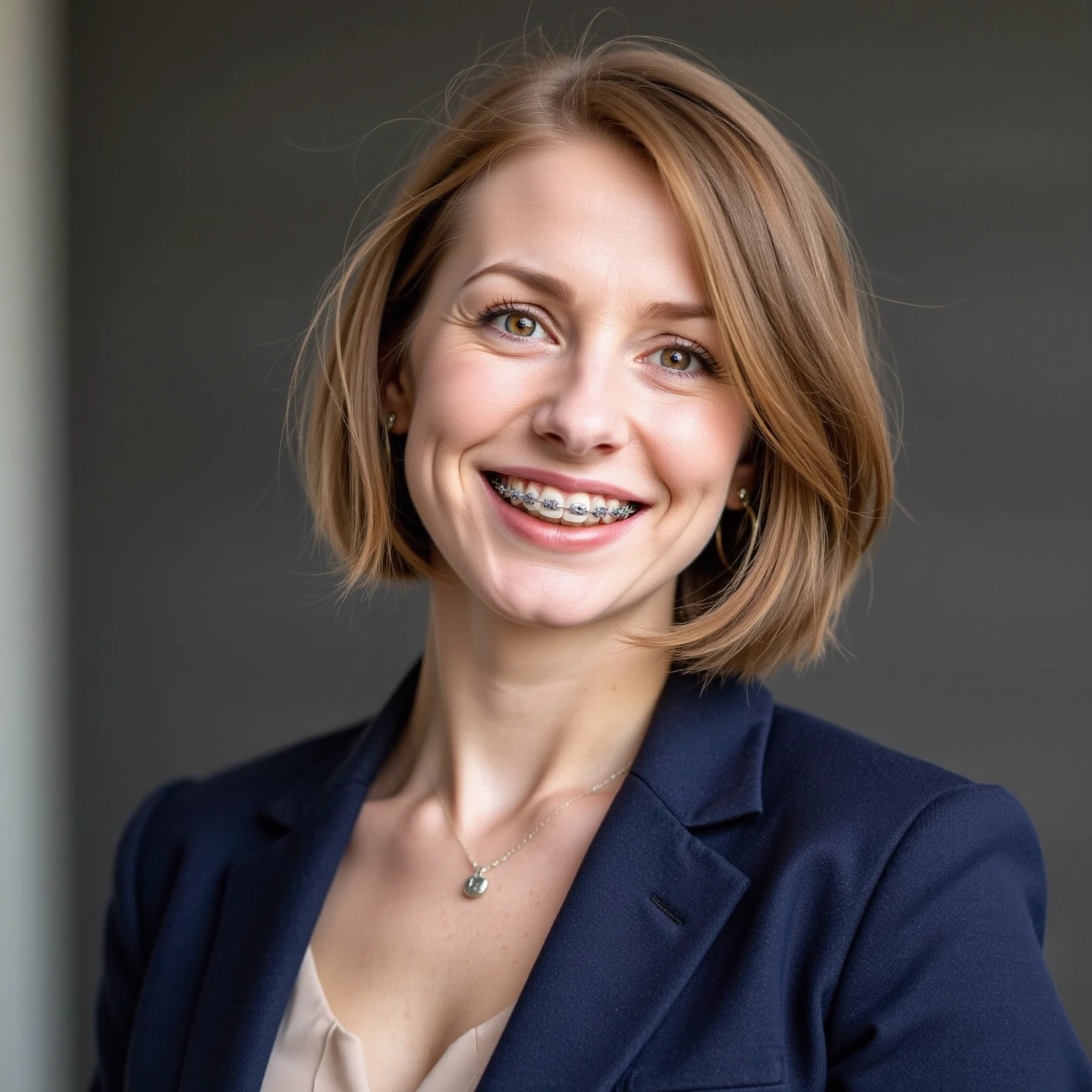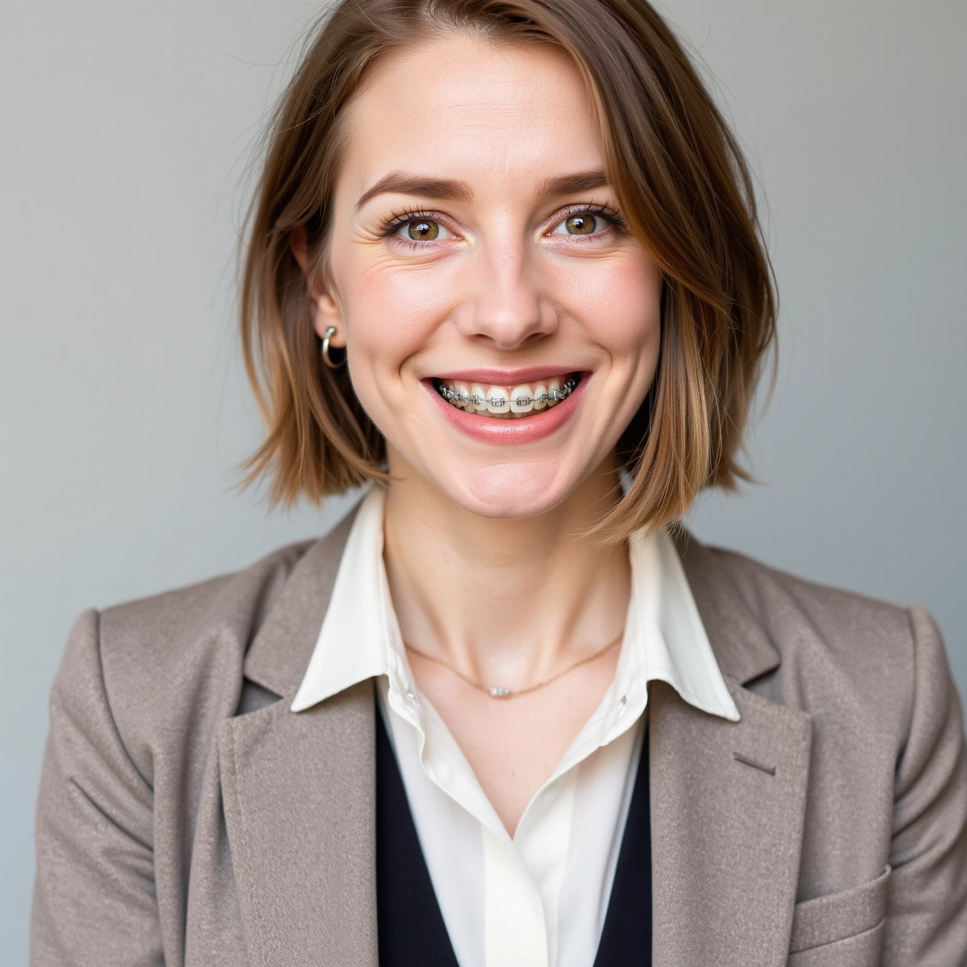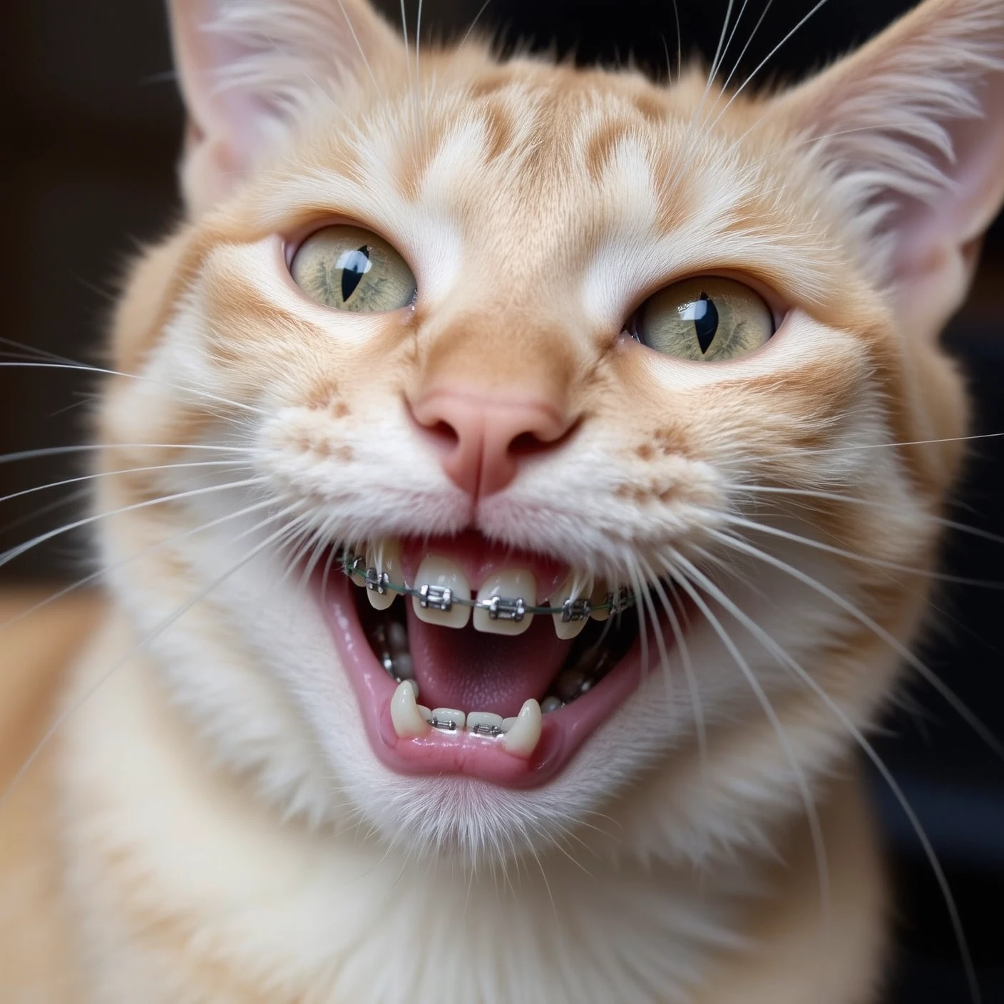 mouth half open, revealing the brac3s on [subject] teeth