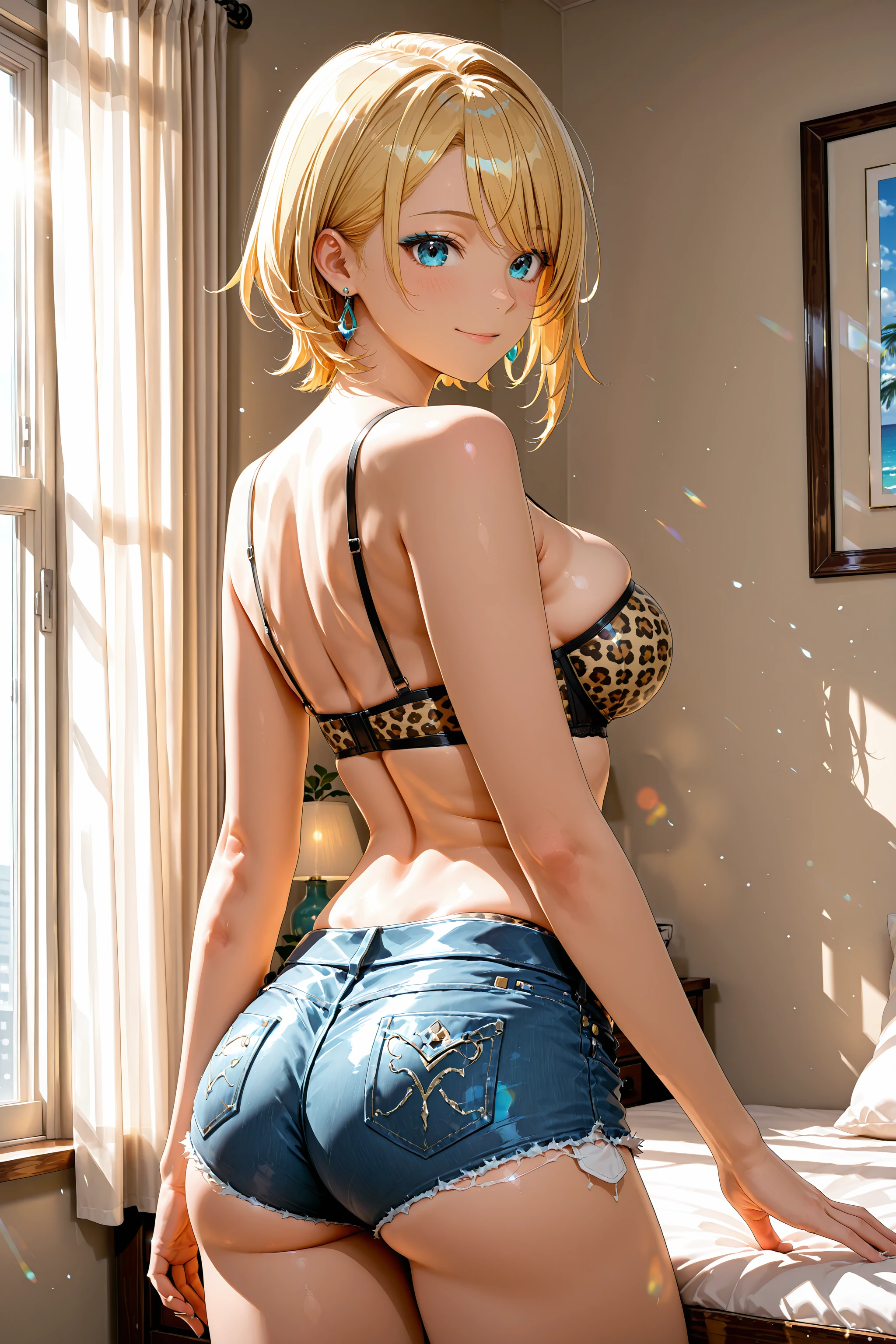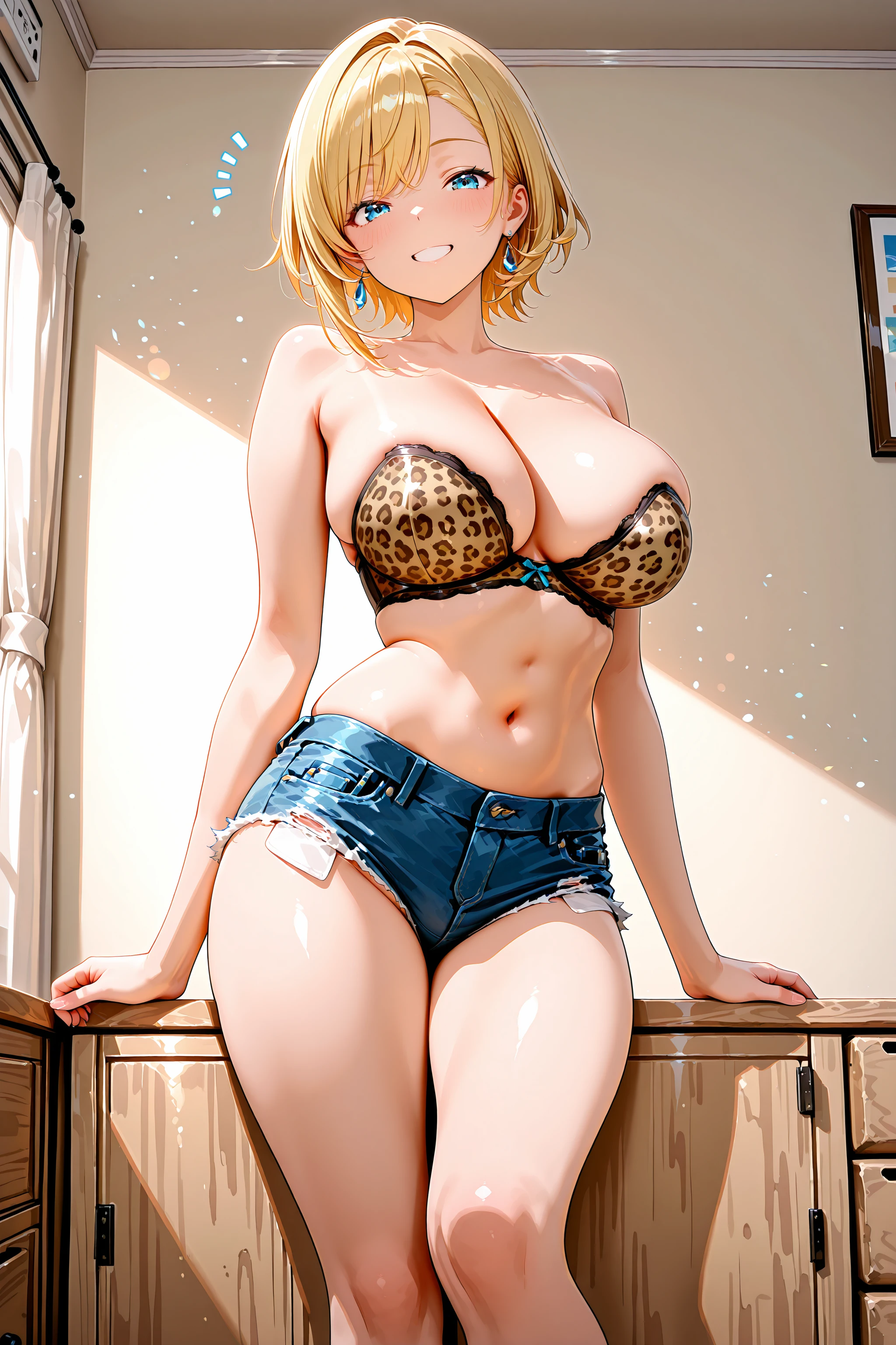 You'll probably also want to prompt "blonde hair, strapless bra, leopard print, denim shorts, microshorts," if you want to get the outfit and hair more consistent.