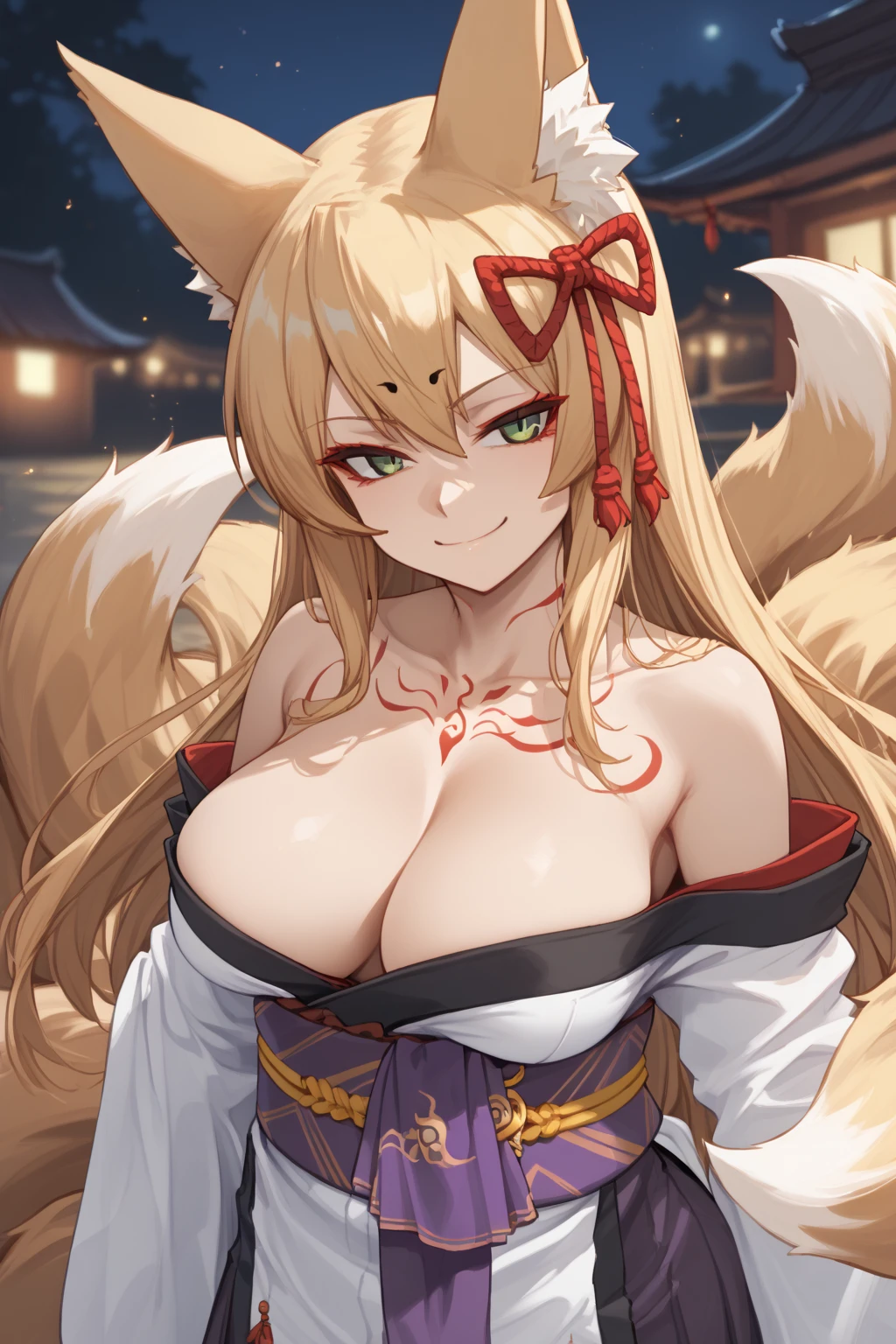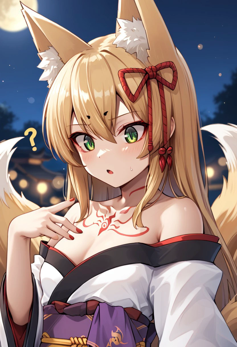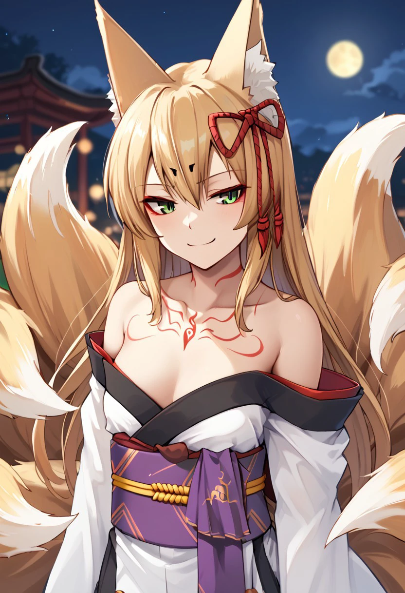Tamamo, blonde hair, hair ribbon, long hair, kitsune, green eyes, fox ears, (fox tail), (red eyeliner), little girl, monster girl, slit pupils, multiple tails, red tattoo on chest, kimono, off shoulders, sash