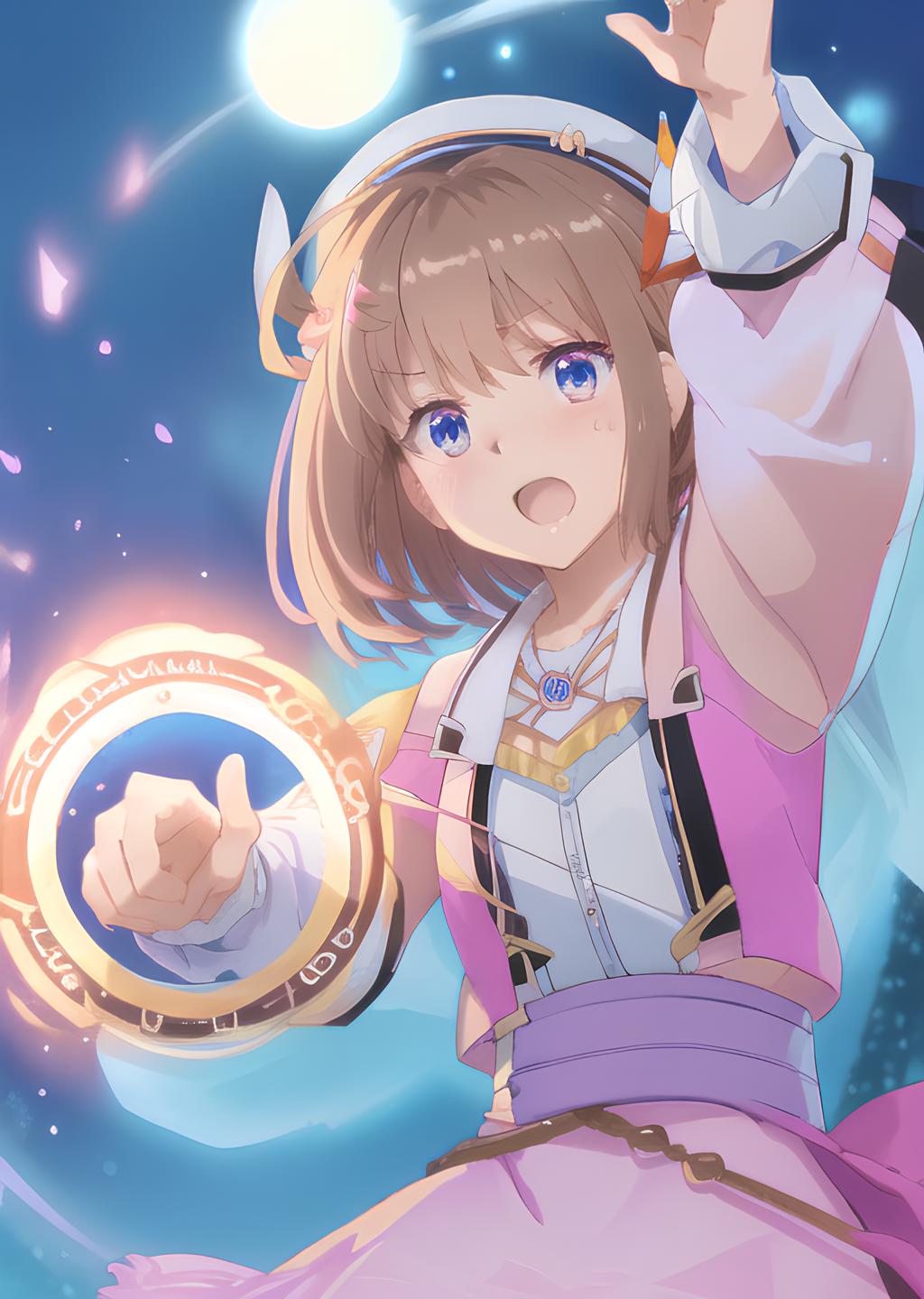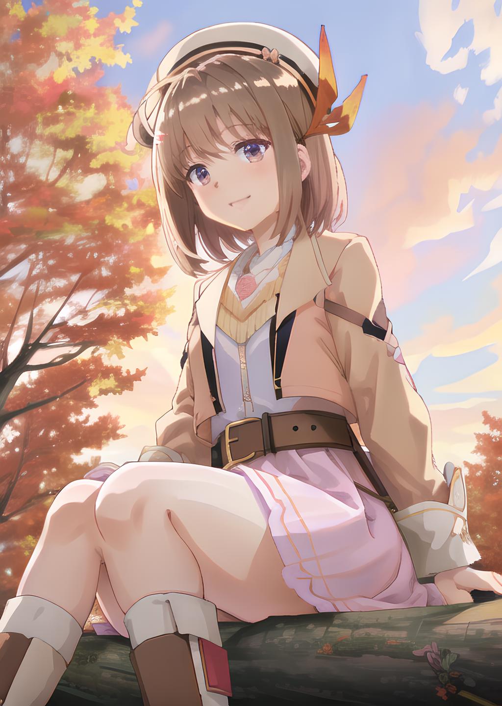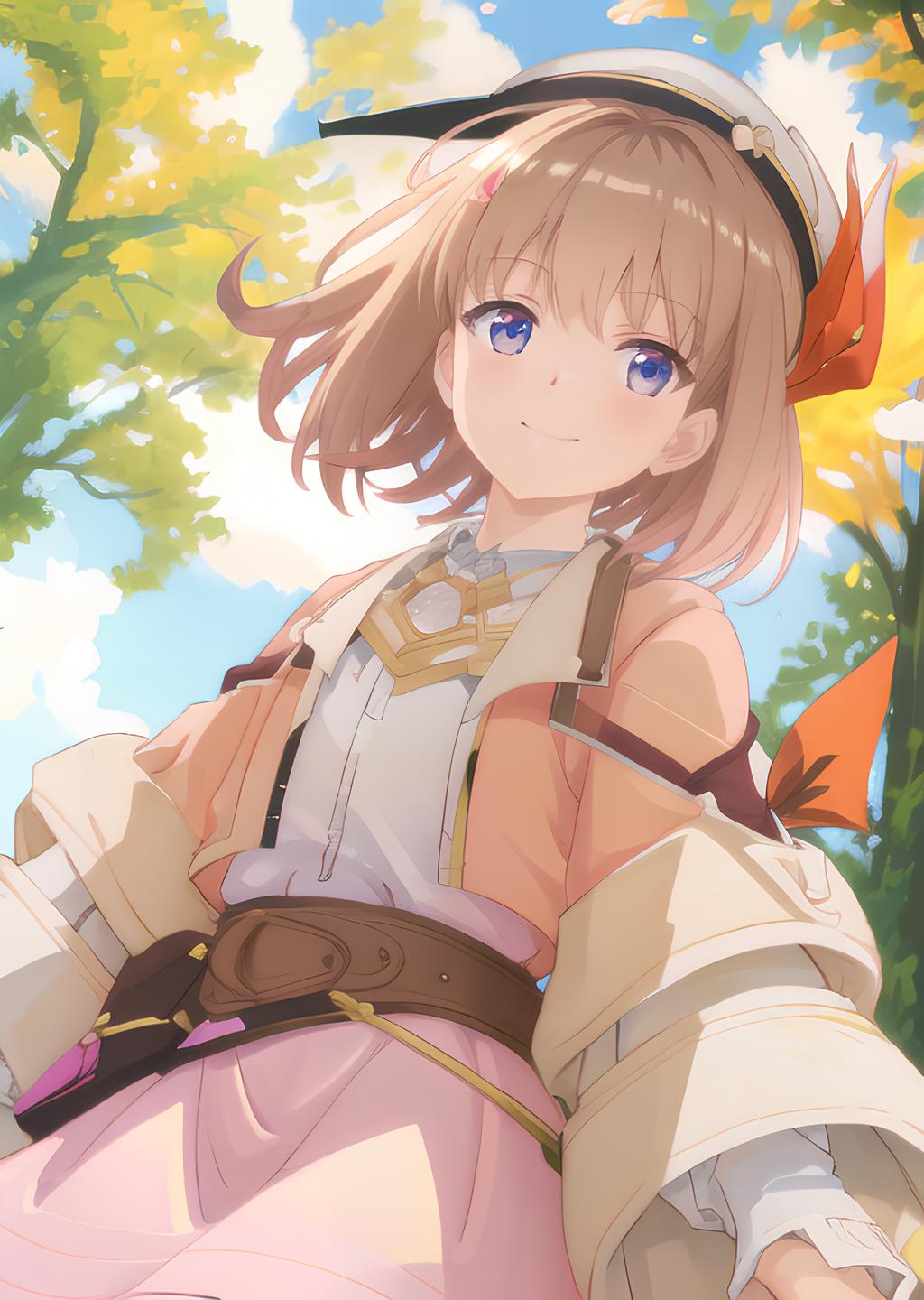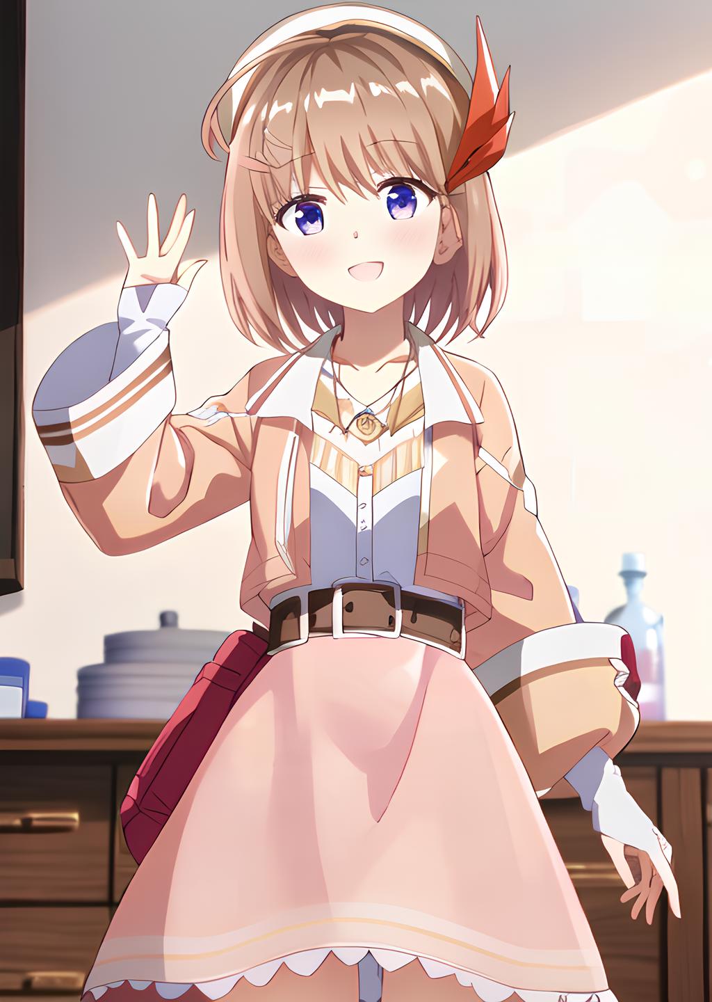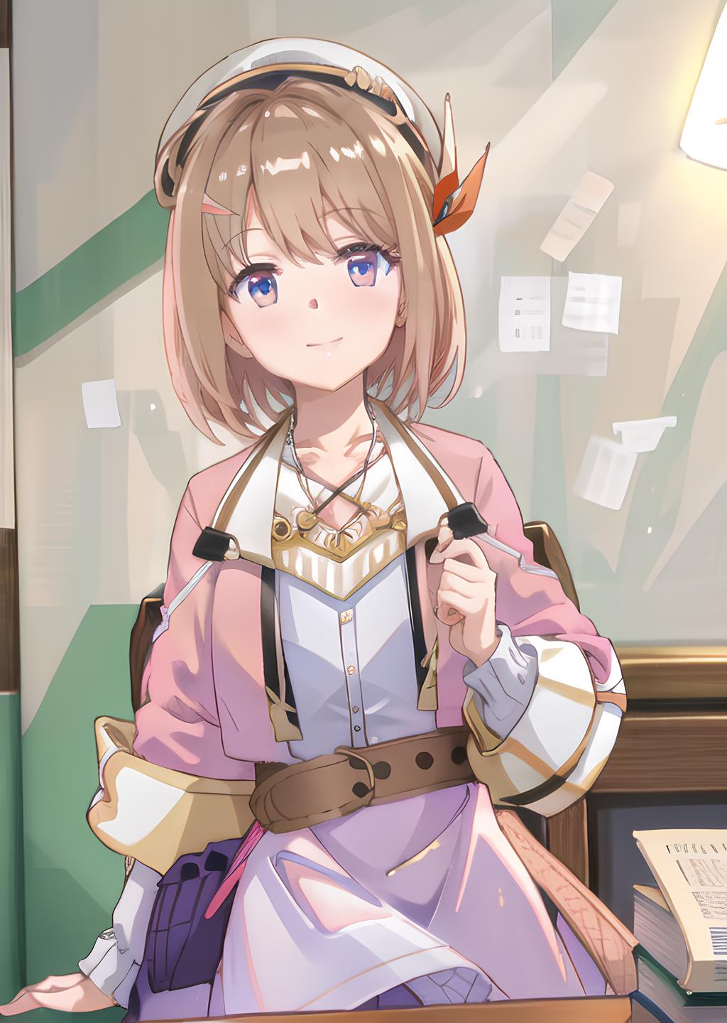 red_ribbon, hairpin, white_headware, necklace, jewelry, brown_jacket, pink_skirt, belt, black_boots,