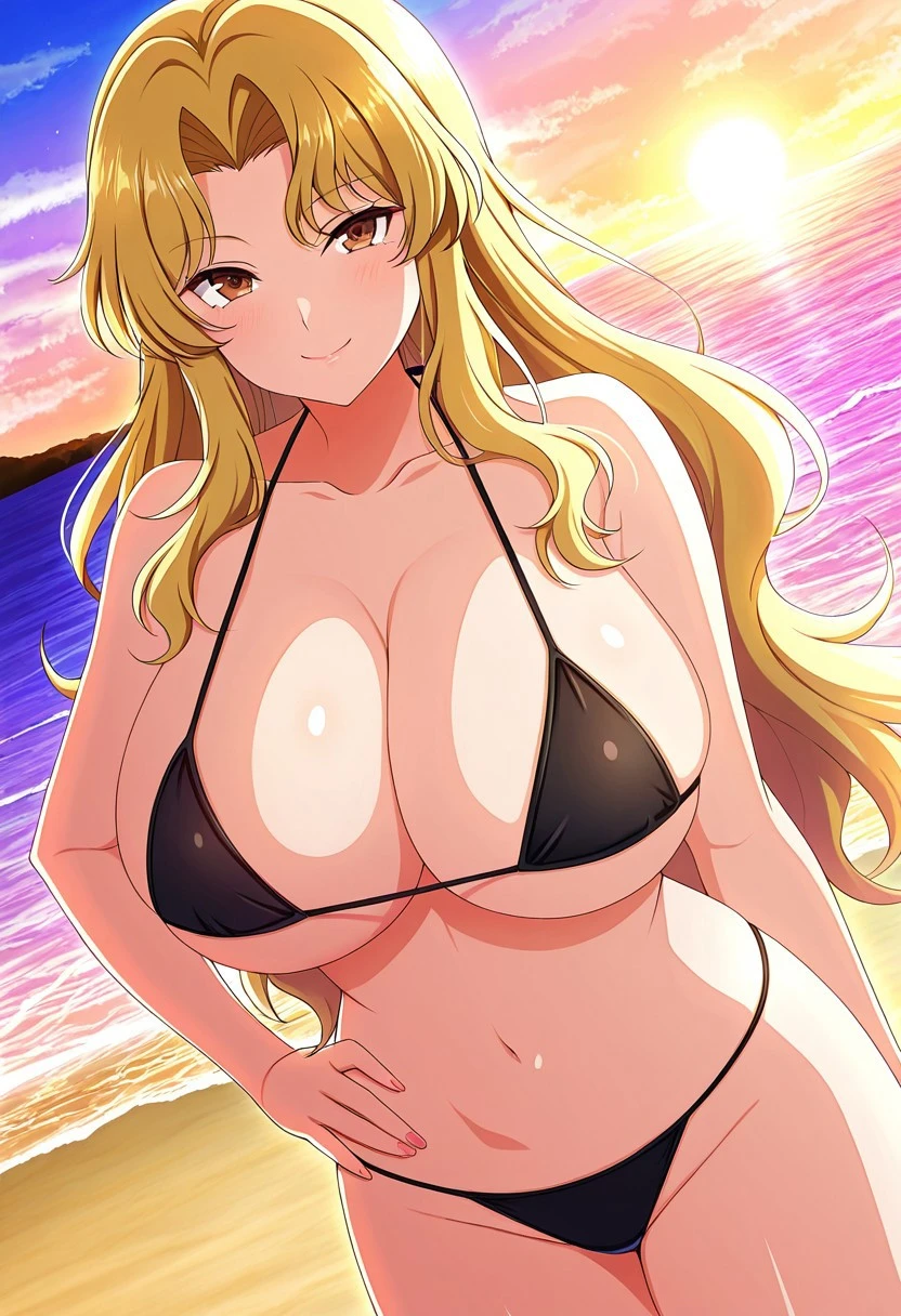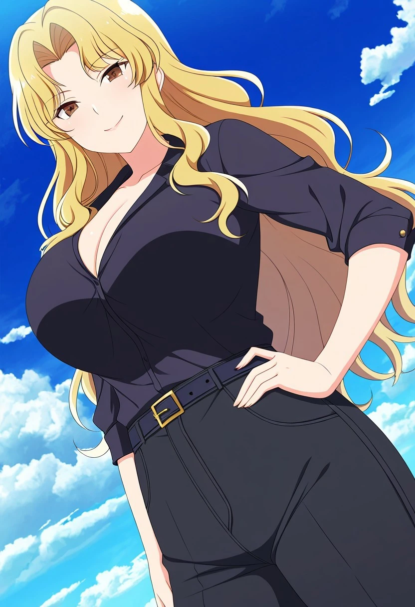 Daidōji,blonde_hair, long_hair, wavy hair, brown eyes, huge_breasts,