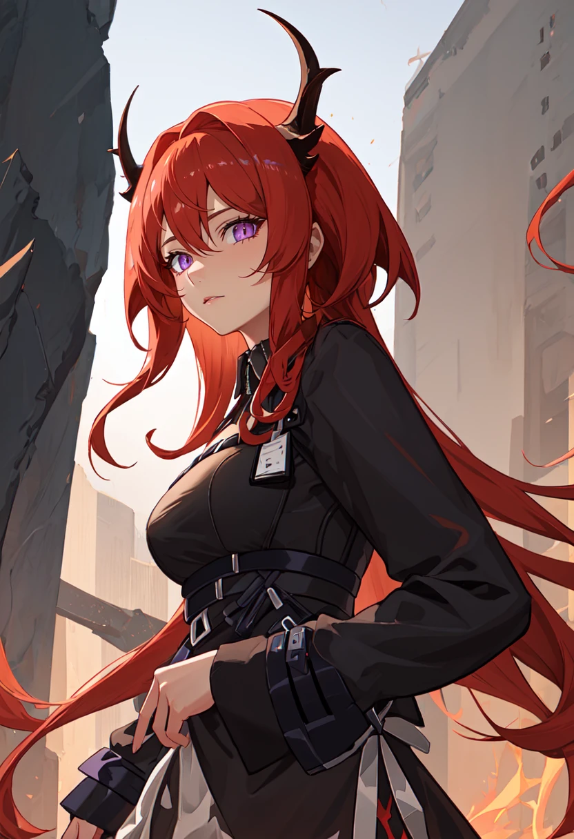 The trigger word is surtr_arknights, and the pruned tags are red_hair, horns, long_hair, purple_eyes, breasts, very_long_hair, hair_between_eyes, demon_horns, medium_breasts. When some features (e.g. hair color) are not so stable at some times, you can add these them into your prompt.