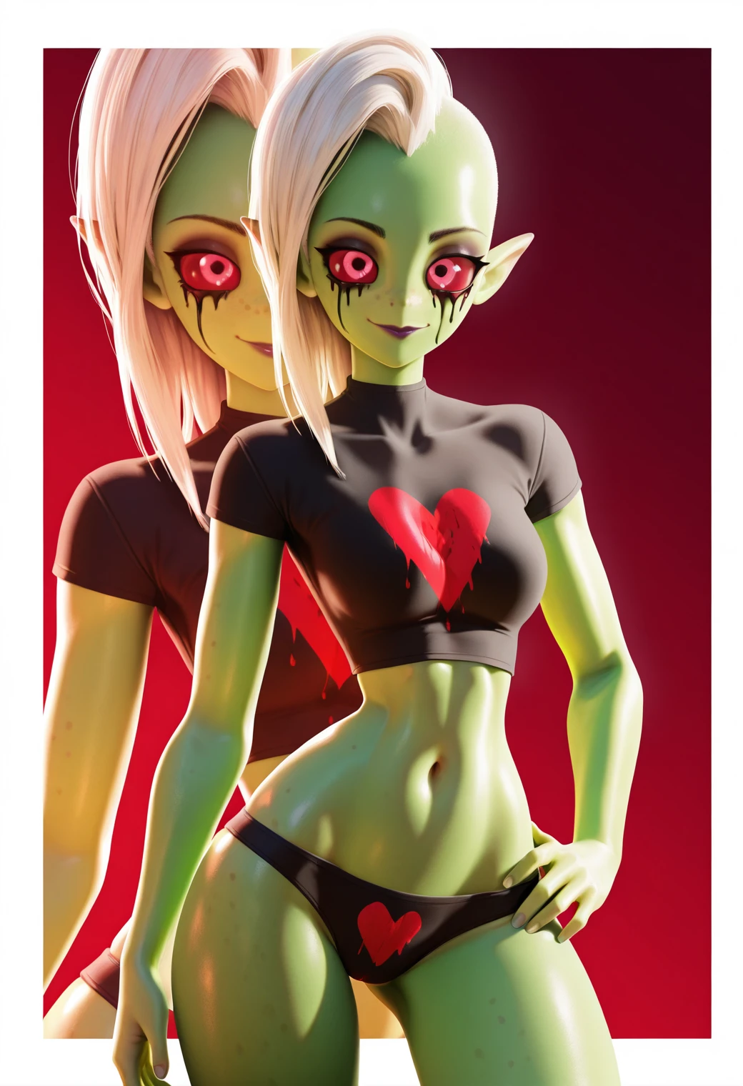 Main prompts: lord dominator, green skin, white hair, pink eyes, freckles, no nose, pointy ears, black lips