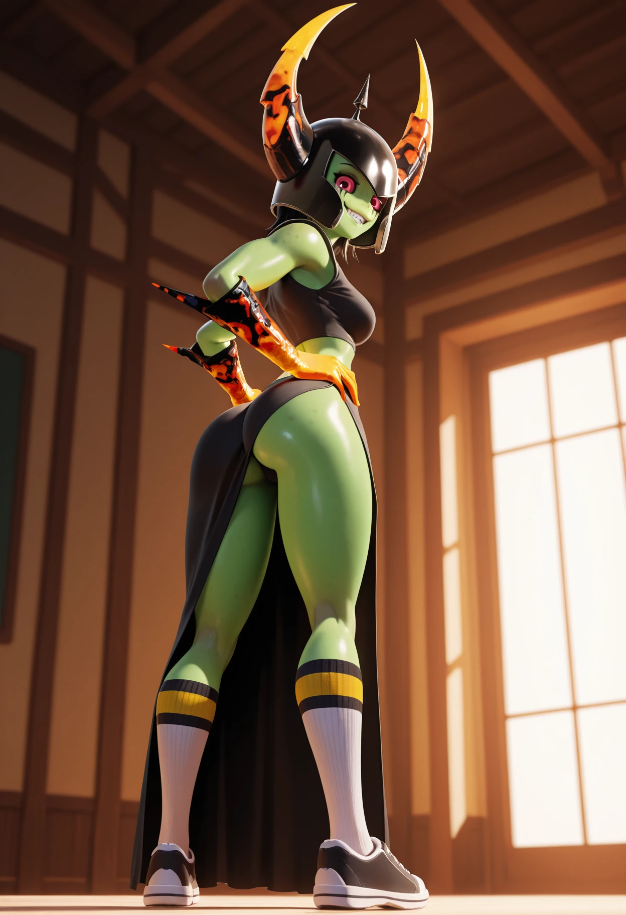 black shirt, crop top, long black skirt, side slit skirt, socks, sneakers, spiked pauldrons, horned helmet, yellow magma gloves, heart print
