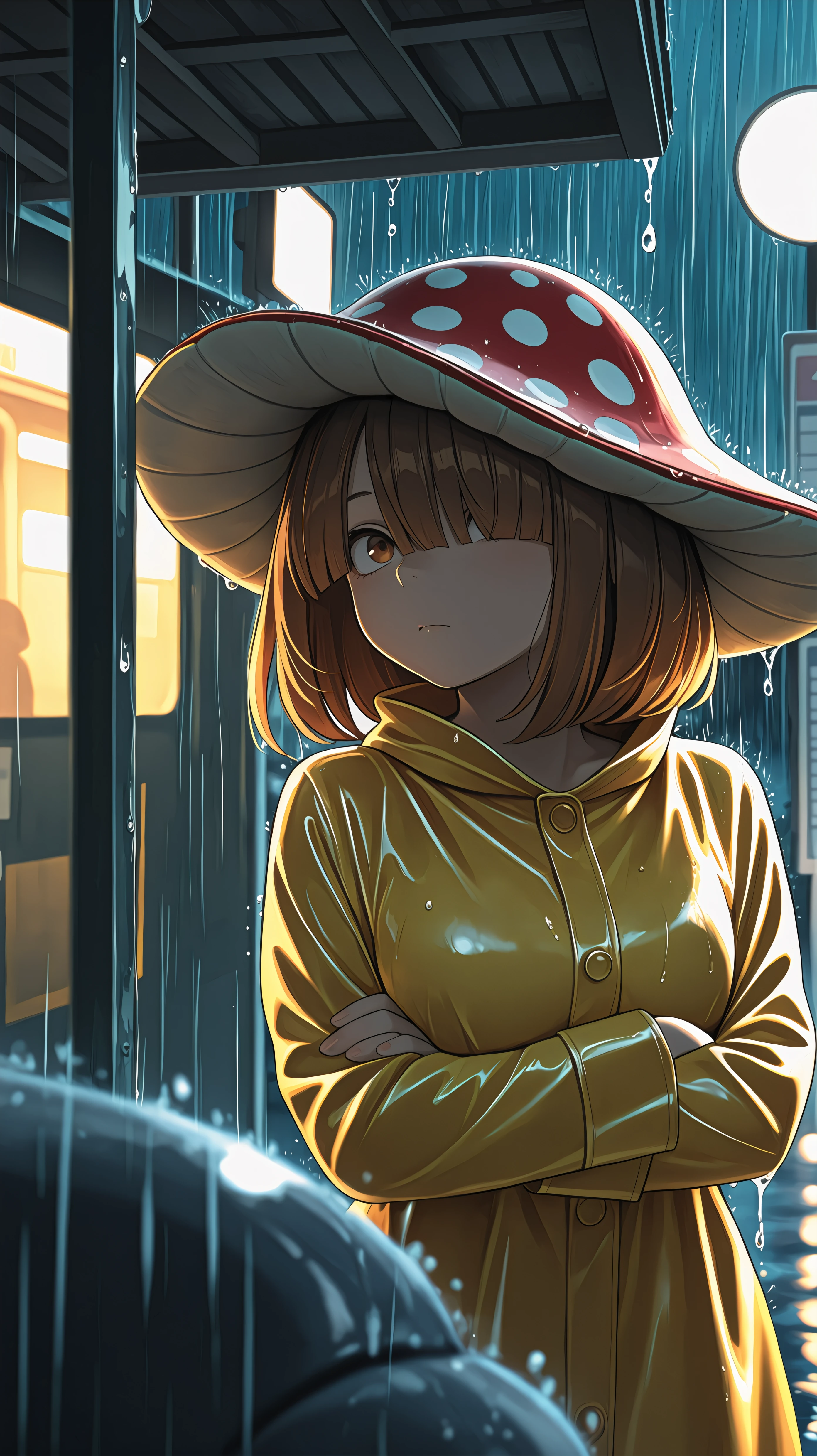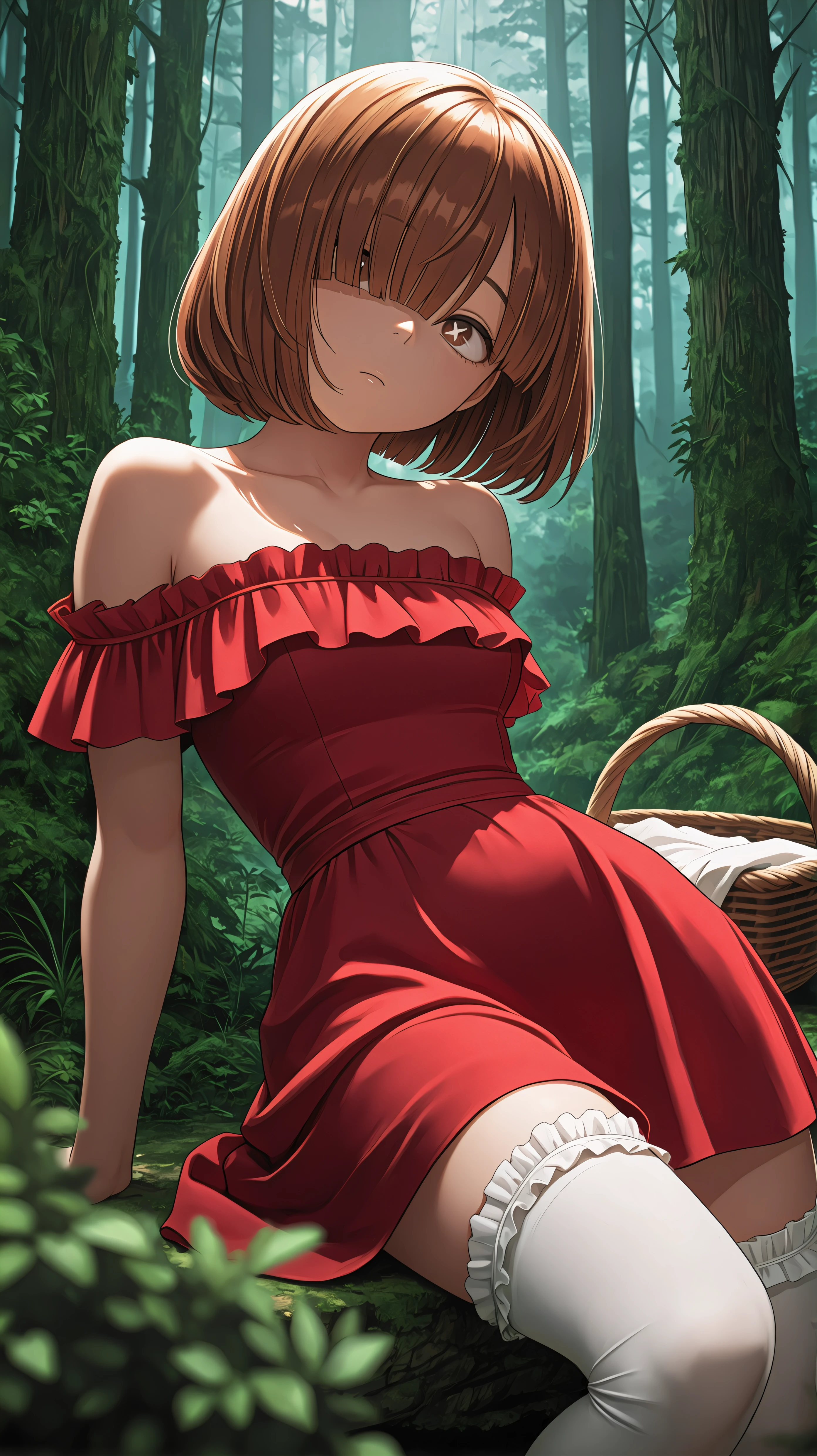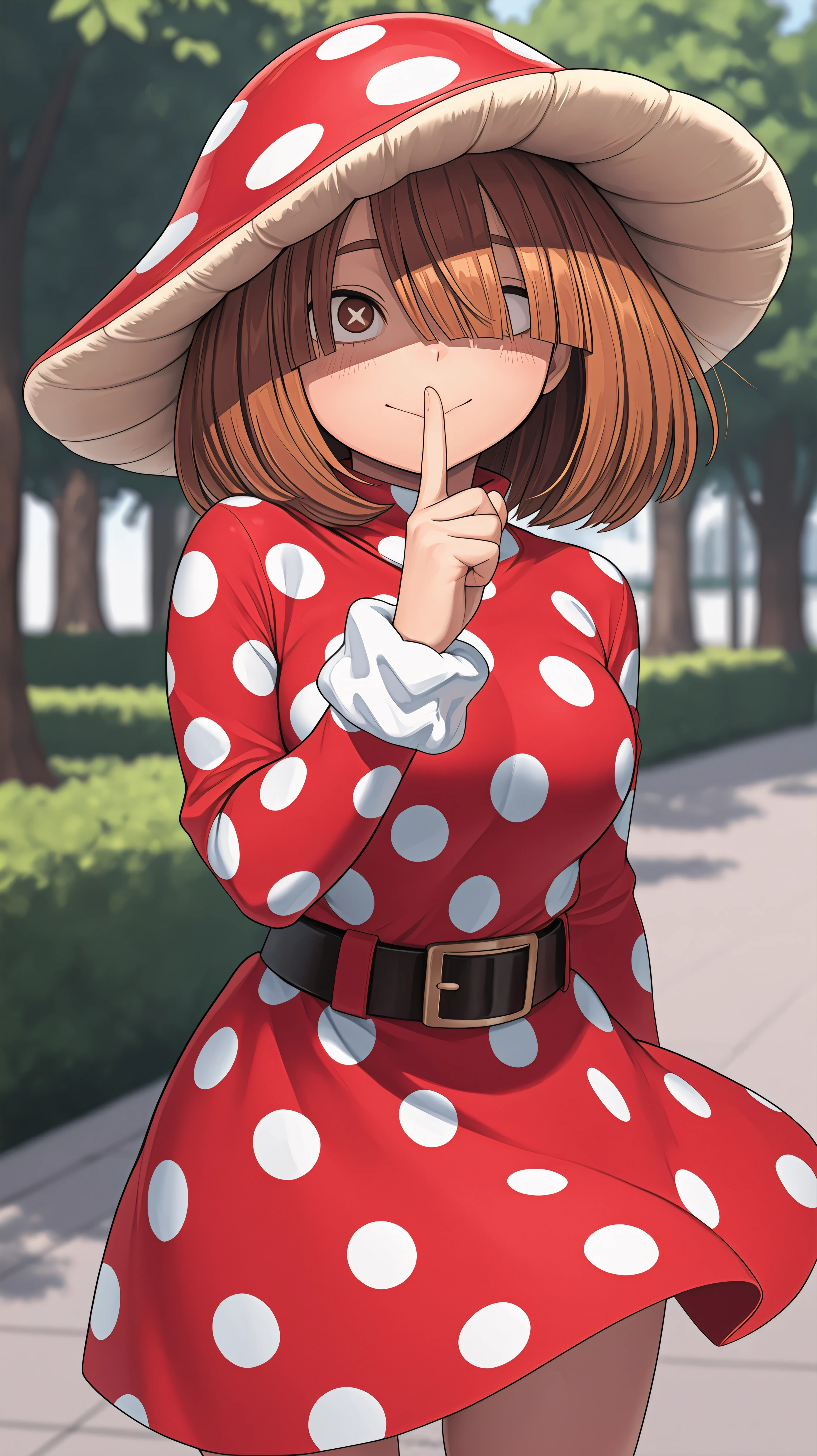 short hair, brown hair, bangs, hair covering one eye, brown eyes, mushroom cap hat, red dress, polka dot dress, black belt,Description