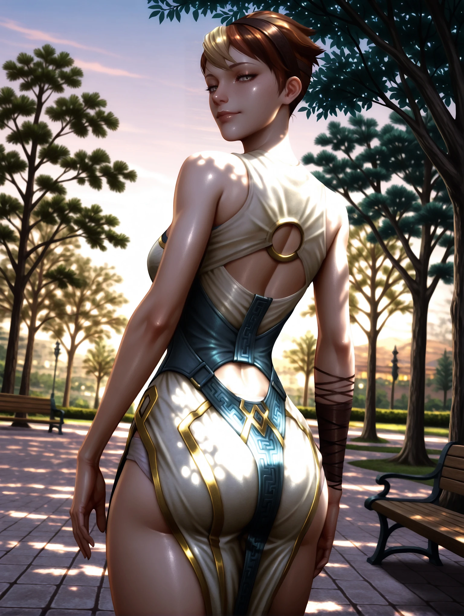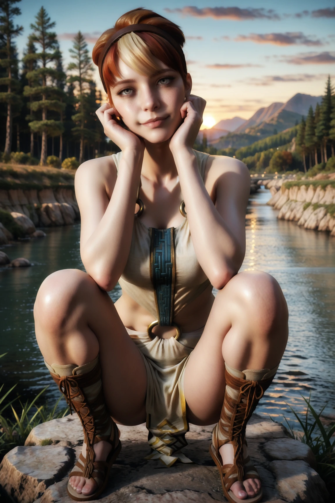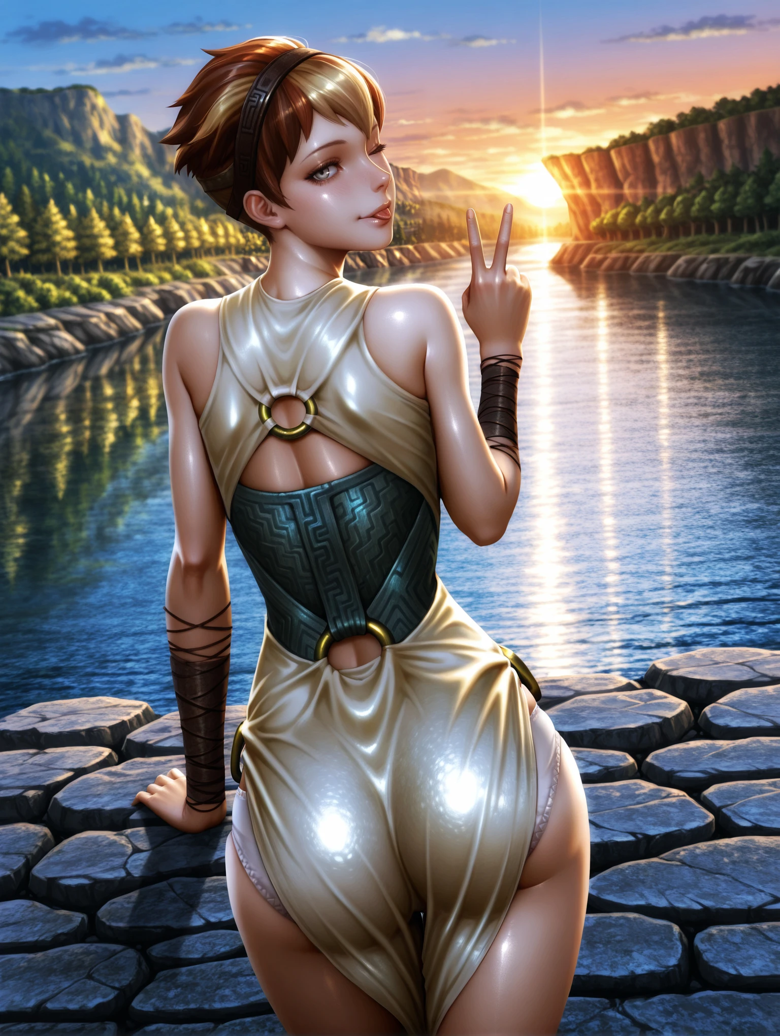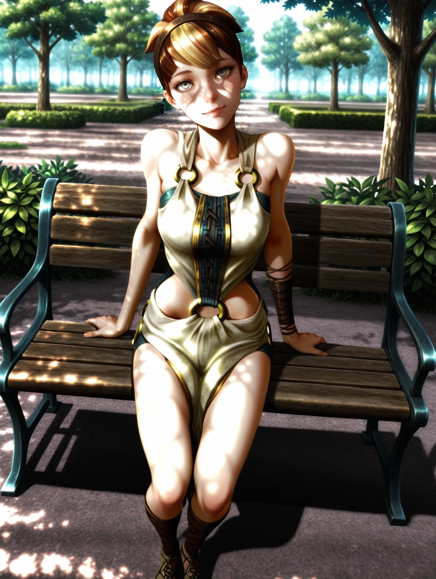 Outfit Prompts : hairband, dress, o-ring, ???? shoulders, clothing cutout, pelvic curtain, sandals, cross-laced footwear, ankle lace-up