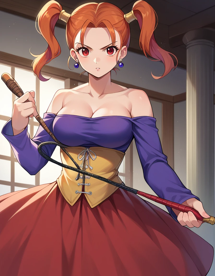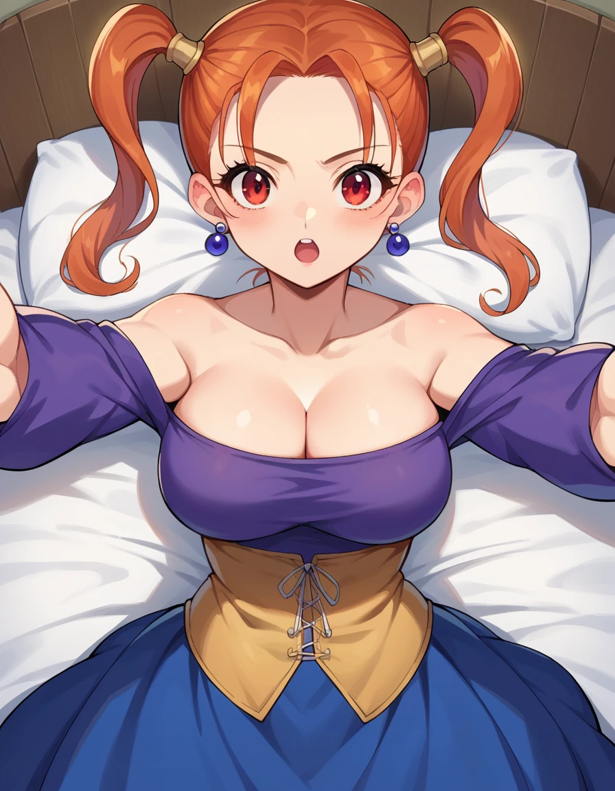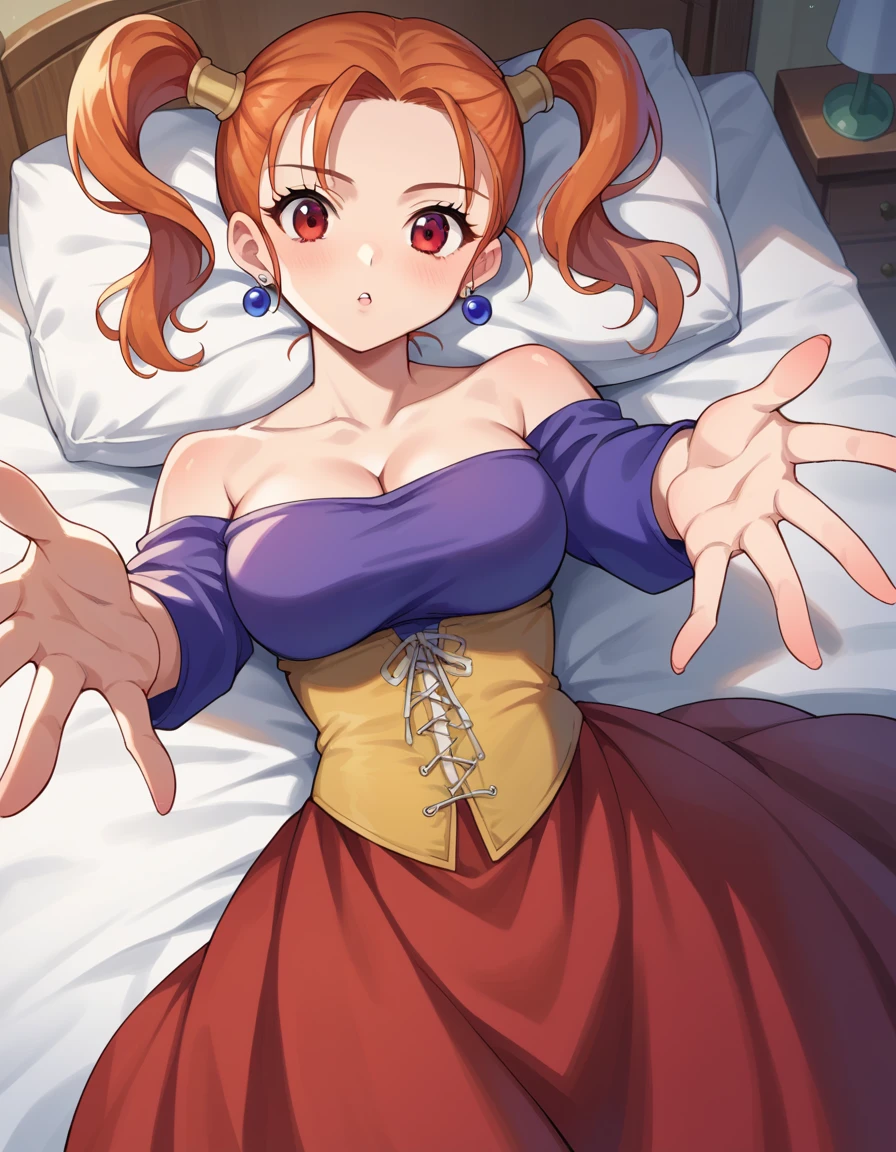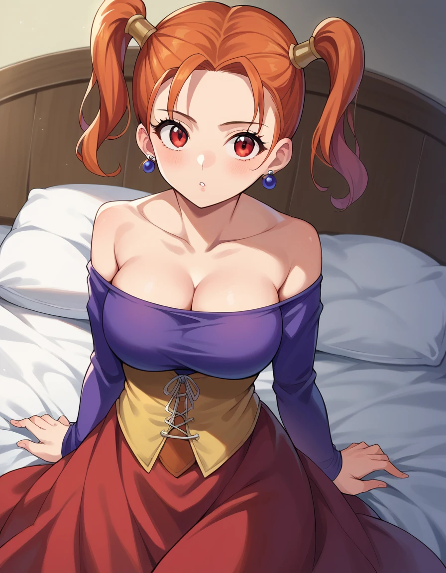 bare shoulders, cleavage, dress, earrings, jewelry, off shoulder, off-shoulder dress, purple shirt, shirt, strapless, strapless dress, corset,