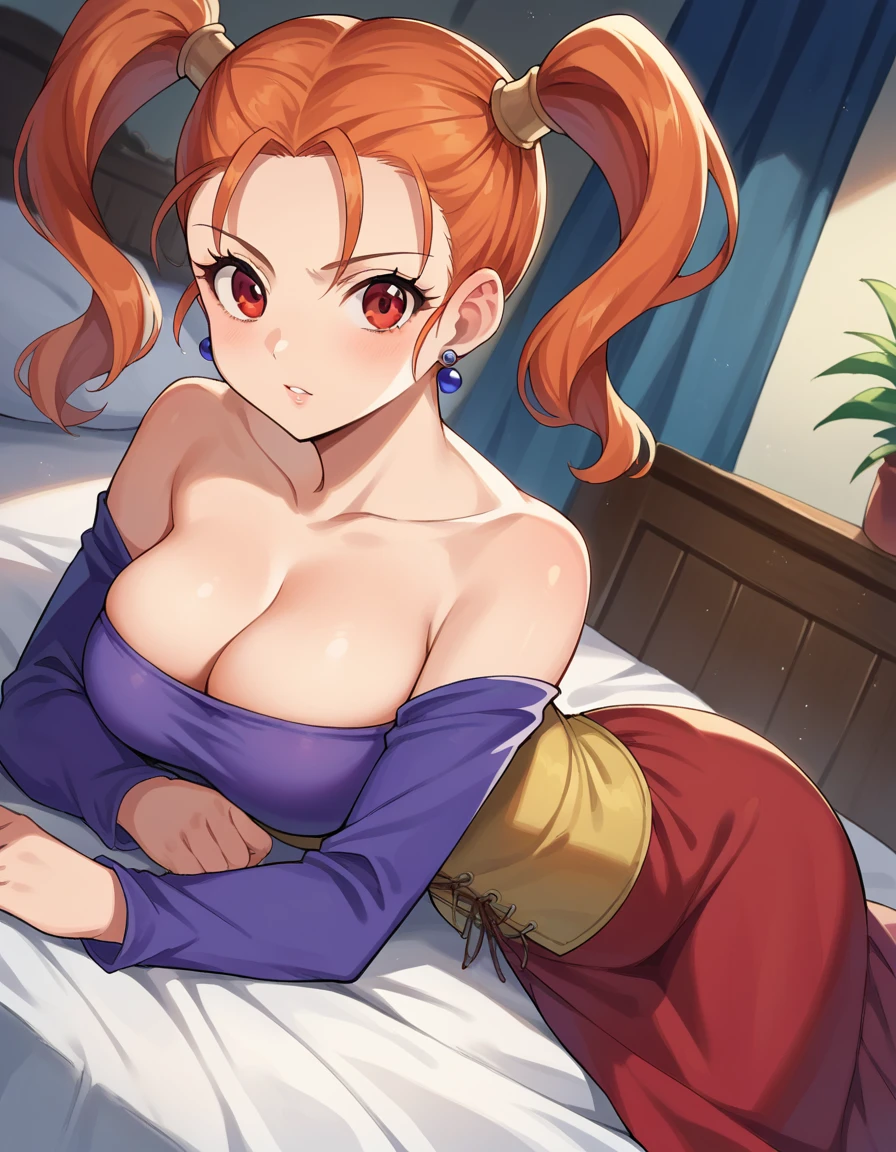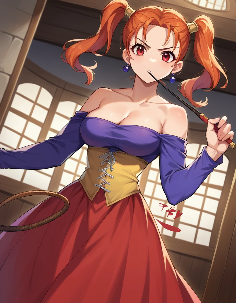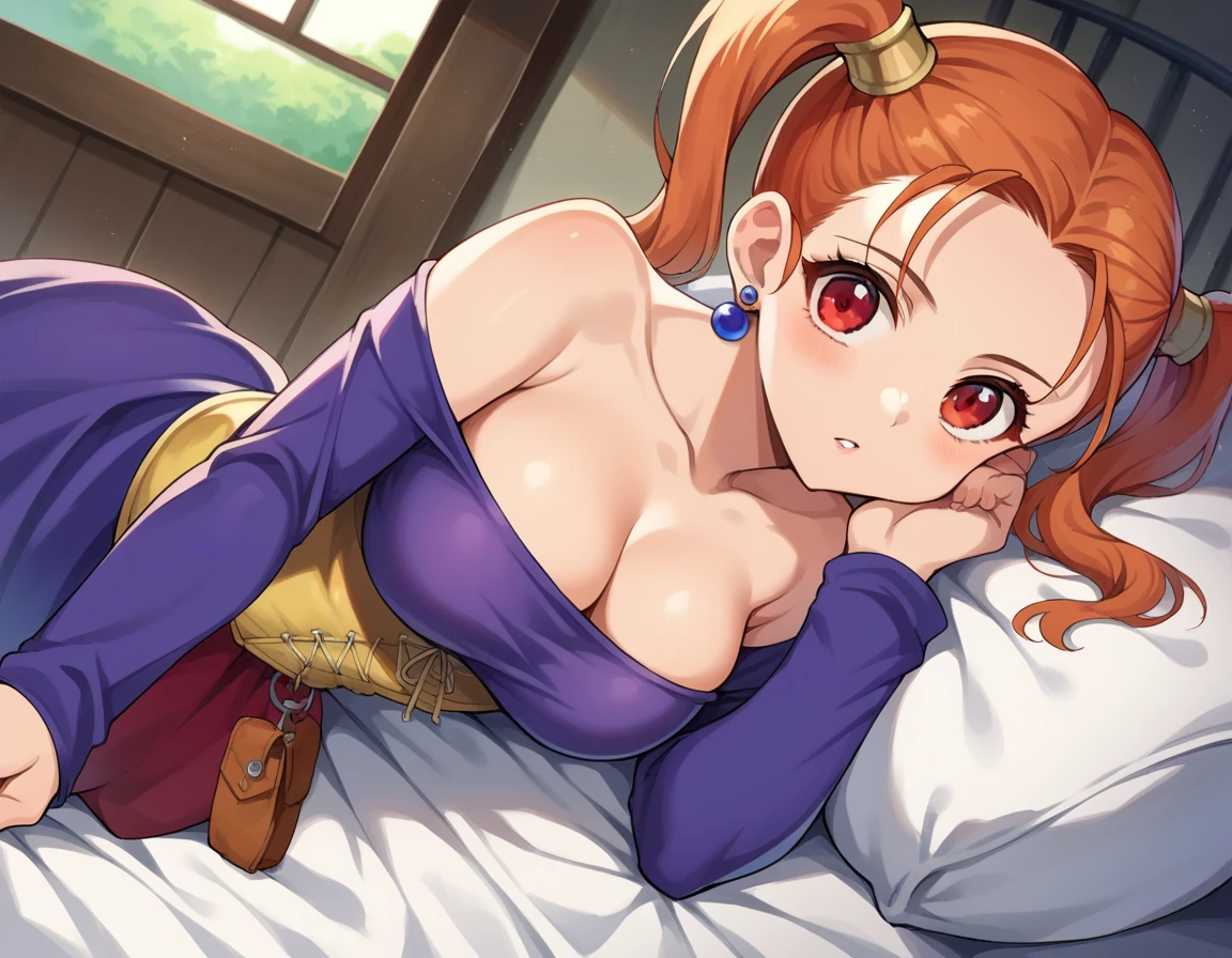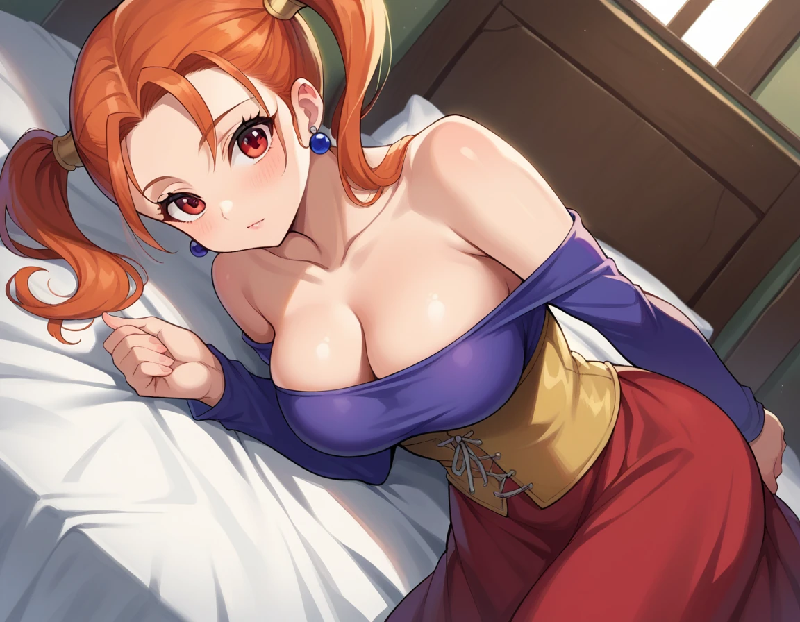 bare shoulders, cleavage, dress, earrings, jewelry, off shoulder, off-shoulder dress, purple shirt, shirt, strapless, strapless dress, corset,