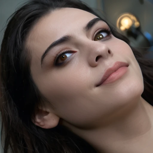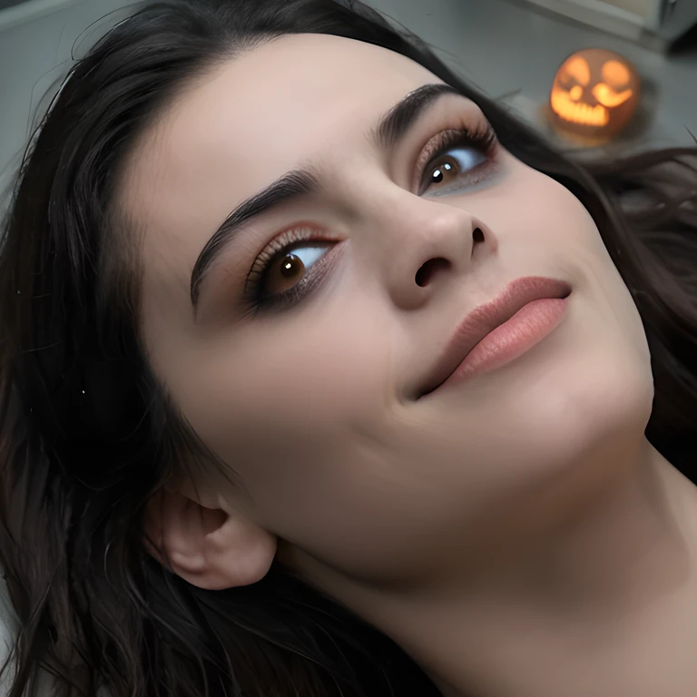 supermodel vampire girl lying ???? on an ancient altar, pale cracked skin, veins glowing under flesh, black hair fanned out, cinematic spotlight, gothic horror vibes, undead and beautiful, lips slightly parted, brown eyes locked on the viewer, ?????? horror, evil goddess, hyperreal render