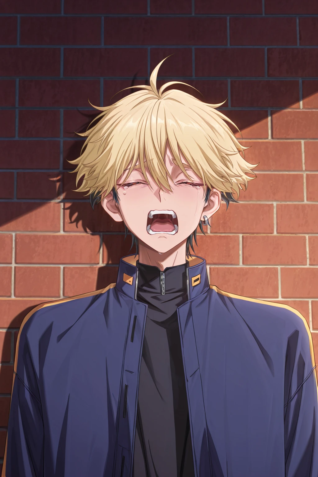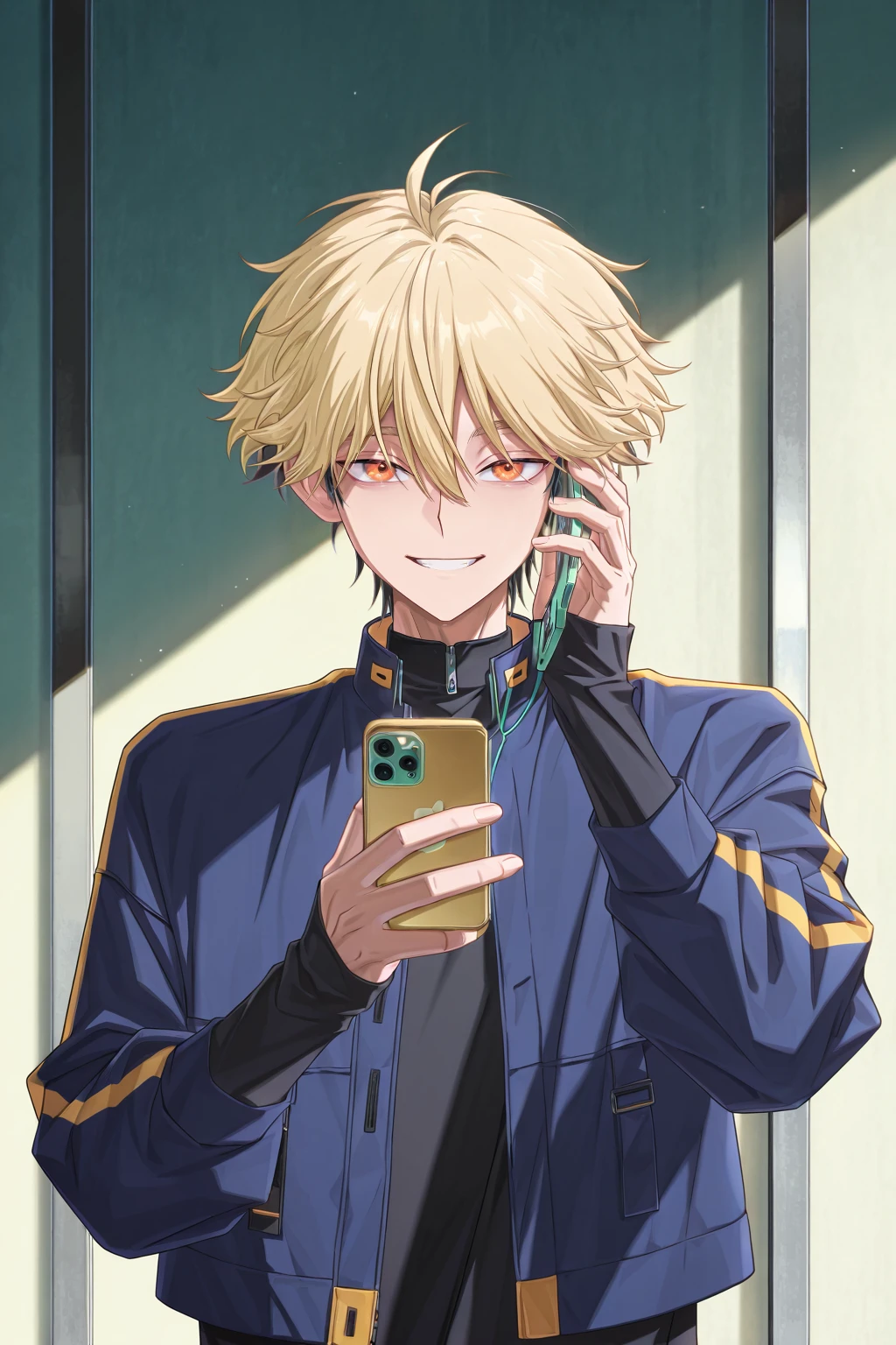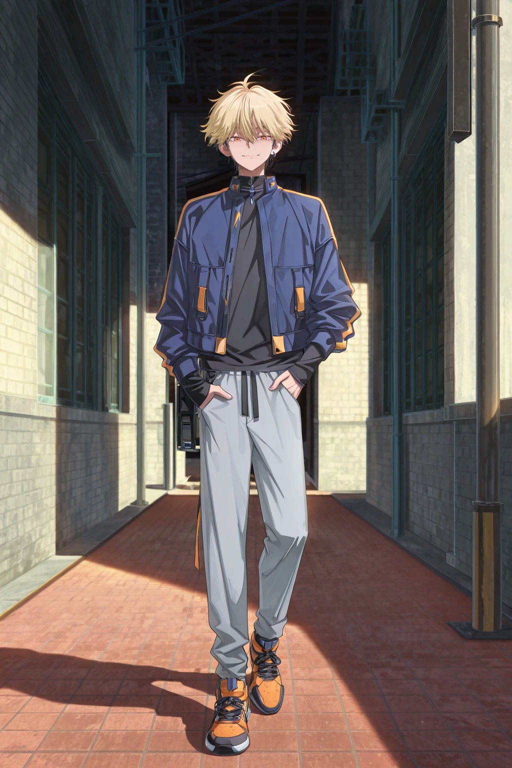 - blue jacket, black shirt, grey pants, earrings, orange shoes,