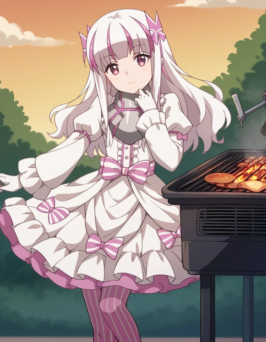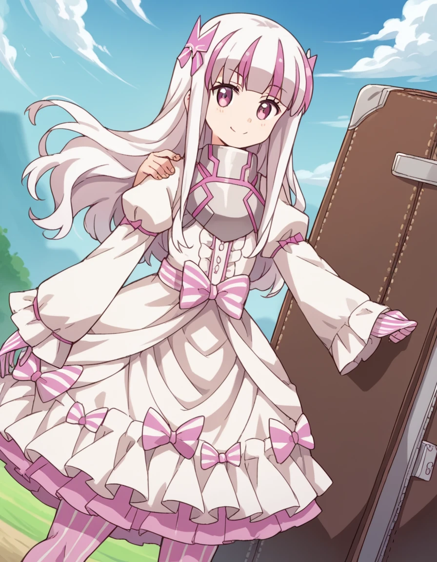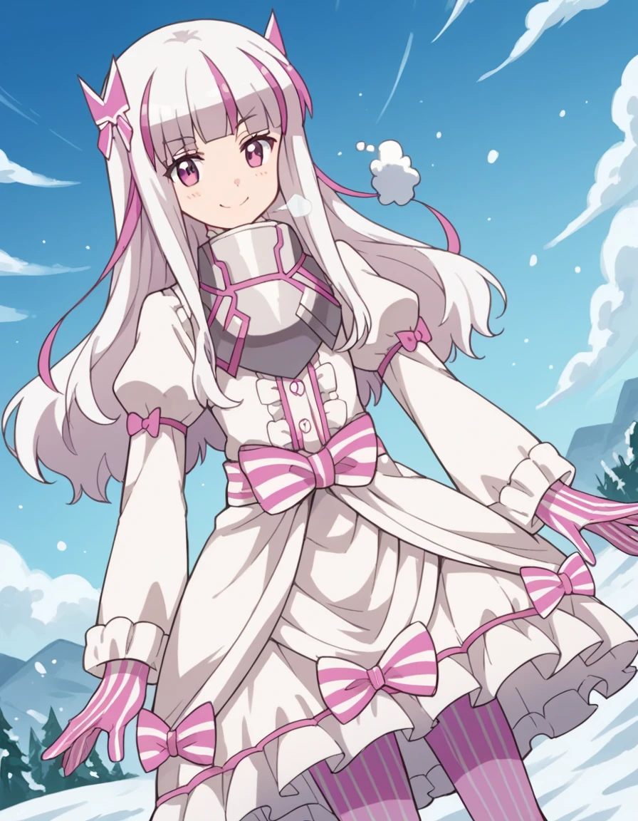 <lora:bofuri-yui-s2-ponyxl-lora-nochekaiser:1>, yui, long hair, hair ornament, white hair, bow, pink bow, vertical stripes, striped,
