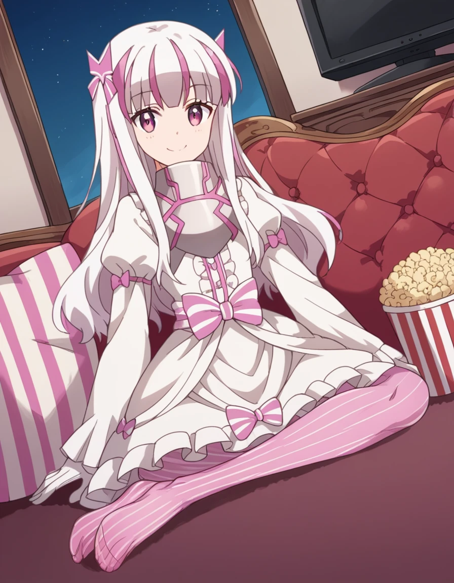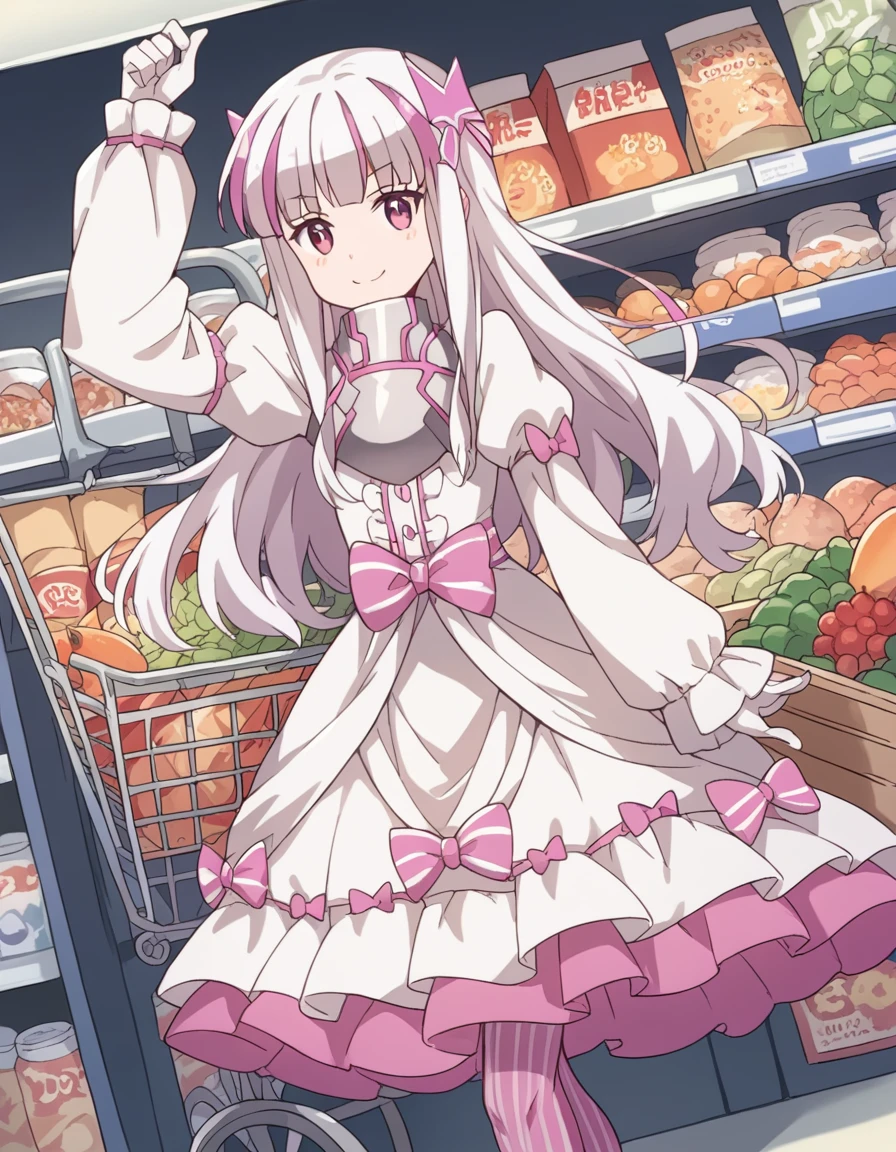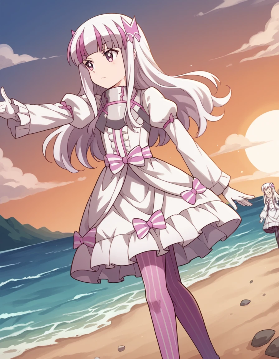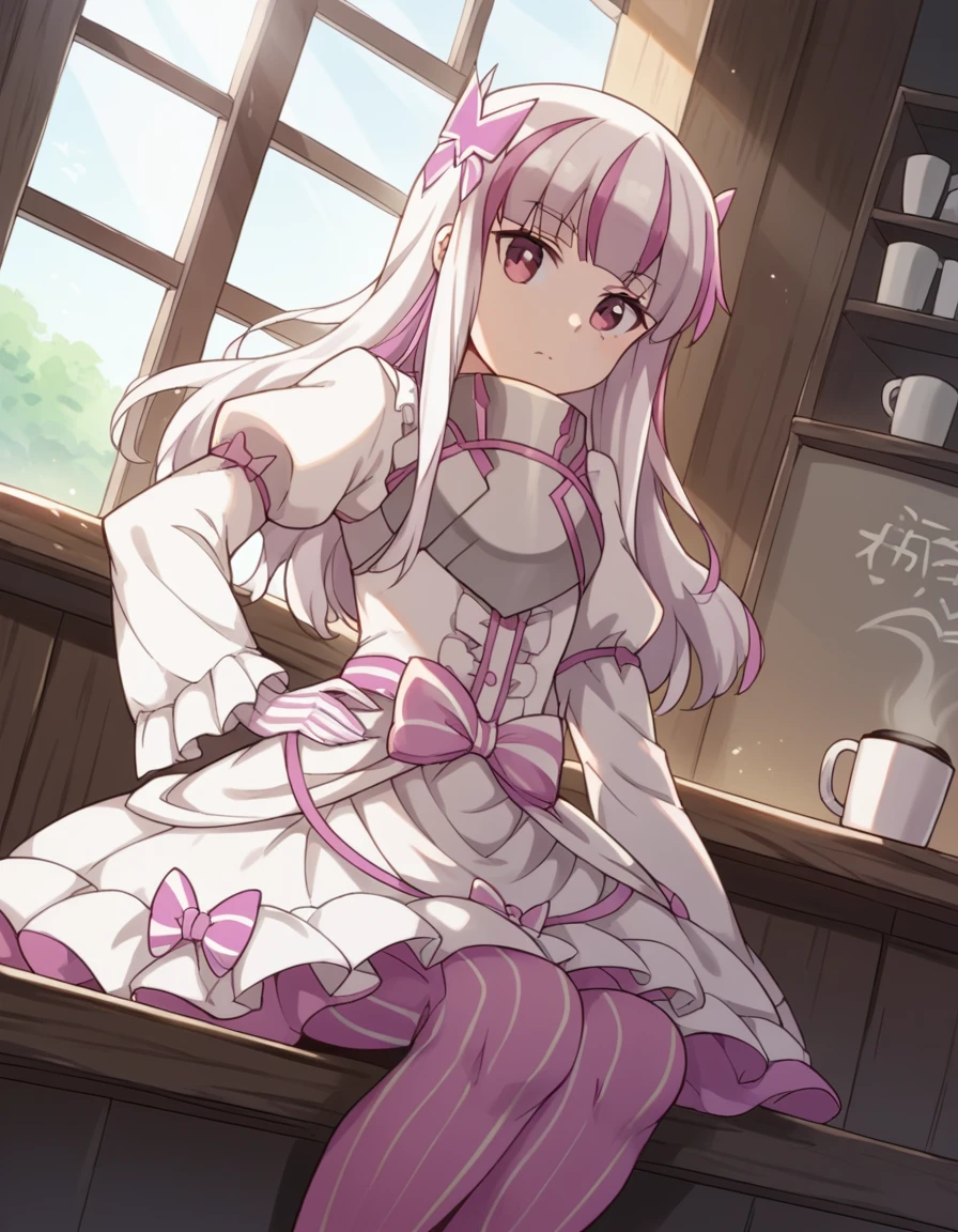 <lora:bofuri-yui-s2-ponyxl-lora-nochekaiser:1>, yui, long hair, hair ornament, white hair, bow, pink bow, vertical stripes, striped,