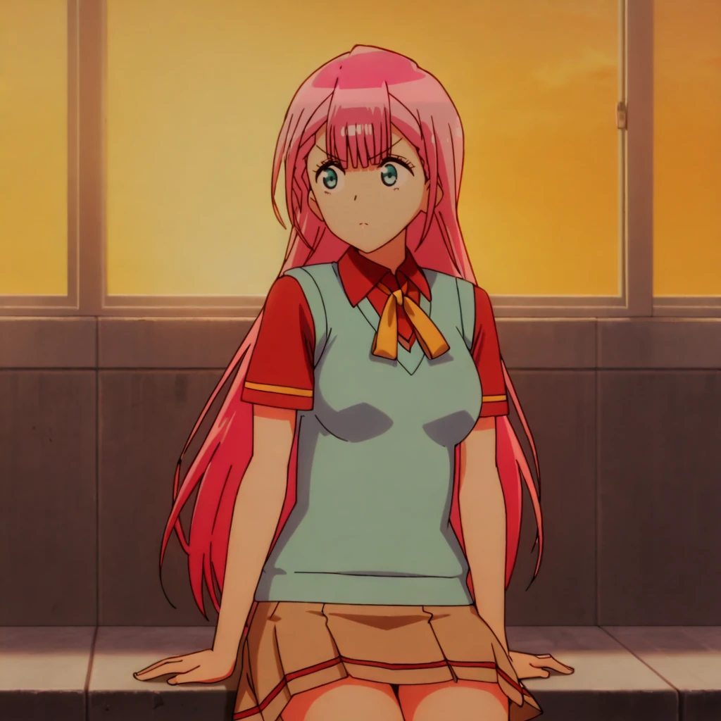 Trigger with school outfit: KirisuSchoolOutfit, 1girl, pink hair, long hair, skirt, school uniform, sweater vest, cowboy shot