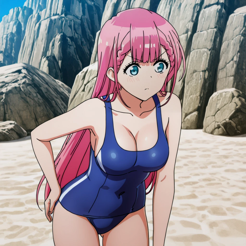 Trigger with swimsuit: KirisuSwimsuit, 1girl, school swimsuit, pink hair, long hair, medium breasts, blue one-piece swimsuit, cleavage, blue eyes, bangs, collarbone, braid