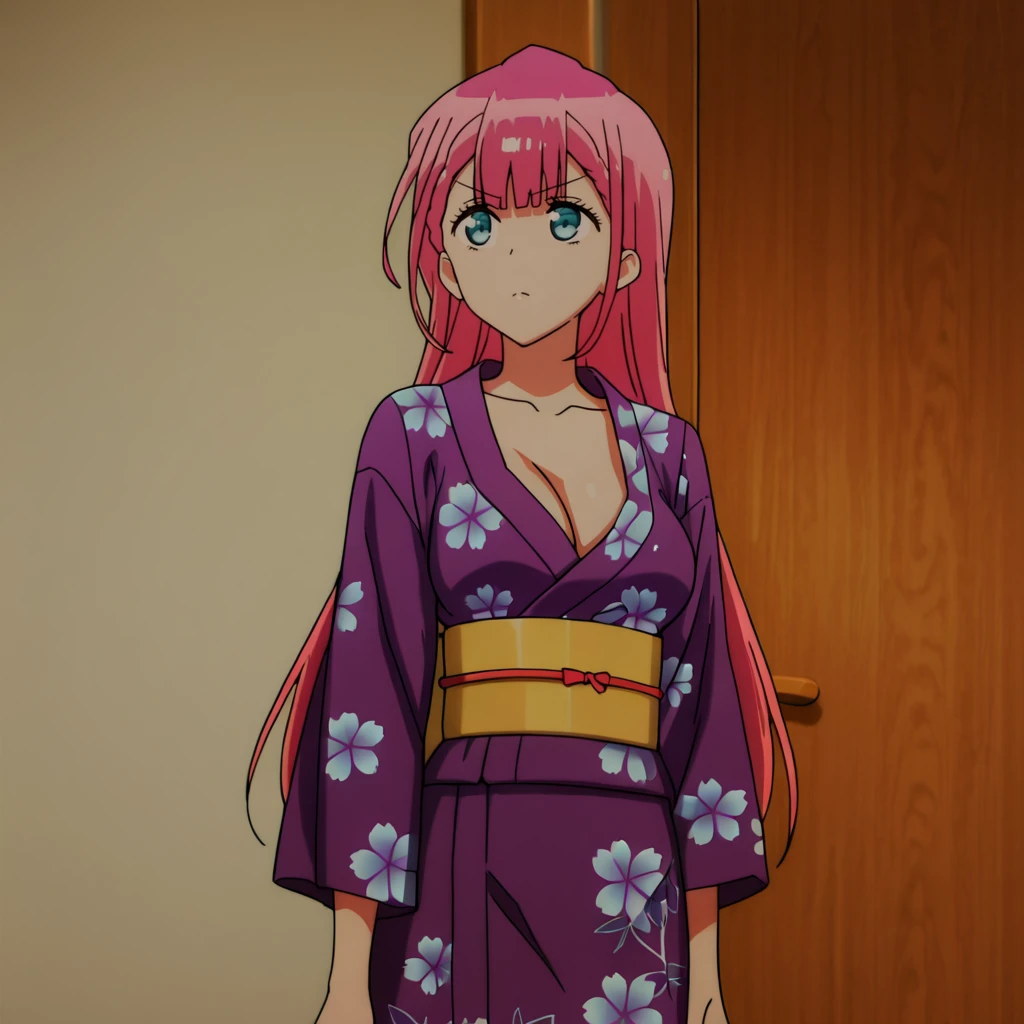 Trigger with kimino: KirisuKimino, 1girl, japanese clothes, medium breasts, purple kimono, long hair, cleavage, pink hair, yukata, sash, floral print, blue eyes, obi, collarbone, cowboy shot