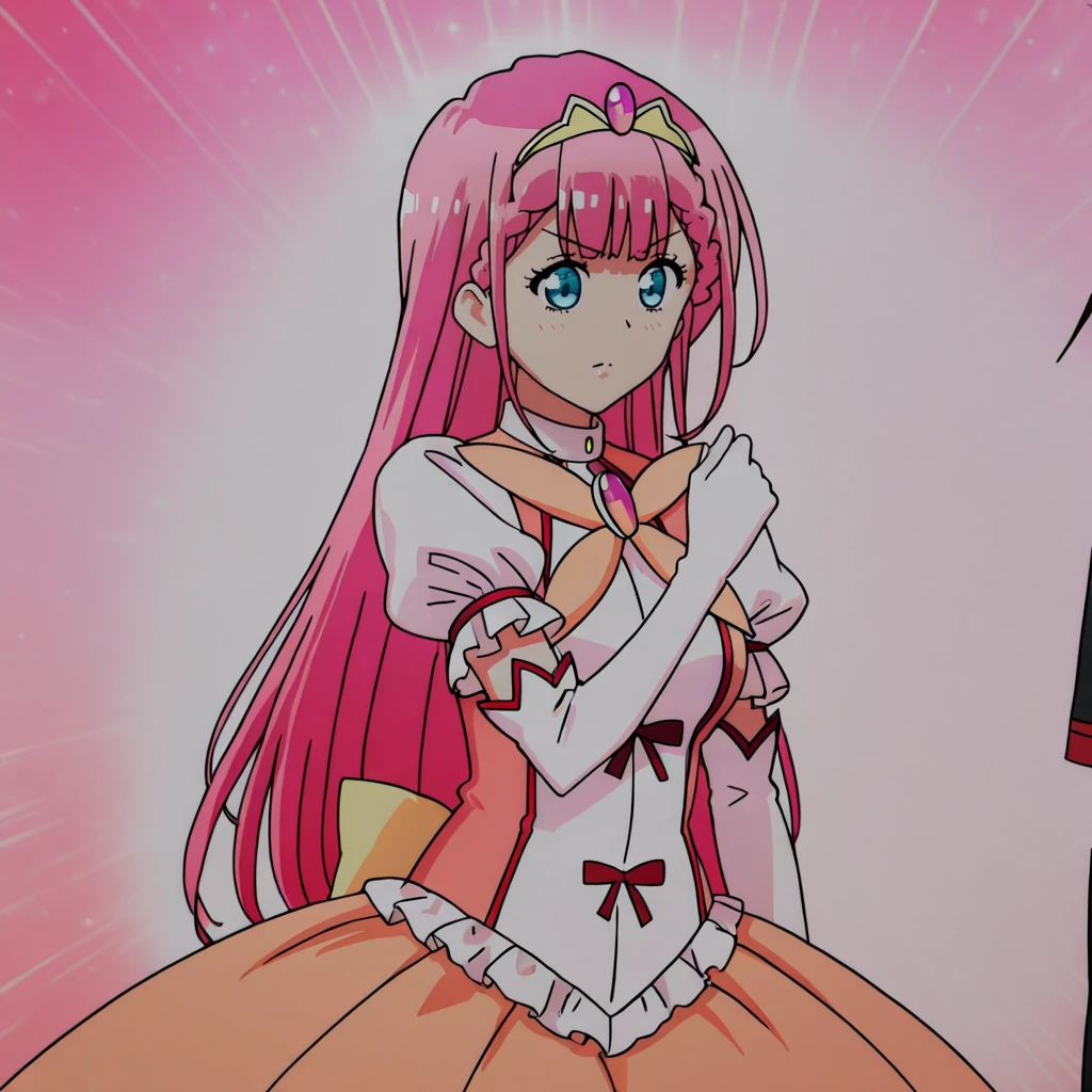 Trigger with magical girl outfit: KirisuMagicalGirl, pink hair, 1girl, elbow gloves, blue eyes, long hair, tiara, skirt, braid, magical girl, dress