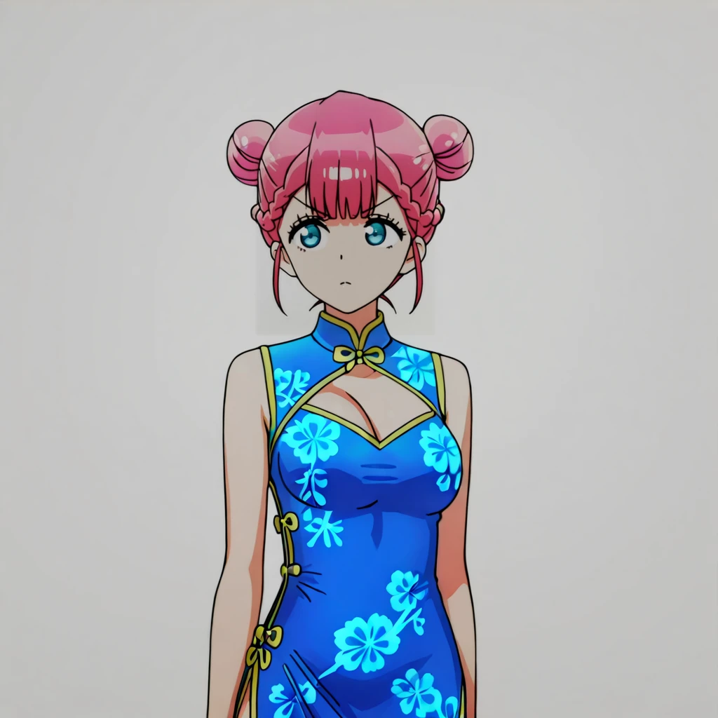 Trigger with chinese outfit: KirisuChineseOutfit, pink hair, hair bun, double bun, medium breasts, braid, 1girl, blue eyes, cleavage cutout, chinese clothes, china dress, sleeveless, short hair, blue dress, clothing cutout, cowboy shot