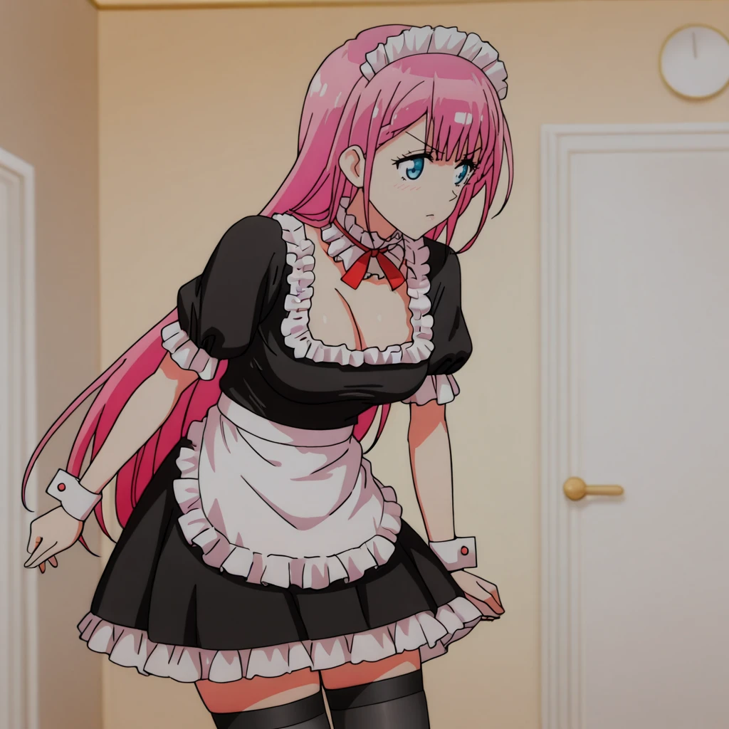 Trigger with maid: KirisuMaid, 1girl, pink hair, maid headdress, long hair, medium breasts, black thighhighs, blue eyes, cleavage, maid apron, frills, wrist cuffs, enmaided, dress, cowboy shot