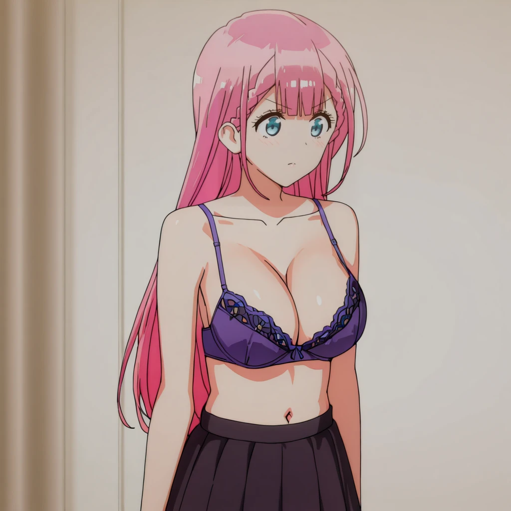 Trigger with bra: KirisuBra, 1 girl, solo, pink hair, underwear, purple bra, long hair, navel, skirt, large breasts, cleavage, blue eyes, collarbone, shiny hair, braid, cowboy shot