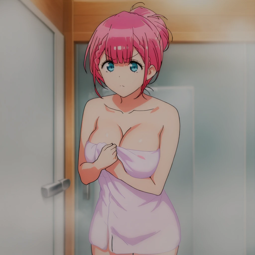 Trigger with hair tied outfit: KirisuHairTied, 1girl, ????? towel, pink hair, large breasts, cleavage, blue eyes, short hair, collarbone, braid, cowboy shot