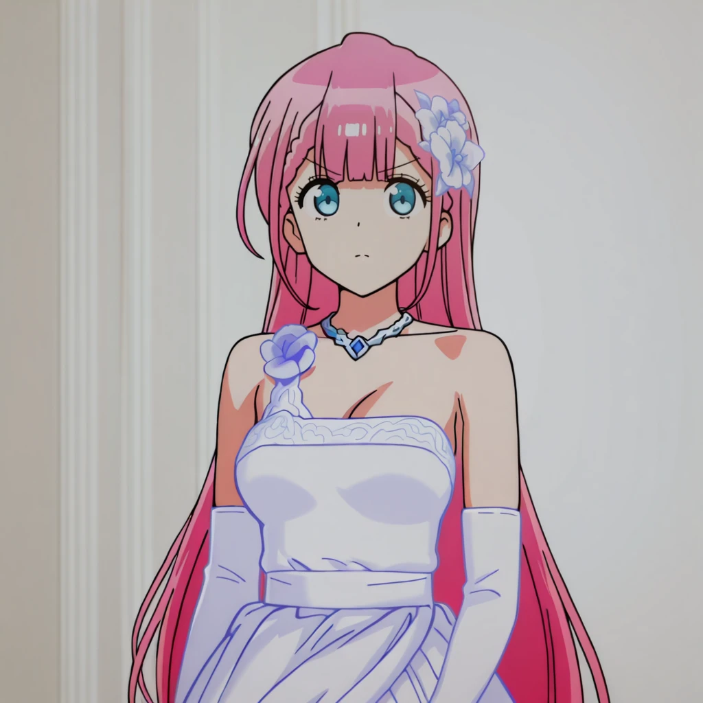 Trigger with wedding outfit: KirisuWedding, 1girl, wedding dress, pink hair, long hair, elbow gloves, hair ornament, necklace, blue eyes, jewelry, white dress, hair flower, medium breasts, bare shoulders