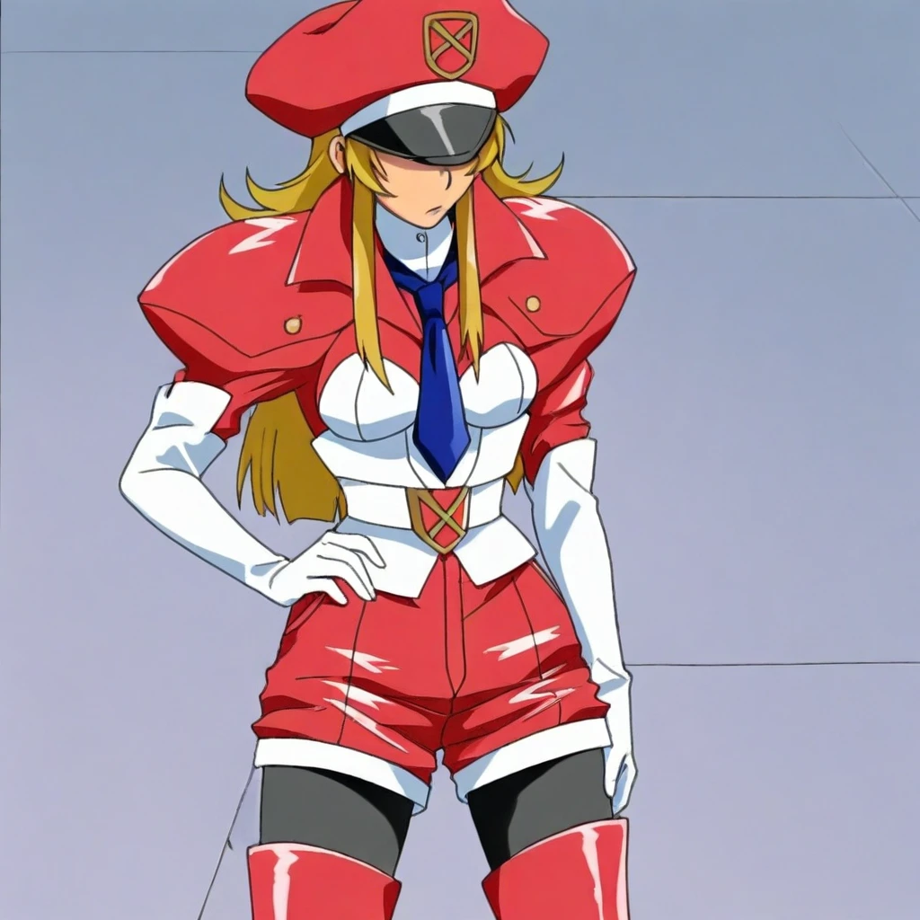 peaked hat, jacket, puffy shoulders, blue necktie, white bustier, white elbow gloves, belt, shorts, black pantyhose, thigh boots,